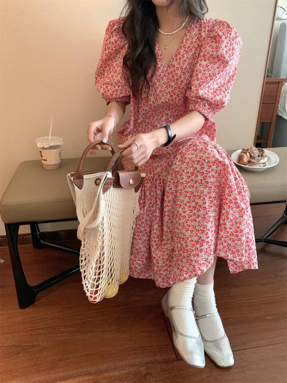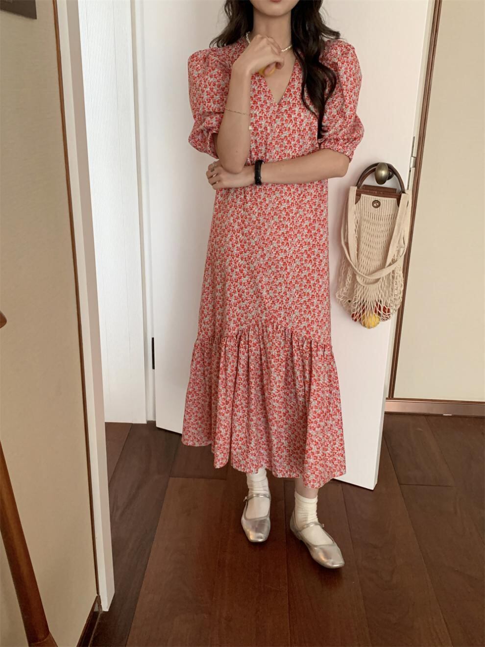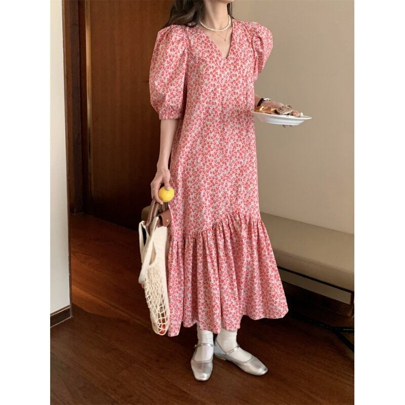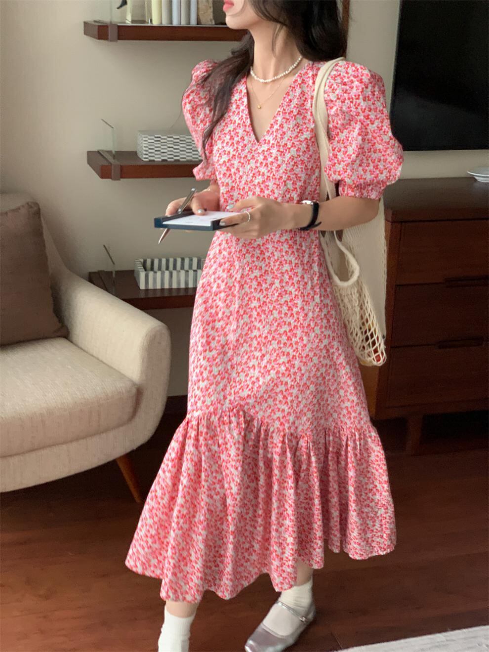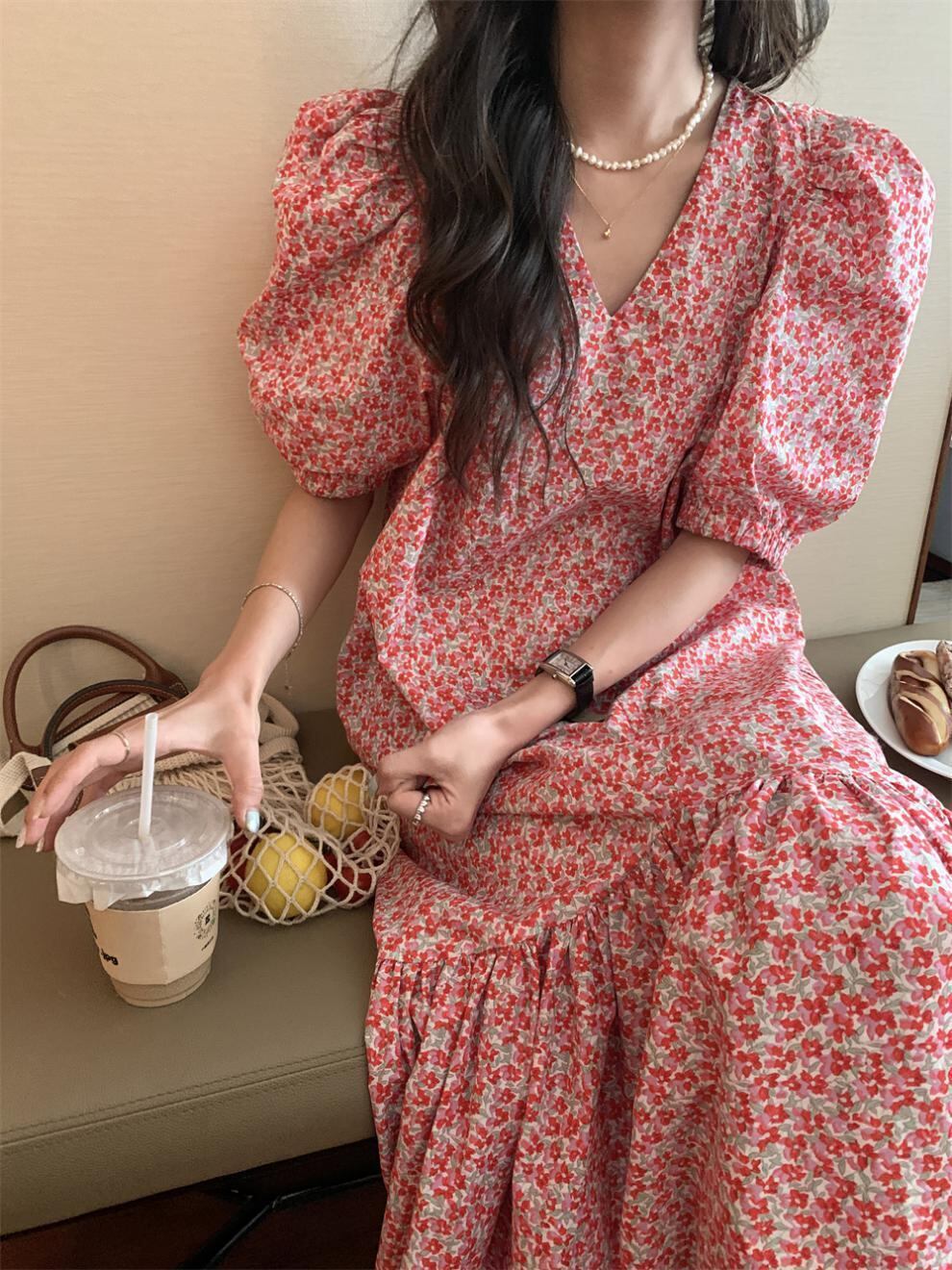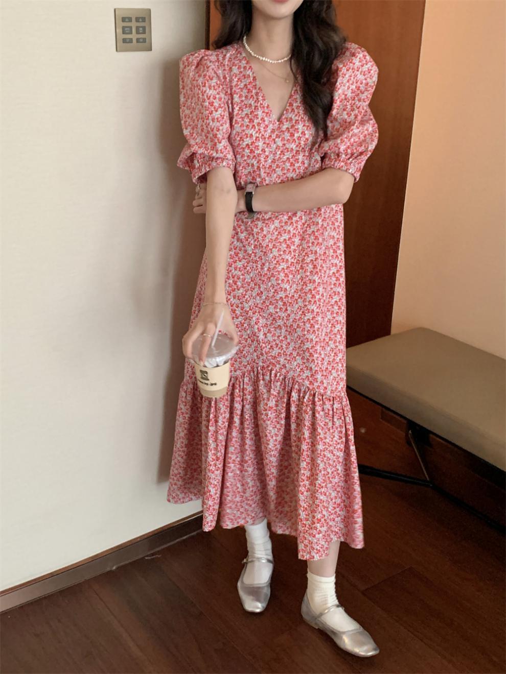 華やかな小花柄が目を引く、パフスリーブのVネックロングワンピース。