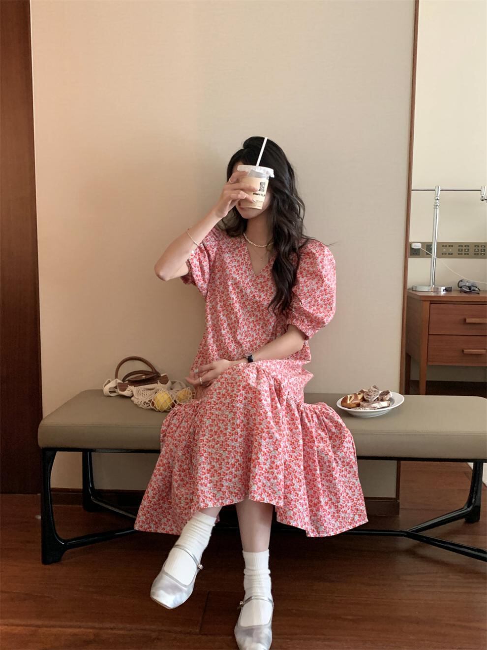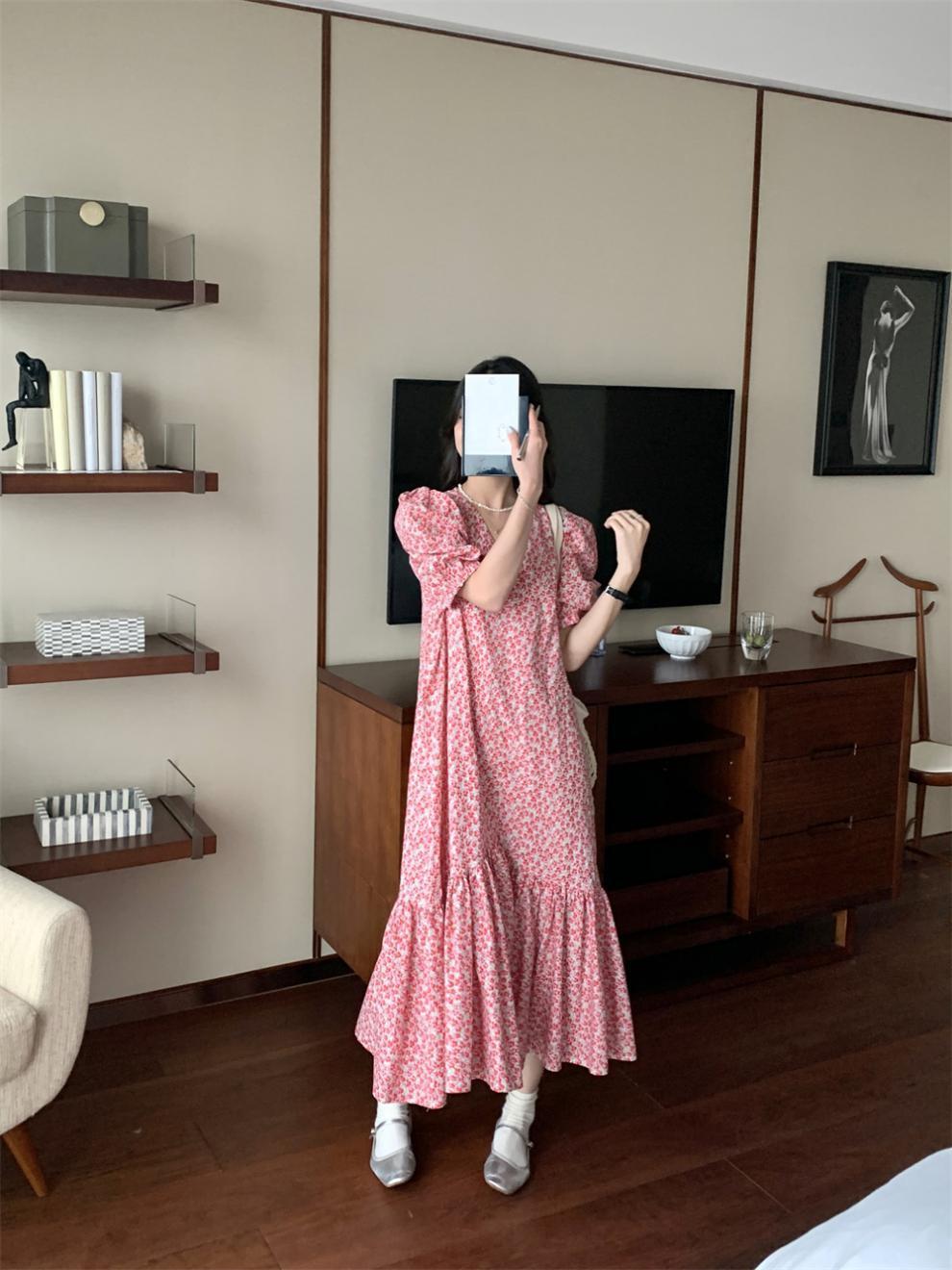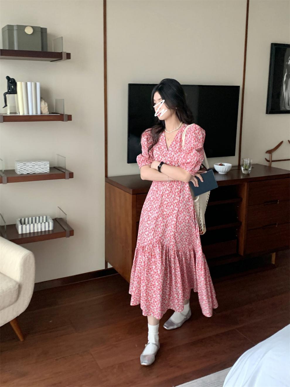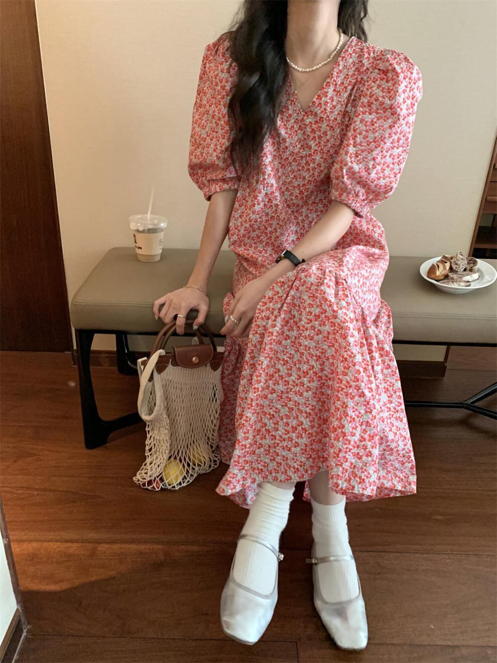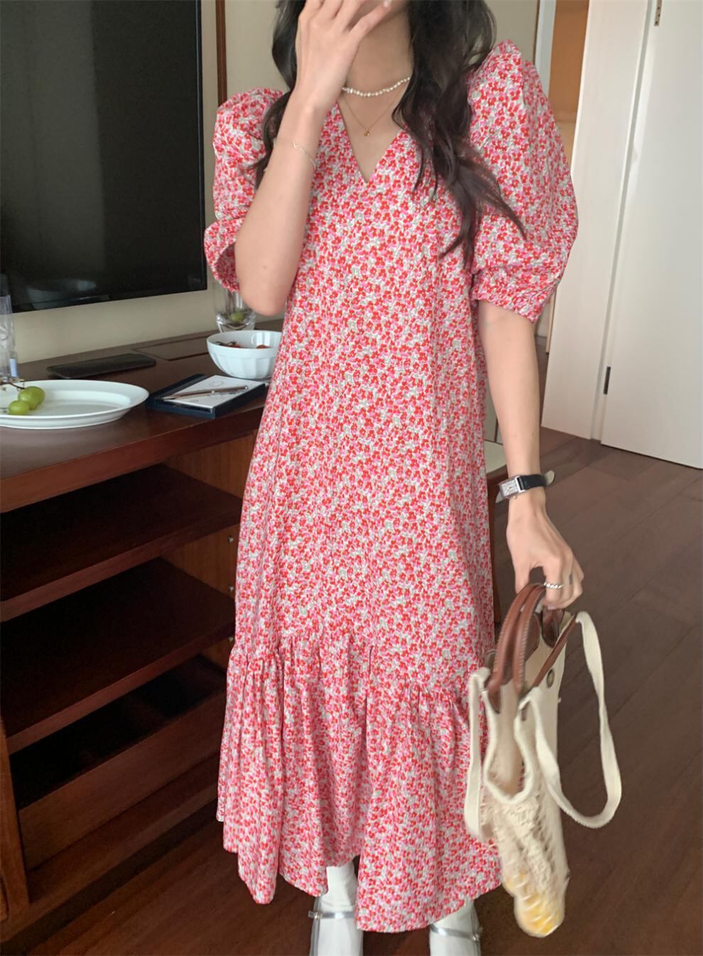 華やかな小花柄が目を引く、パフスリーブのVネックロングワンピース。