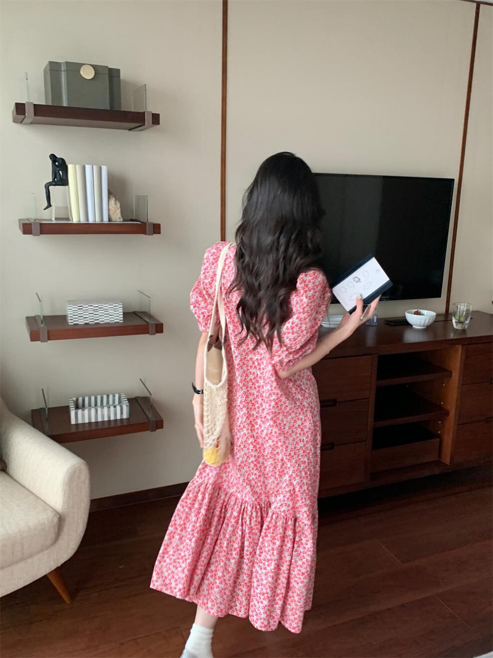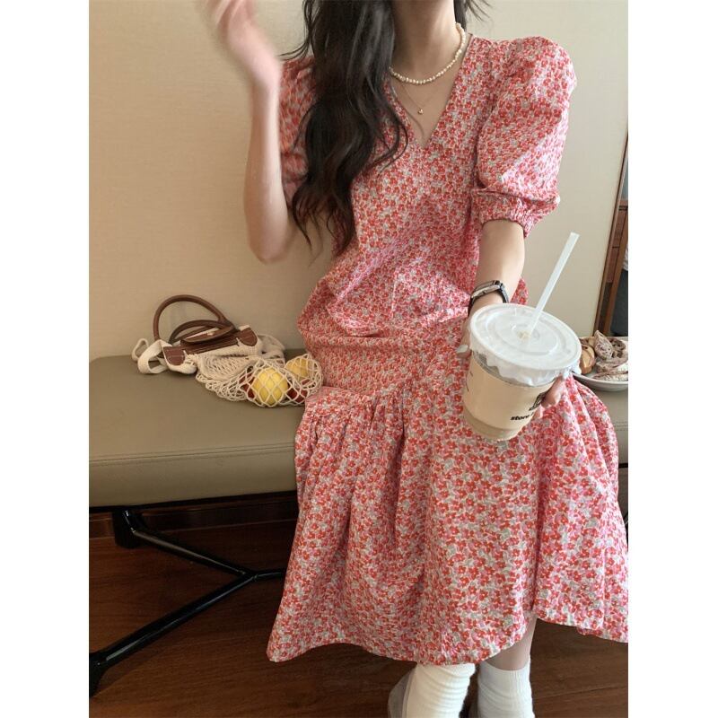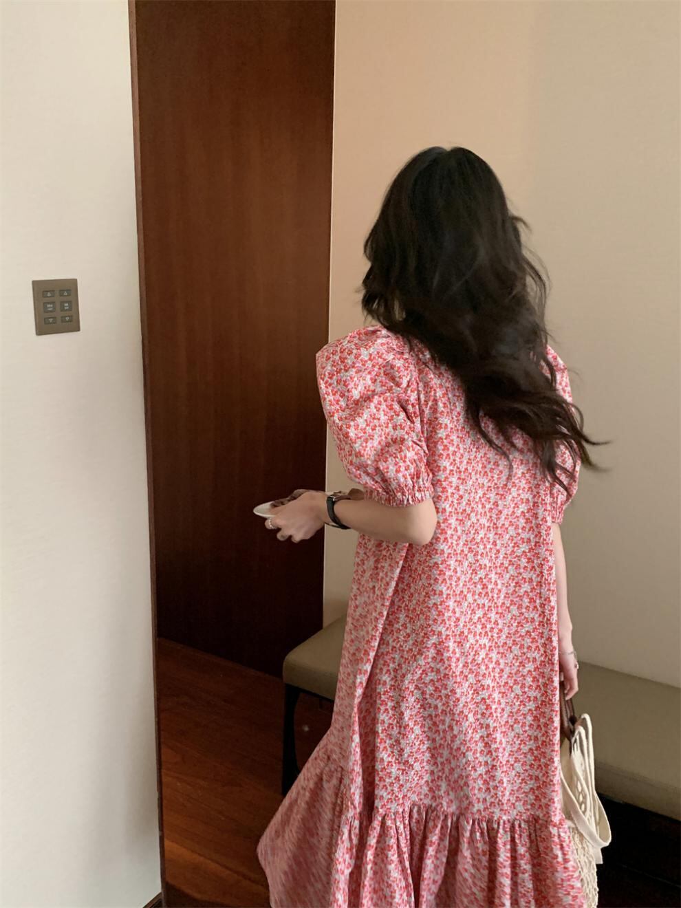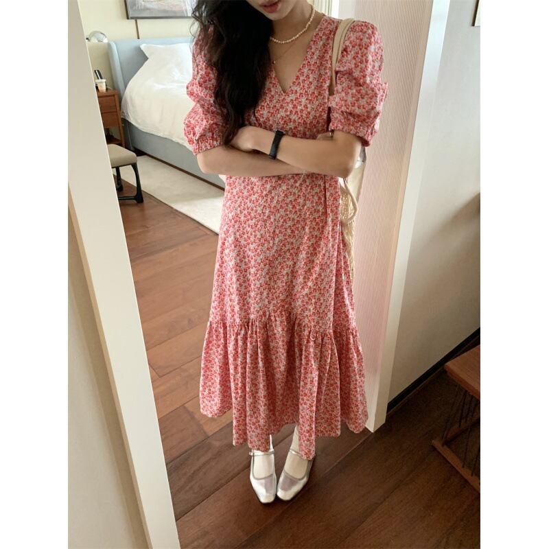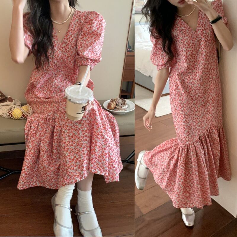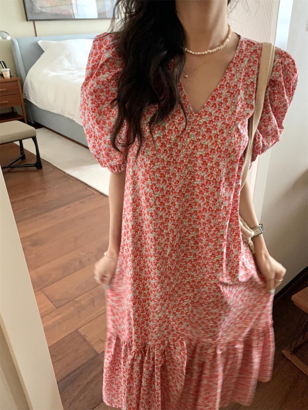 華やかな小花柄が目を引く、パフスリーブのVネックロングワンピース。