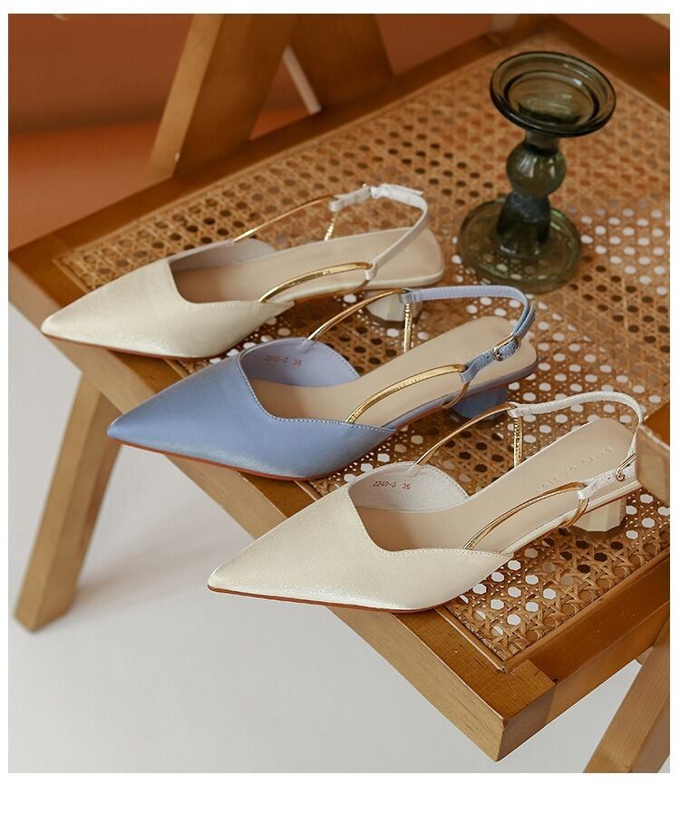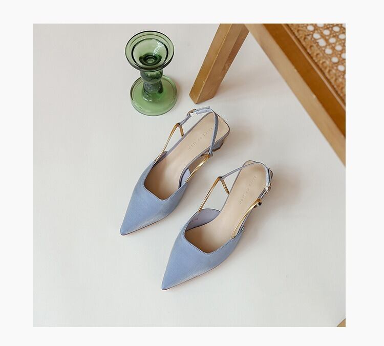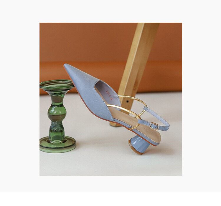 洗練されたポインテッドトゥと安定感のあるチャンキーヒールが魅力の、レディライクなサンダル。