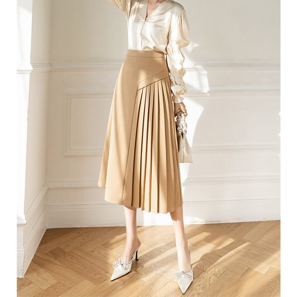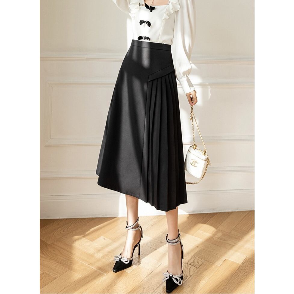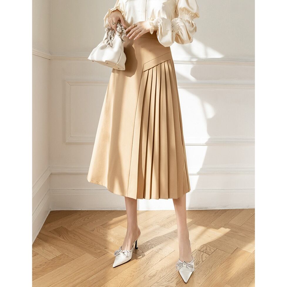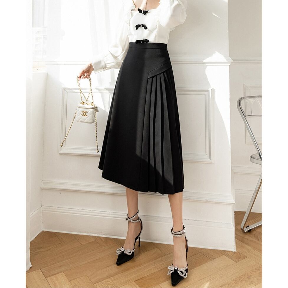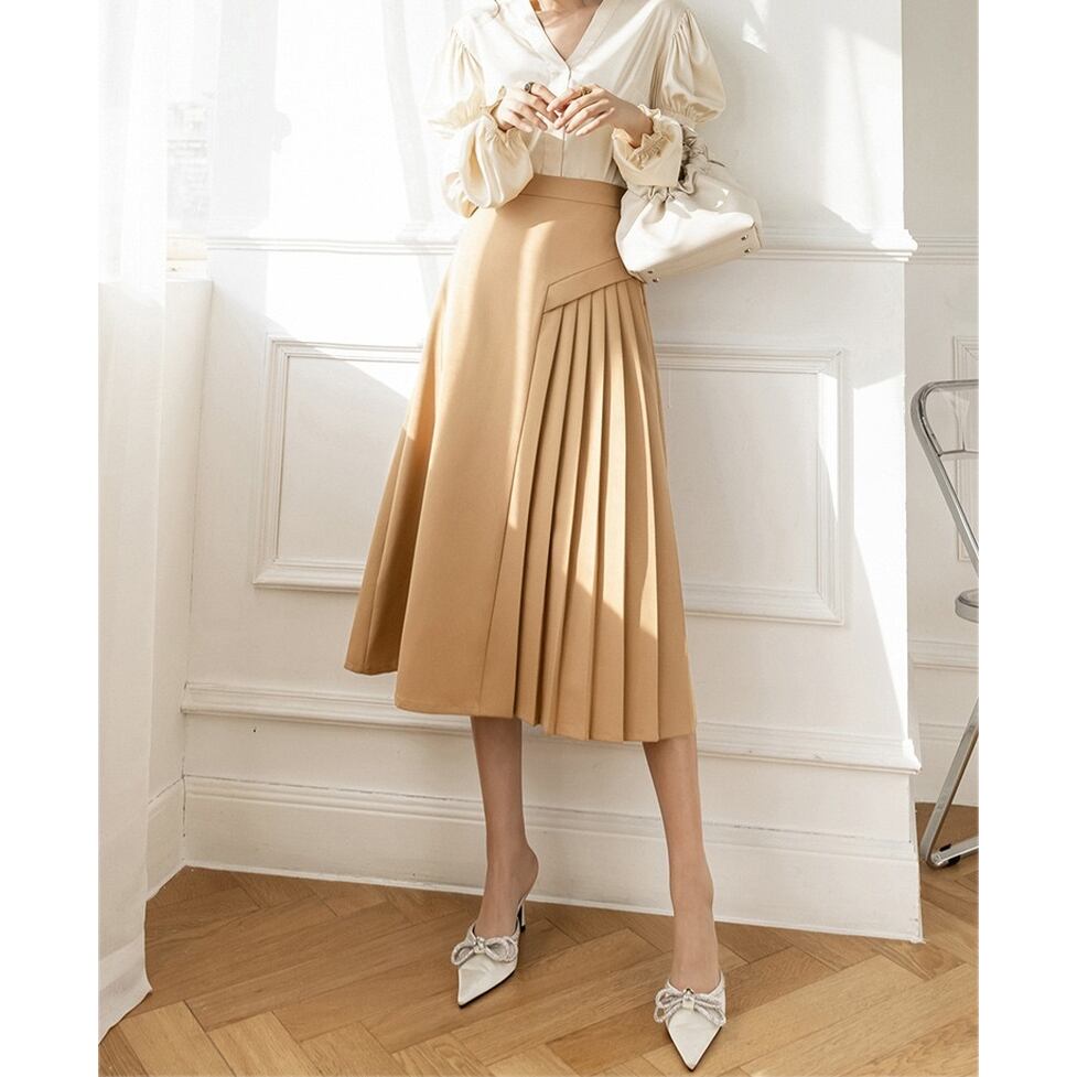サイドのプリーツが際立つアシンメトリーのスカート。ドレッシーなのに親しみやすさもあり。自然なスタイルアップをかなえてより洗練された姿へ