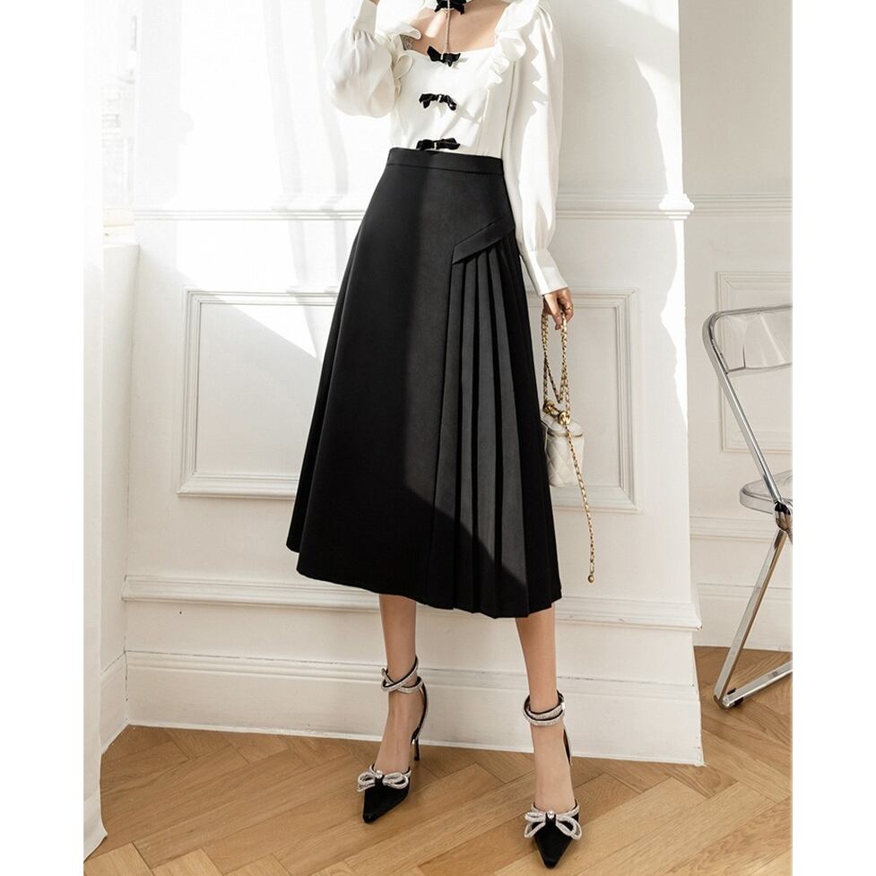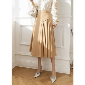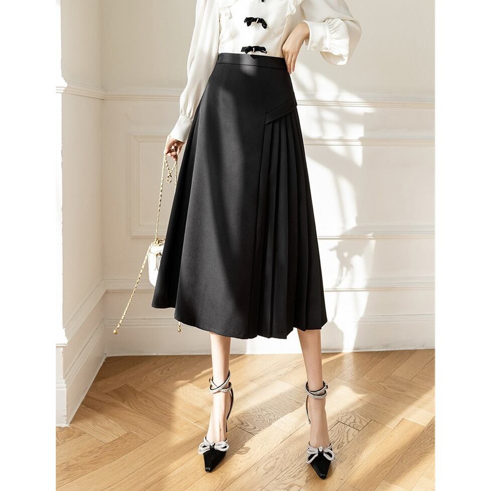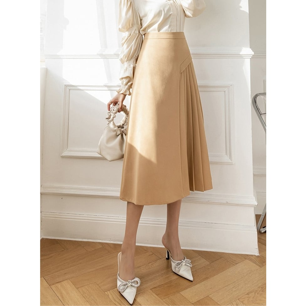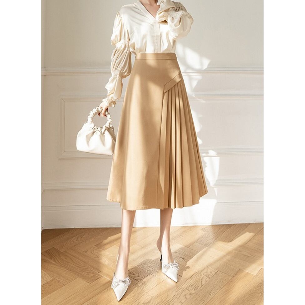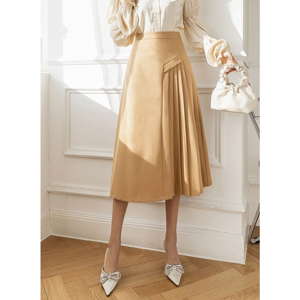 サイドのプリーツが際立つアシンメトリーのスカート。ドレッシーなのに親しみやすさもあり。自然なスタイルアップをかなえてより洗練された姿へ