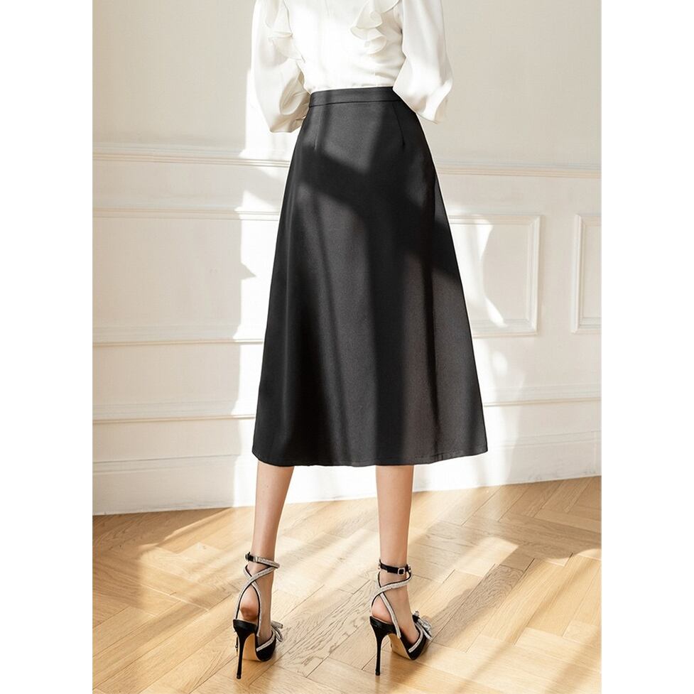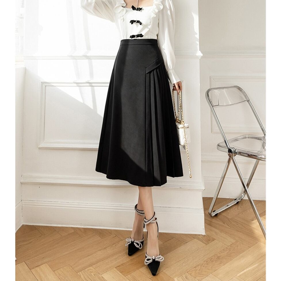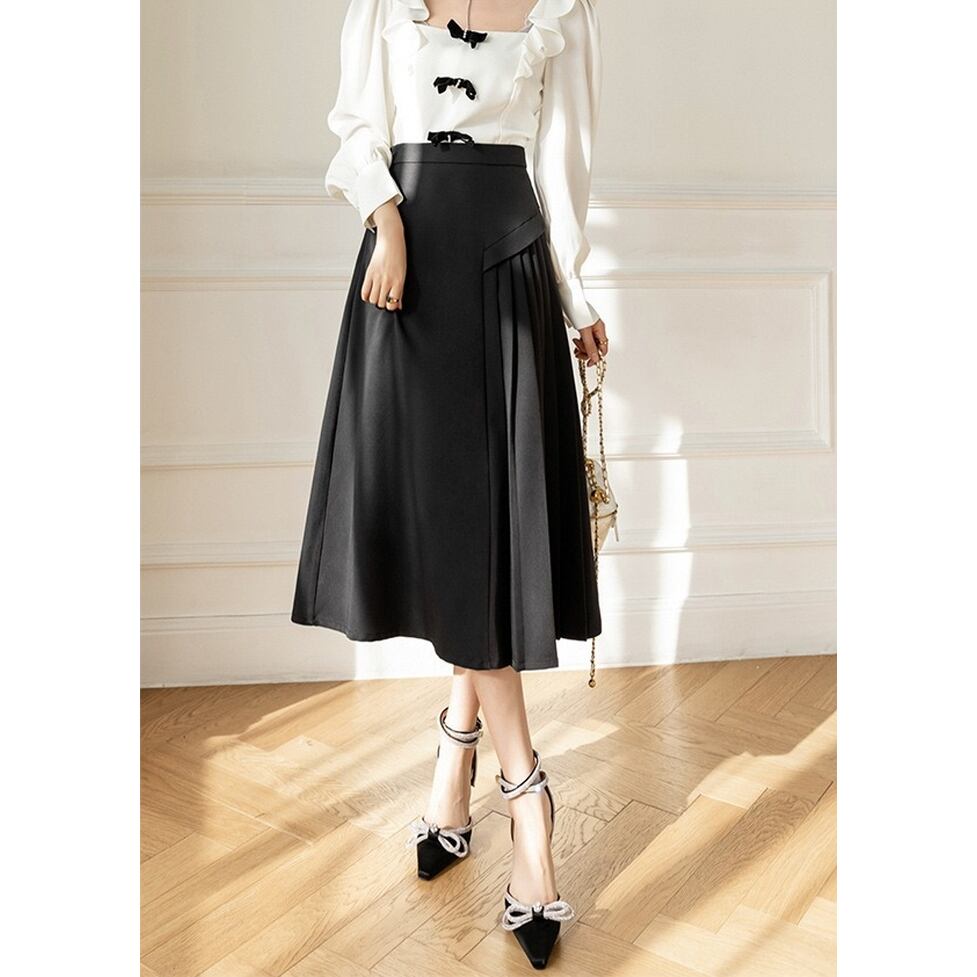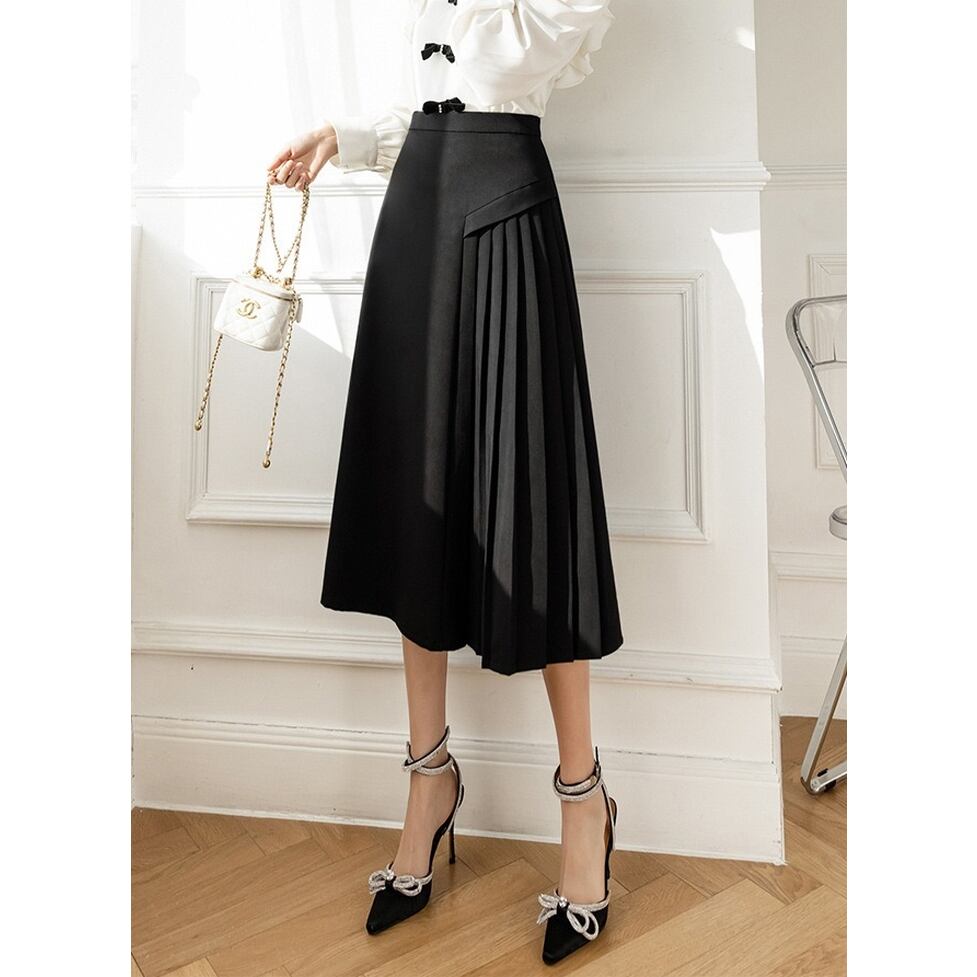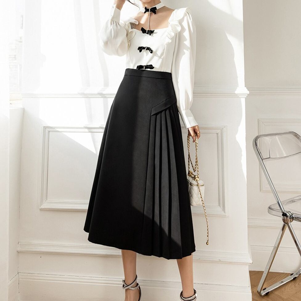 サイドのプリーツが際立つアシンメトリーのスカート。ドレッシーなのに親しみやすさもあり。自然なスタイルアップをかなえてより洗練された姿へ