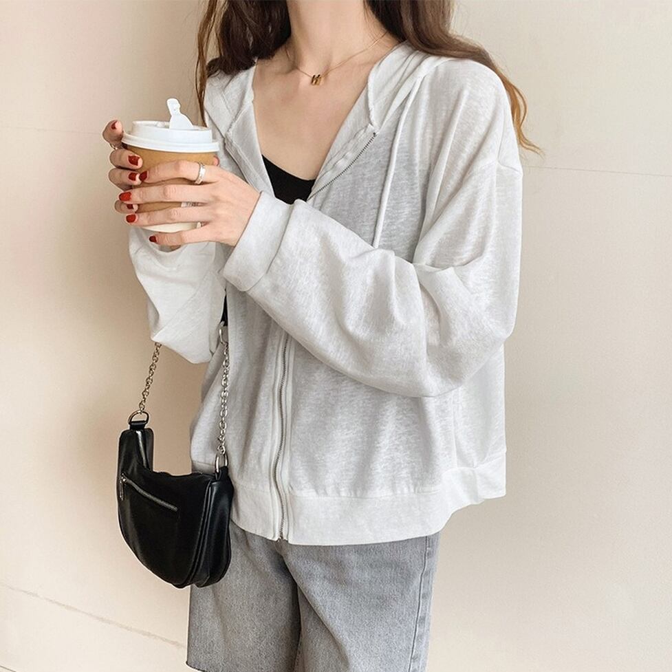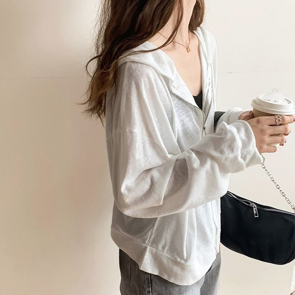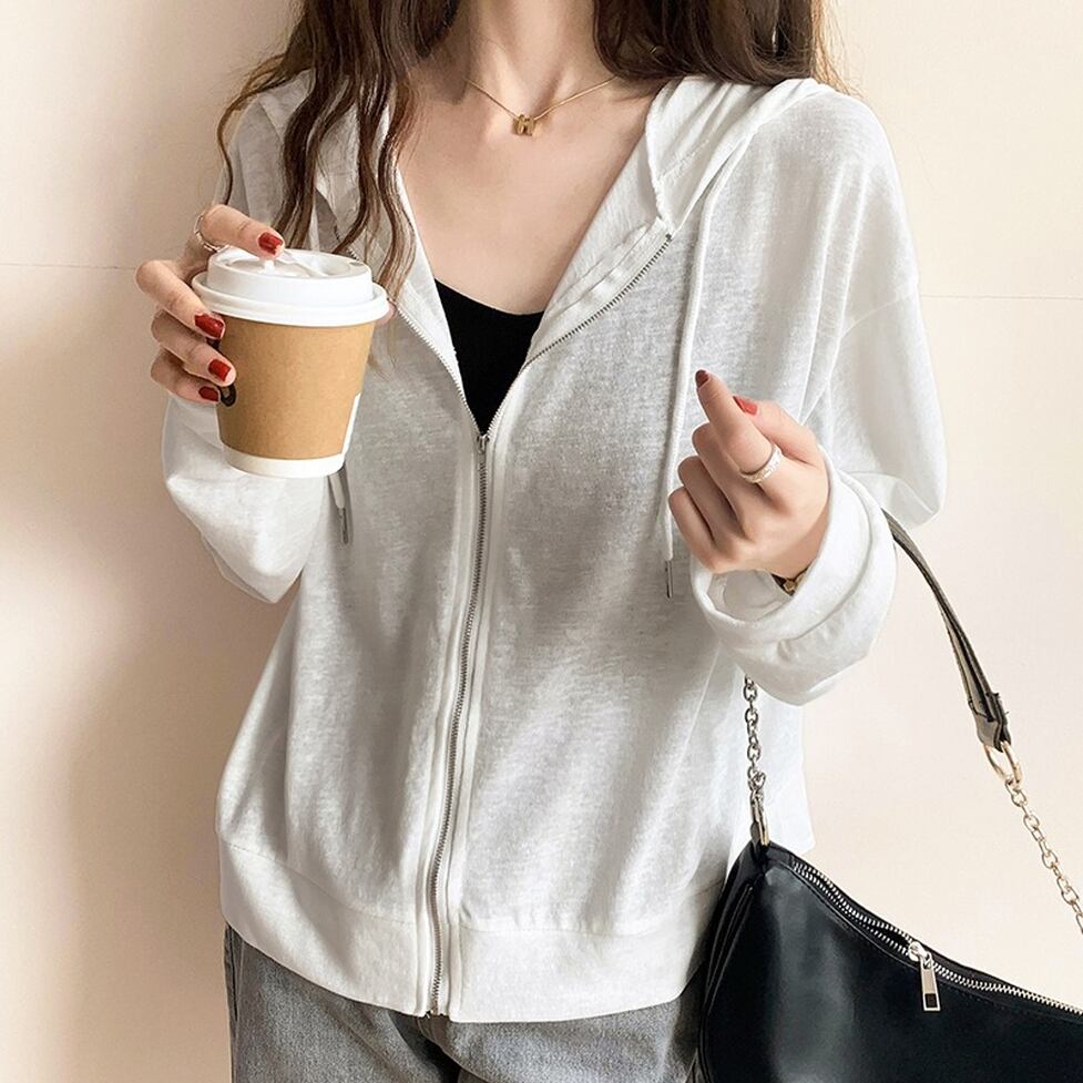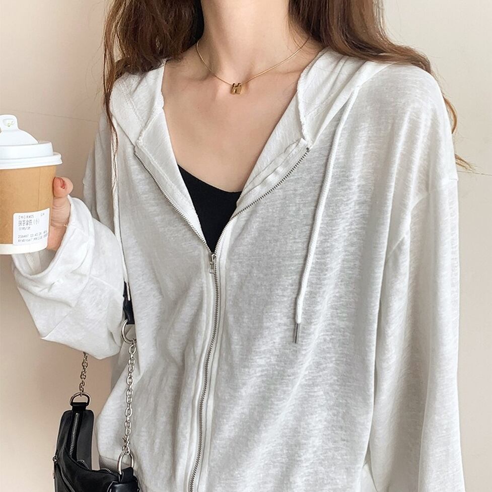 ほんのり透ける薄手素材が軽やかさを演出するジップアップパーカー。女性らしさと洒落感を同時に得られる。しなやかさとマッチするデザインで華奢見えに効果的