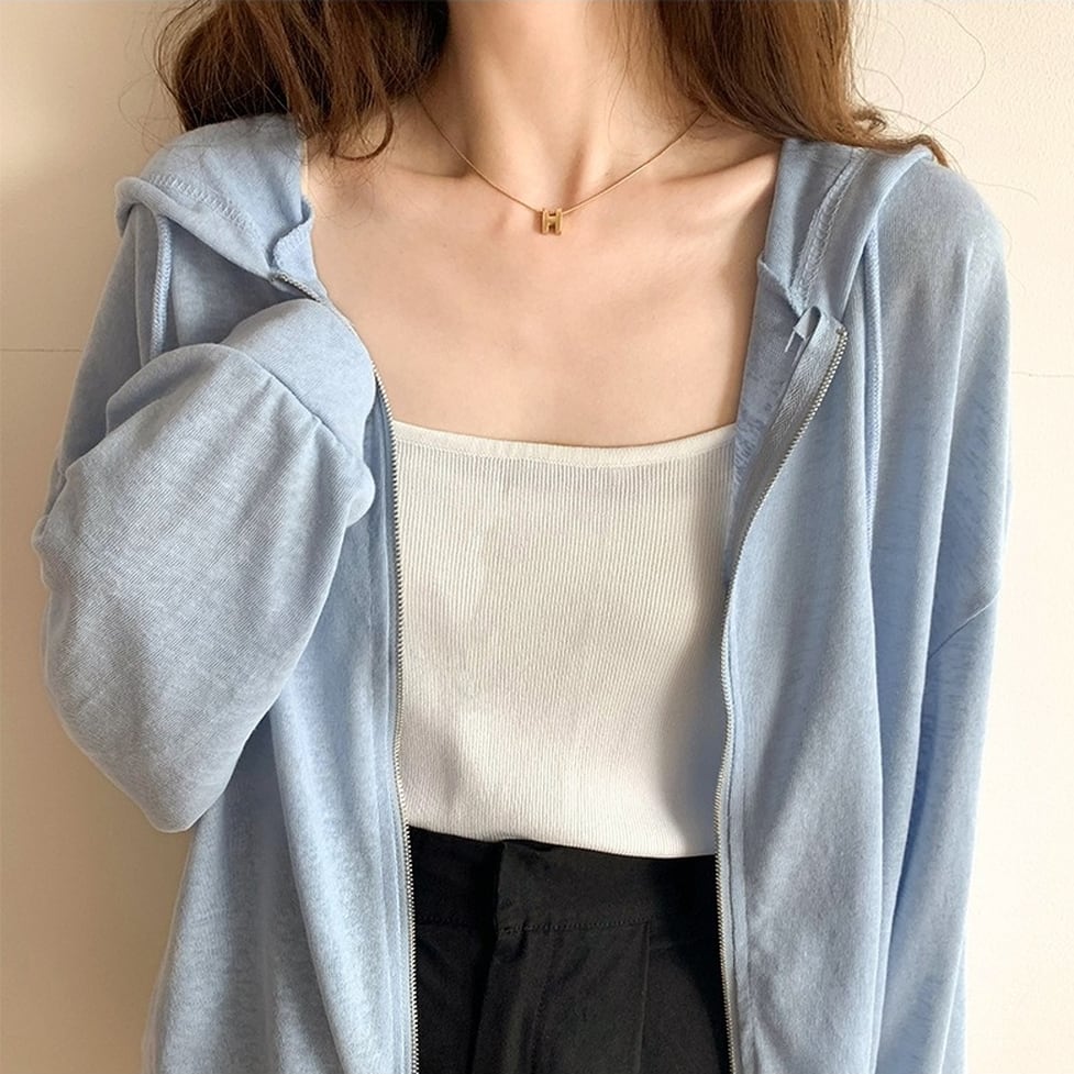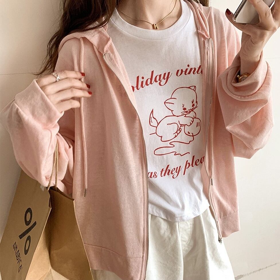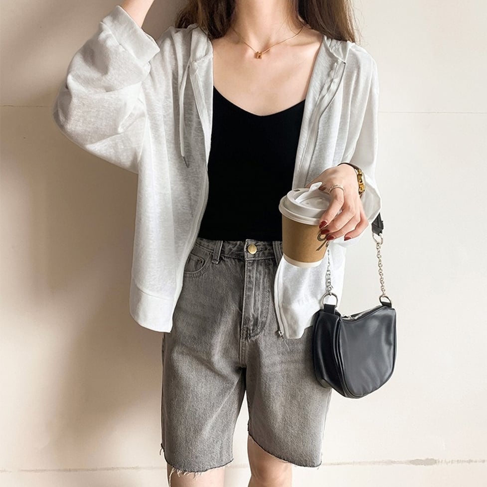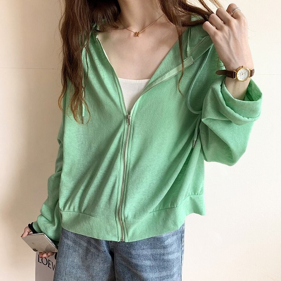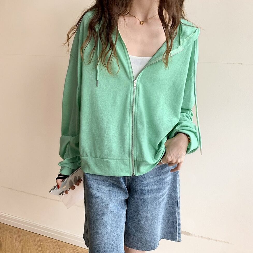 ほんのり透ける薄手素材が軽やかさを演出するジップアップパーカー。女性らしさと洒落感を同時に得られる。しなやかさとマッチするデザインで華奢見えに効果的