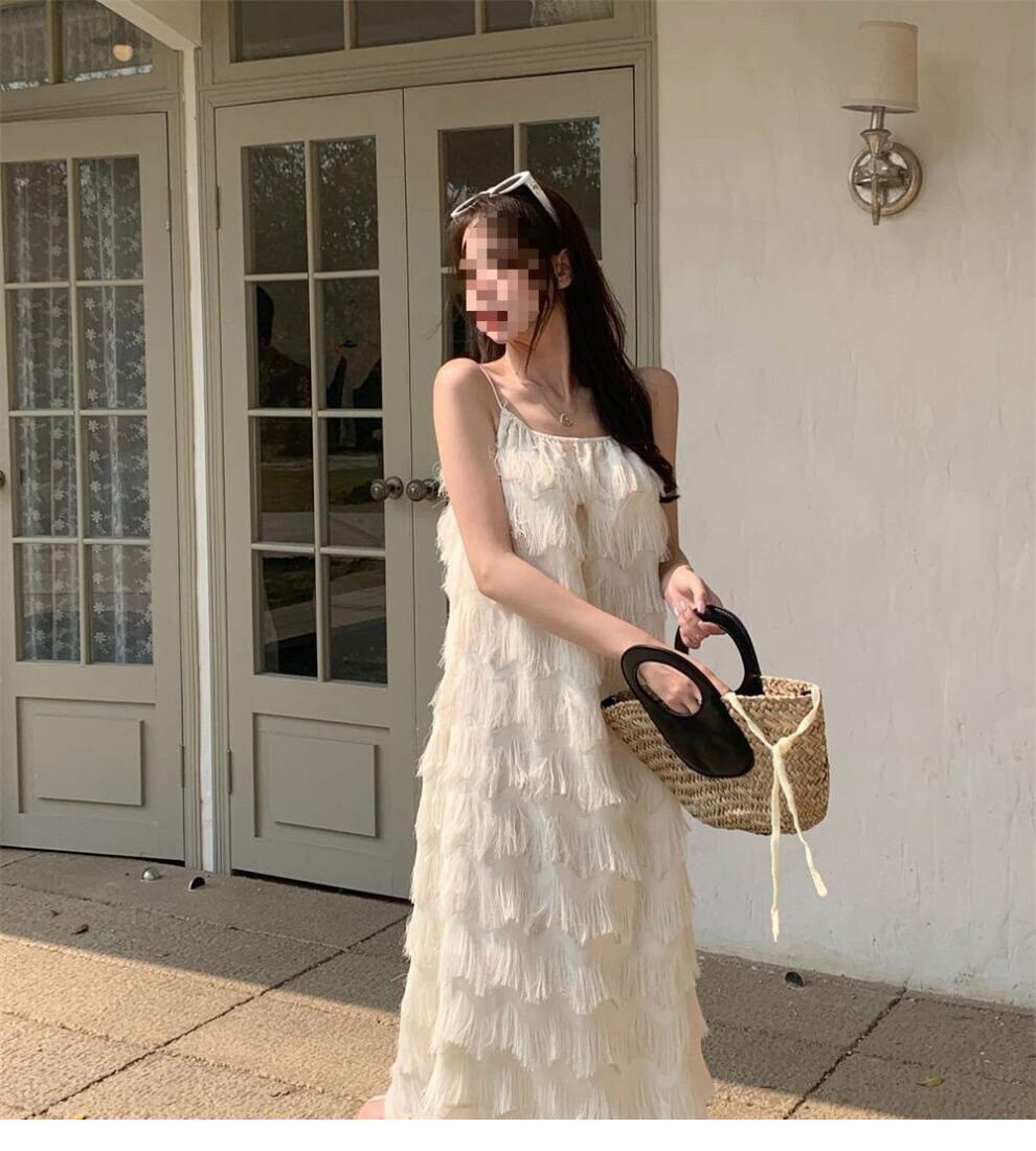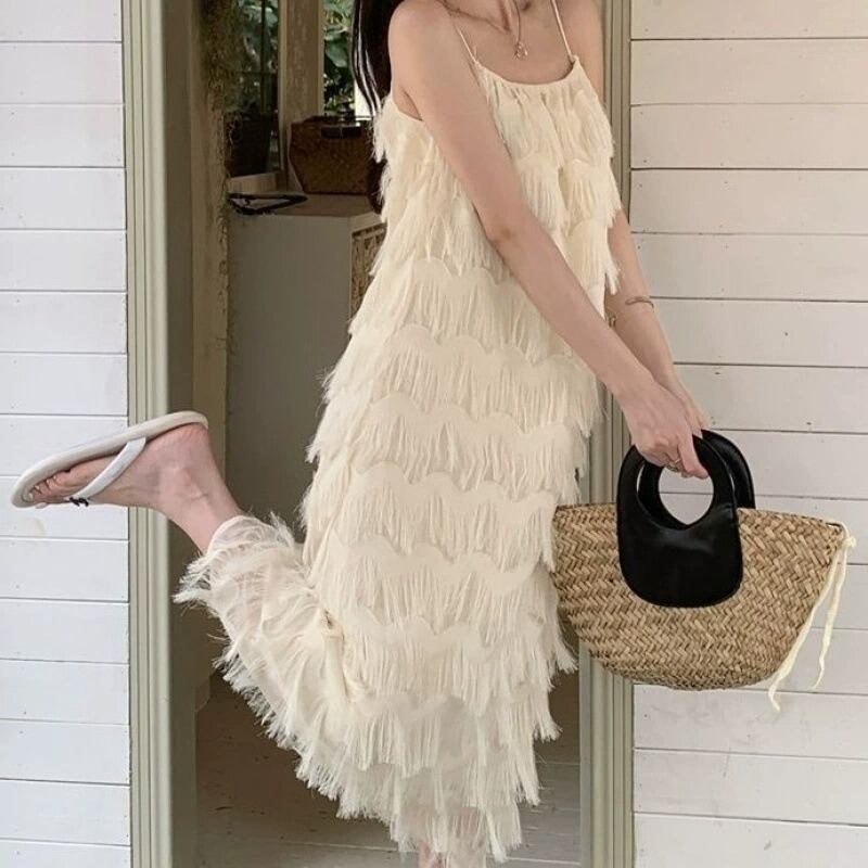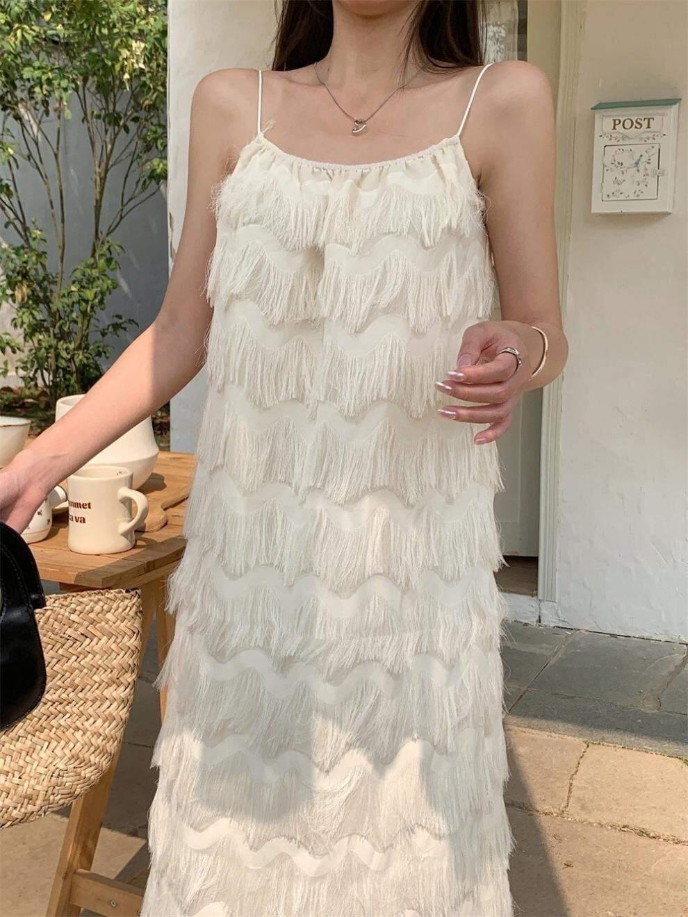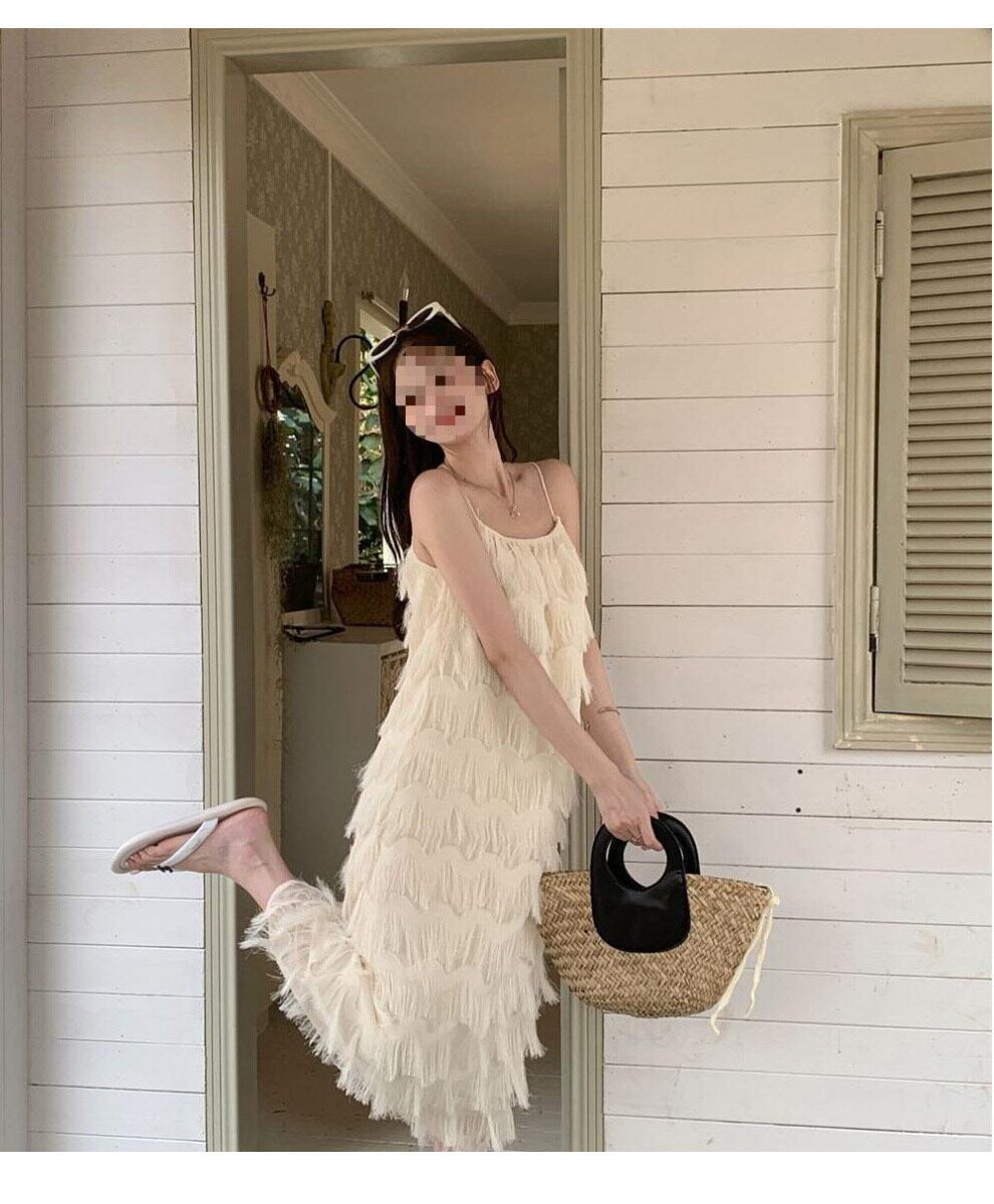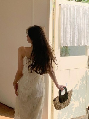 揺れるたびに優雅な表情を魅せる、立体フリンジデザインのキャミソールワンピース。
