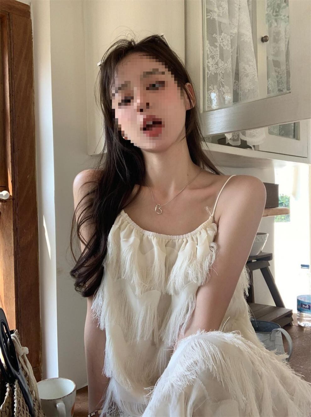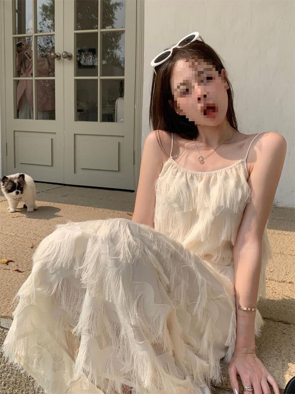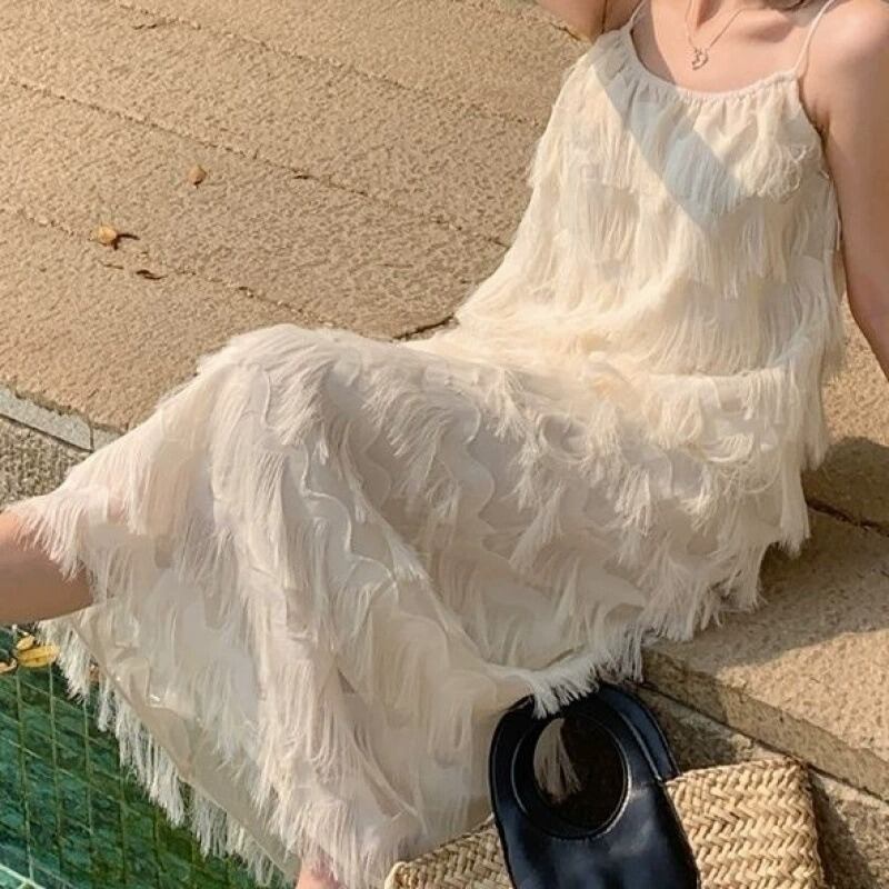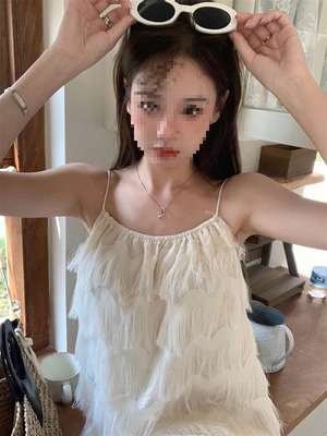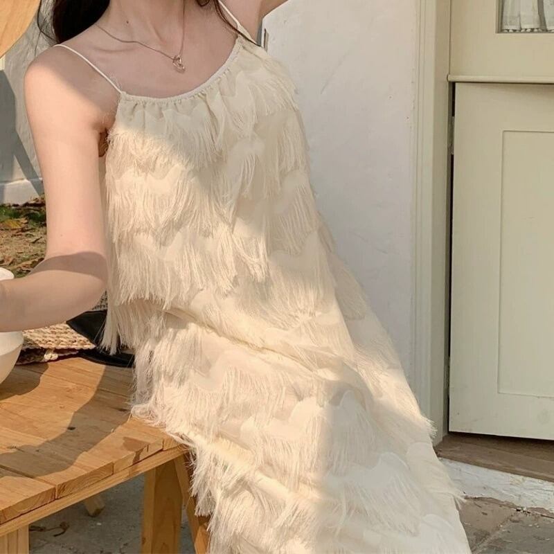 揺れるたびに優雅な表情を魅せる、立体フリンジデザインのキャミソールワンピース。