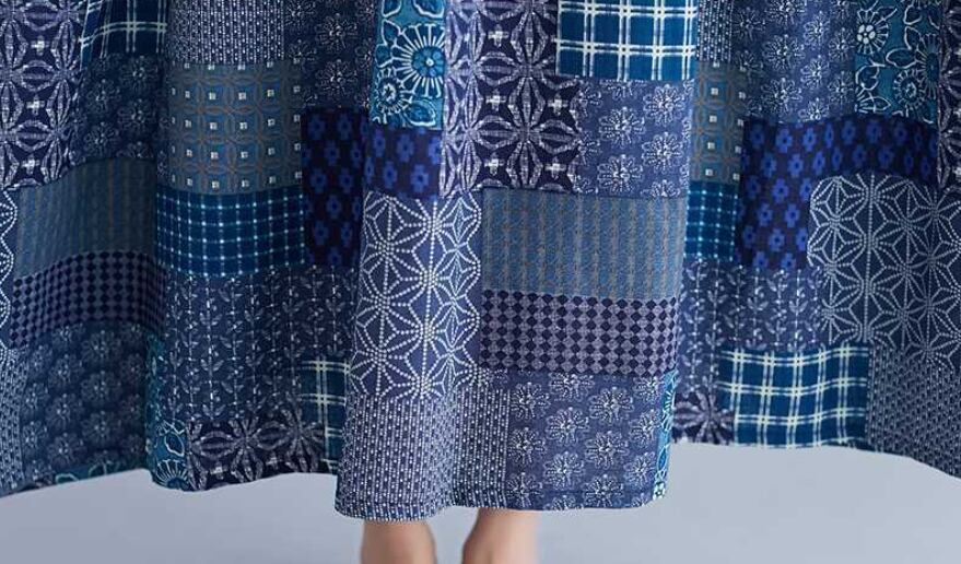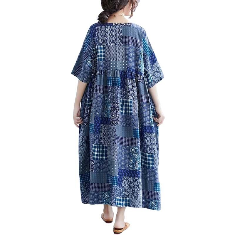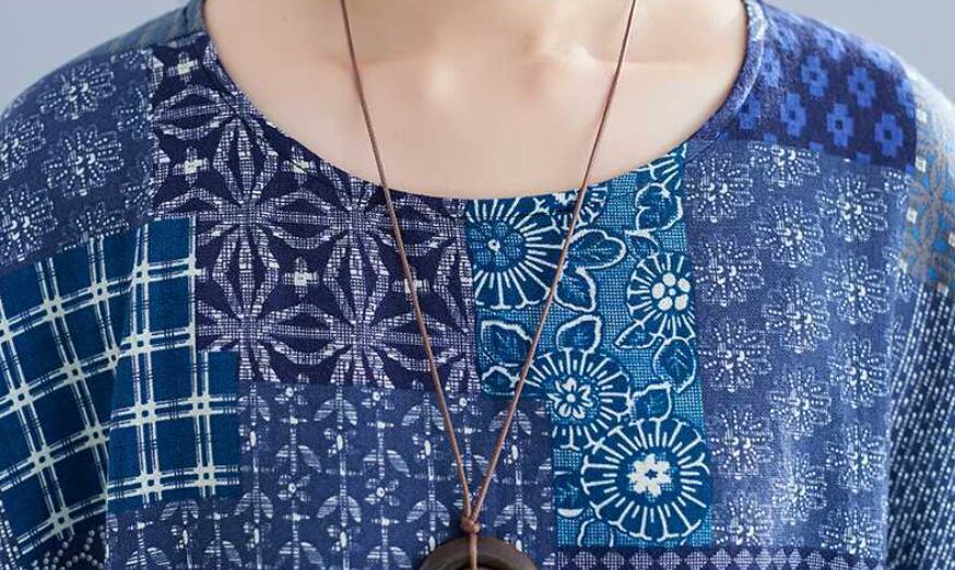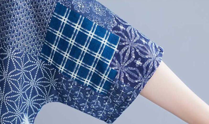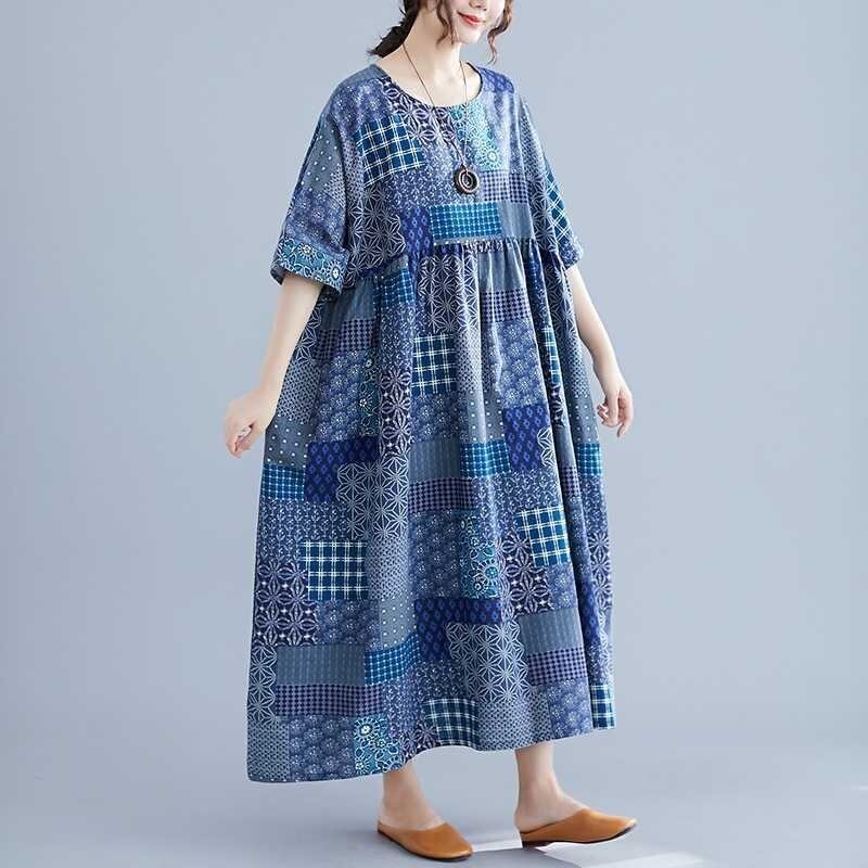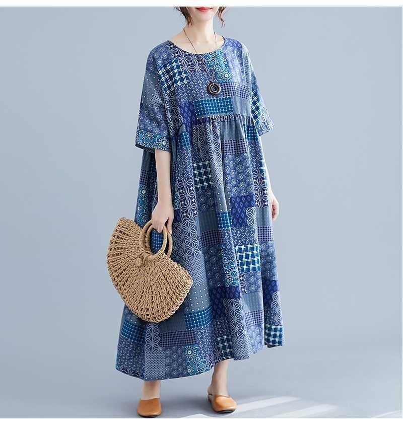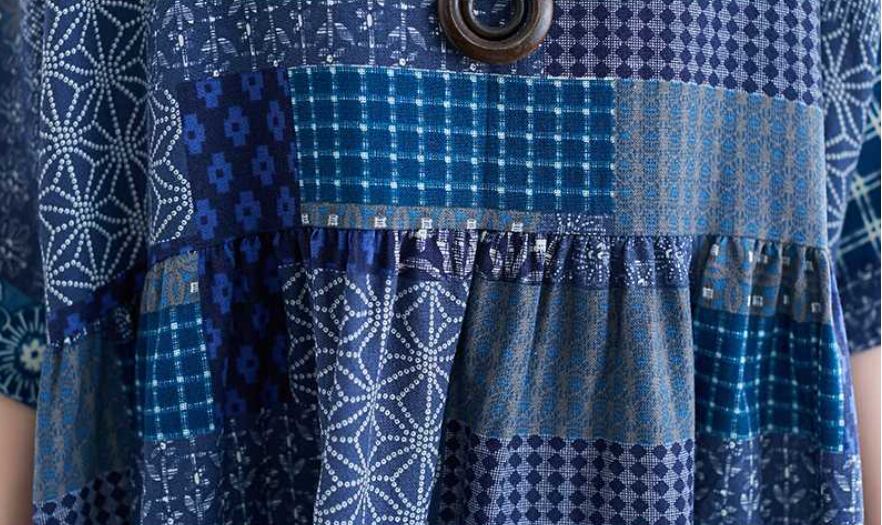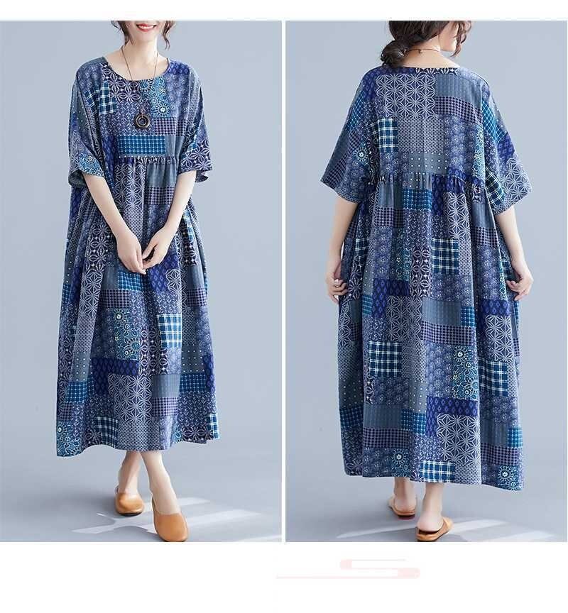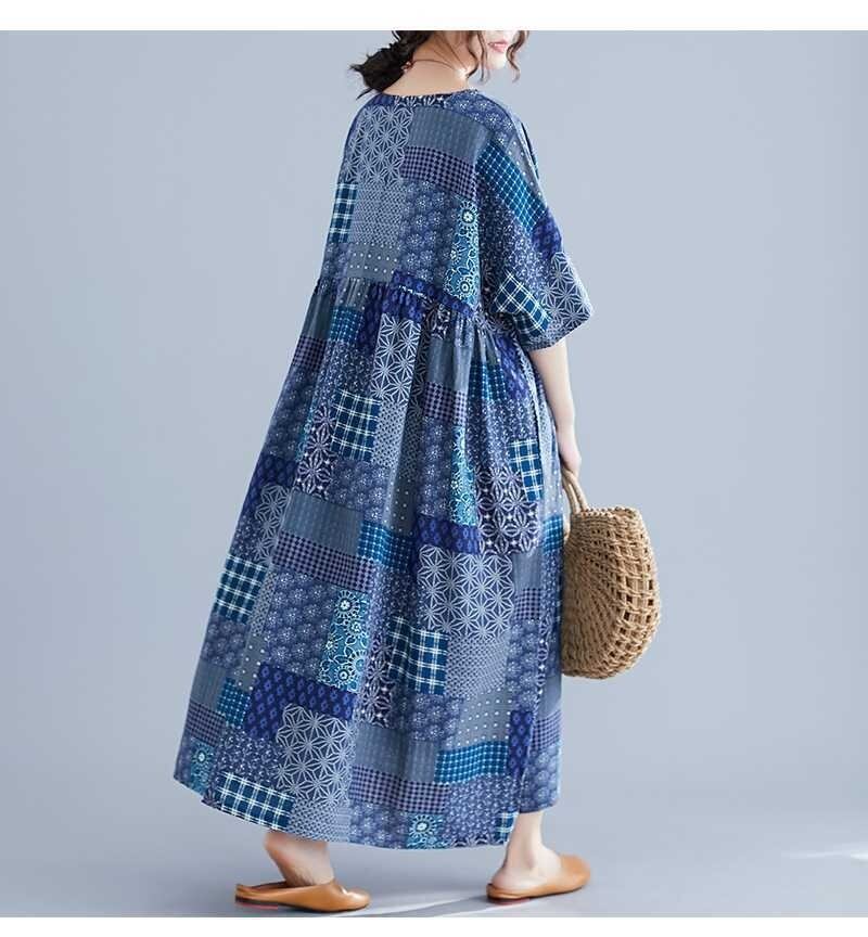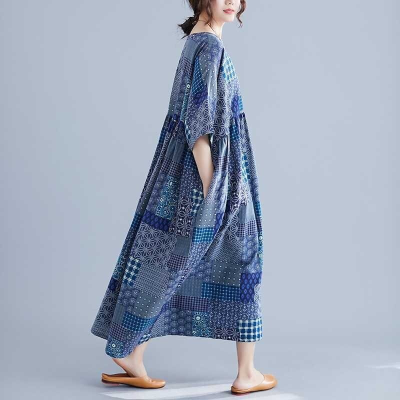 エスニック柄のふんわりとしたフレアのシルエットと、5分袖のデザインが特徴です。