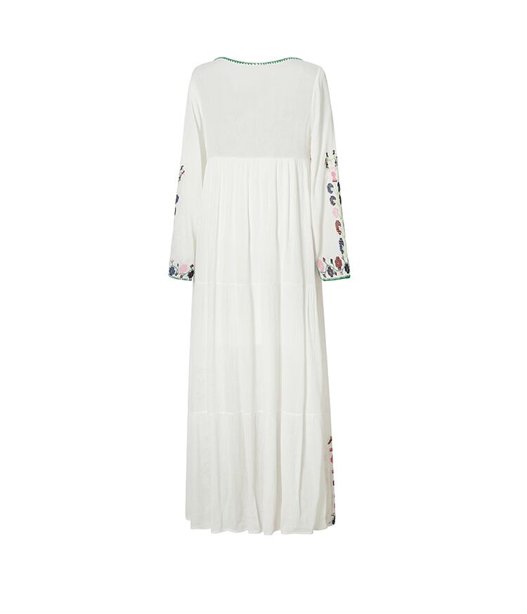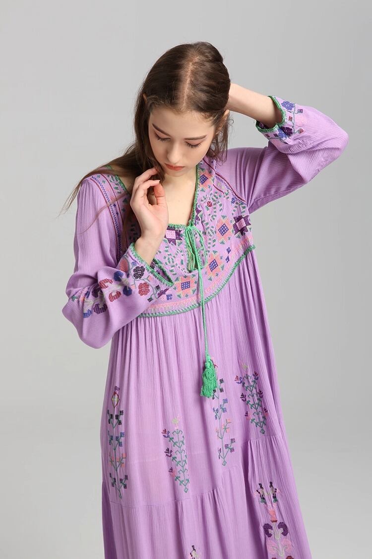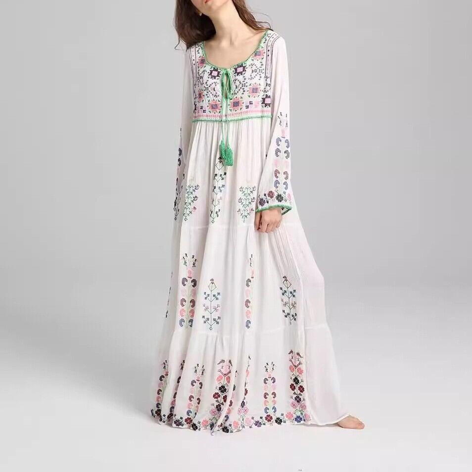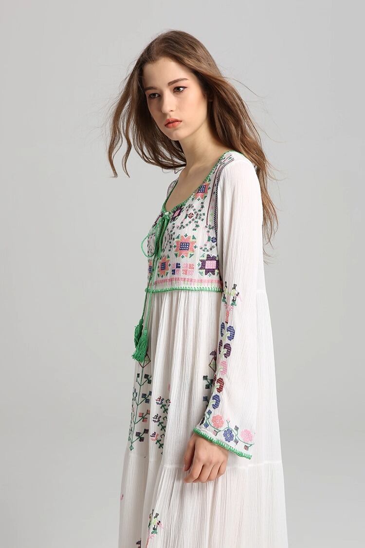 フレアシルエットと、胸元のキーネックが程よい抜け感を演出するロングワンピース。繊細な刺繍と紐飾りが、大人可愛い雰囲気を引き立てます。ゆったりオーバーサイズで体型をさりげなくカバーしつつ、着心地も抜群。