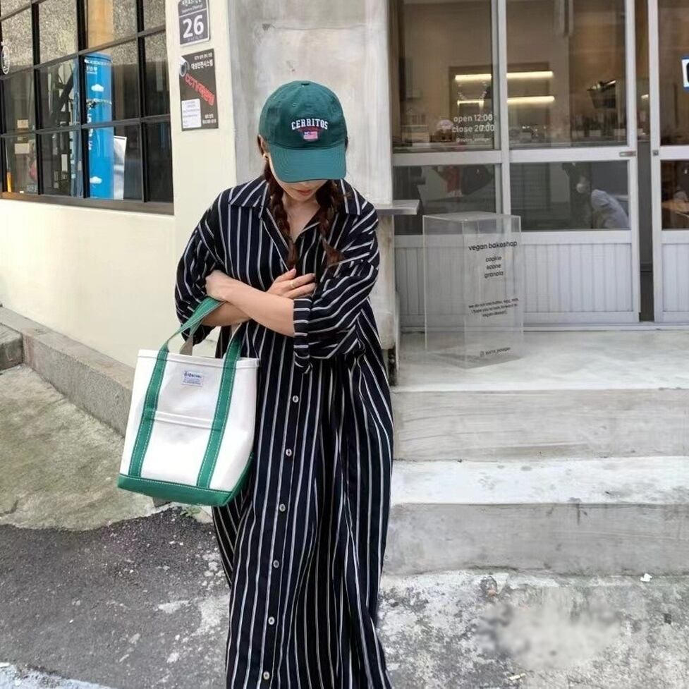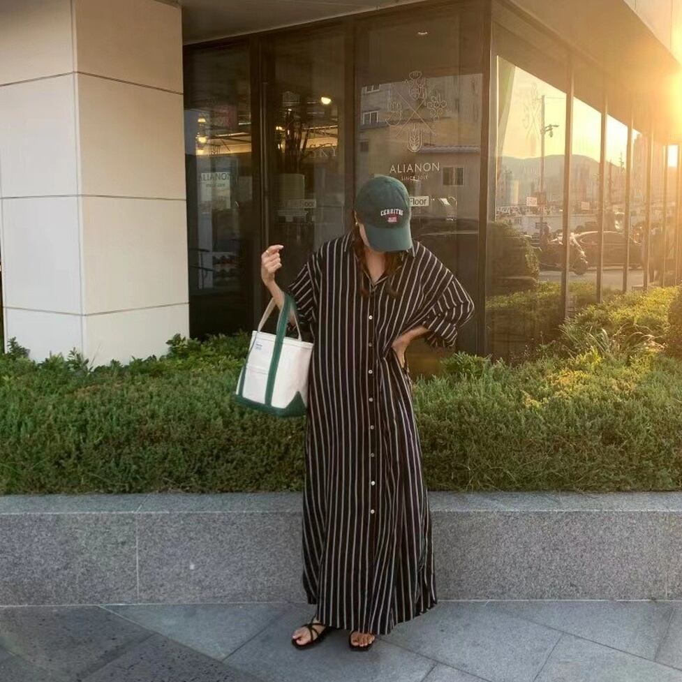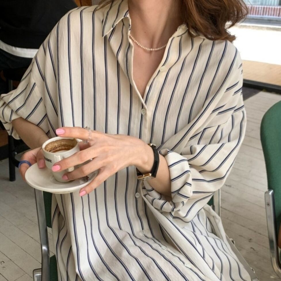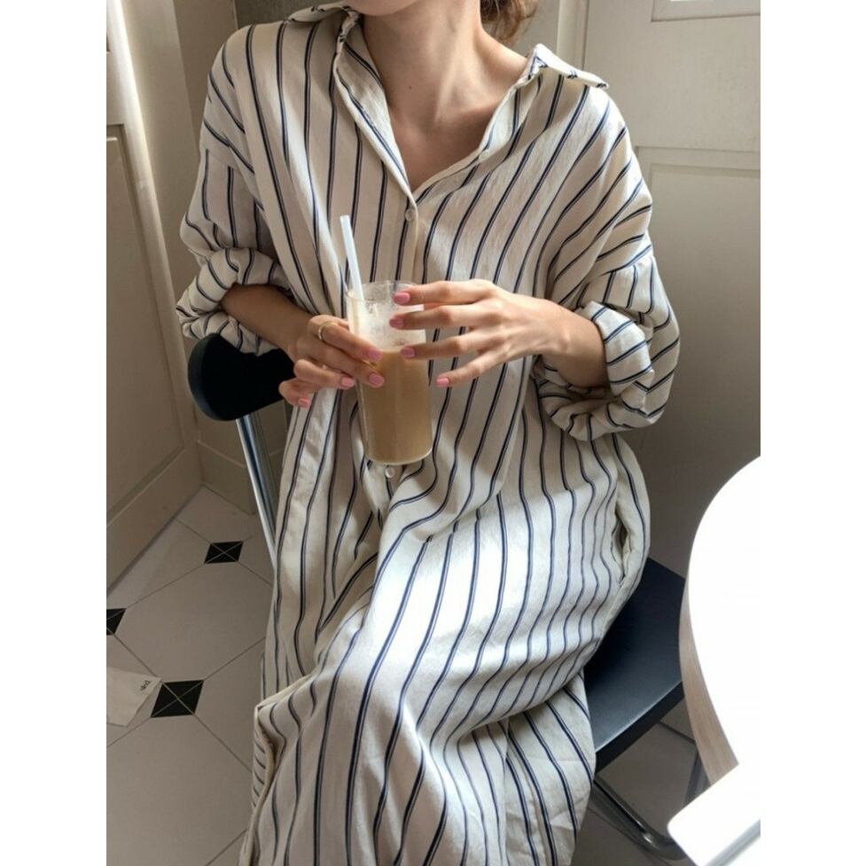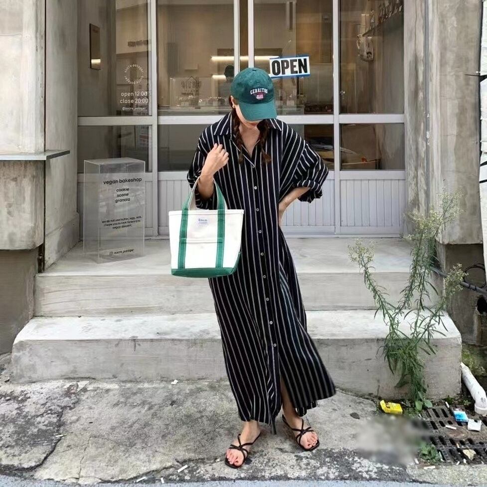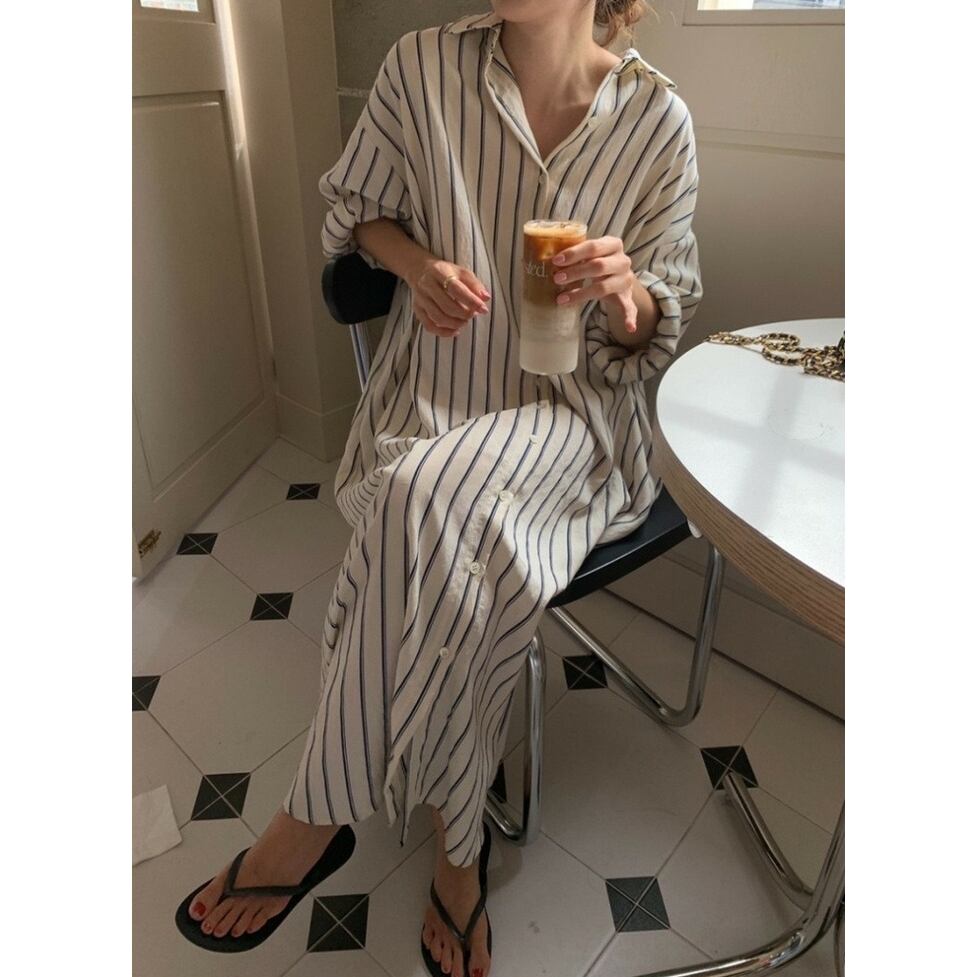 ストライプの中でも軽快かつ上品な印象の配色のシャツワンピース。静止していても揺れてるかのようなドレス手前の美しいシルエット。小物もごくシンプルな合わせで絵になるお手軽なのにおしゃれなアイテム