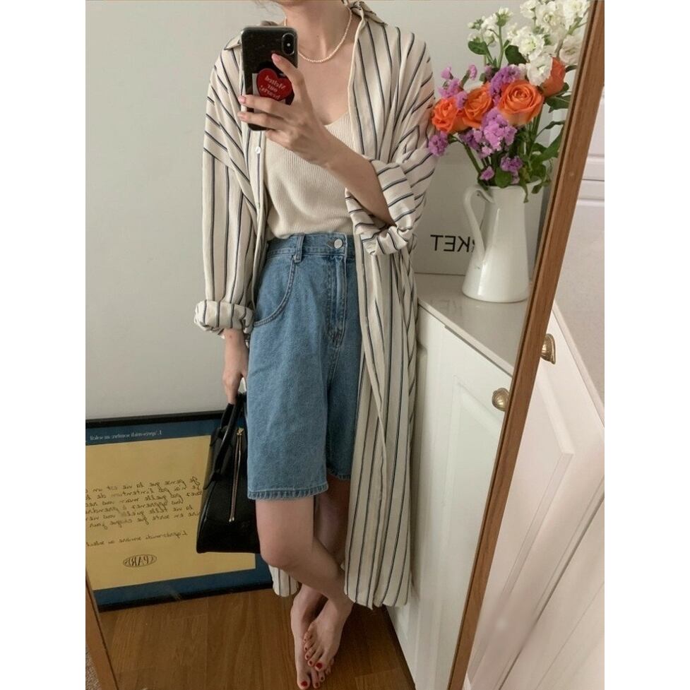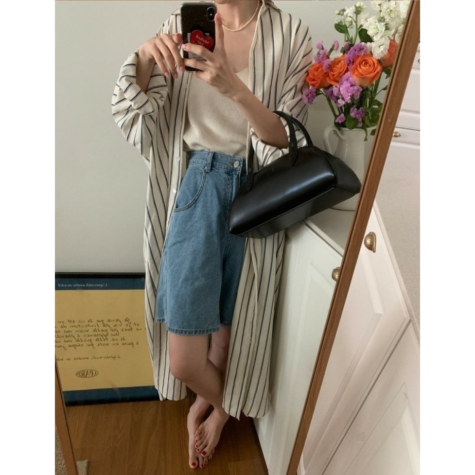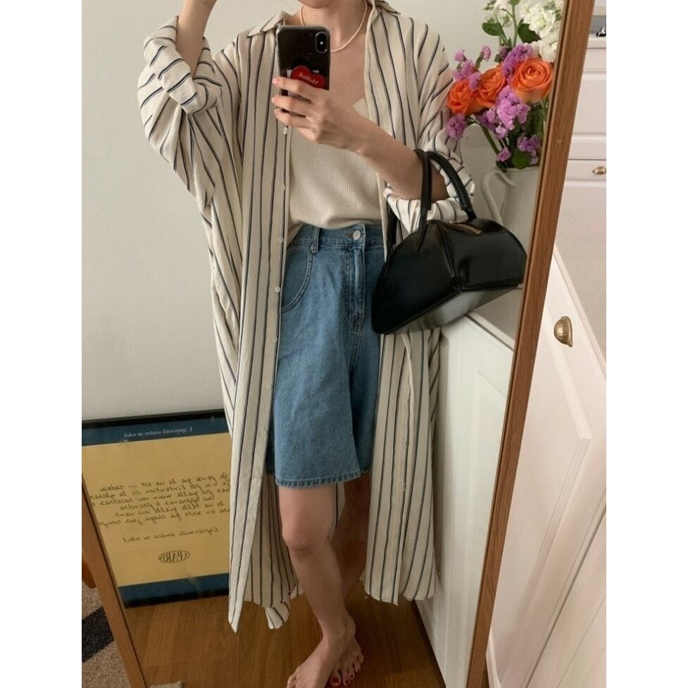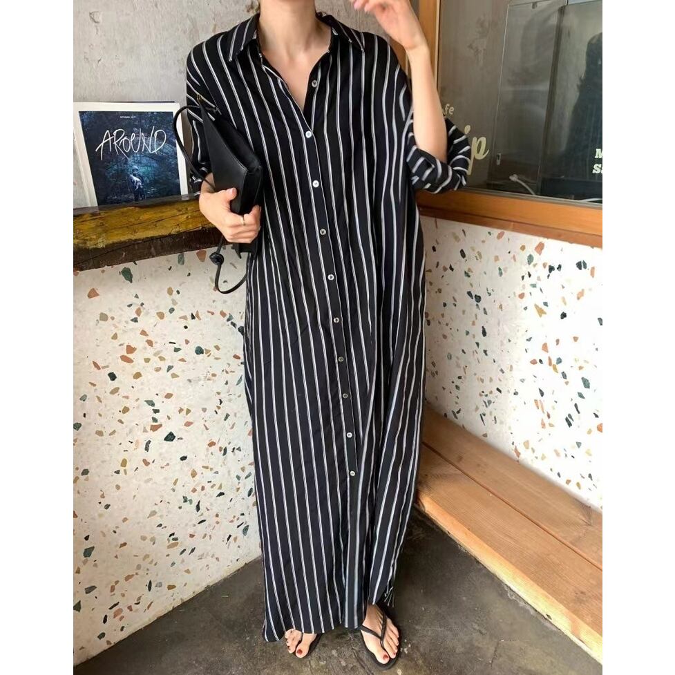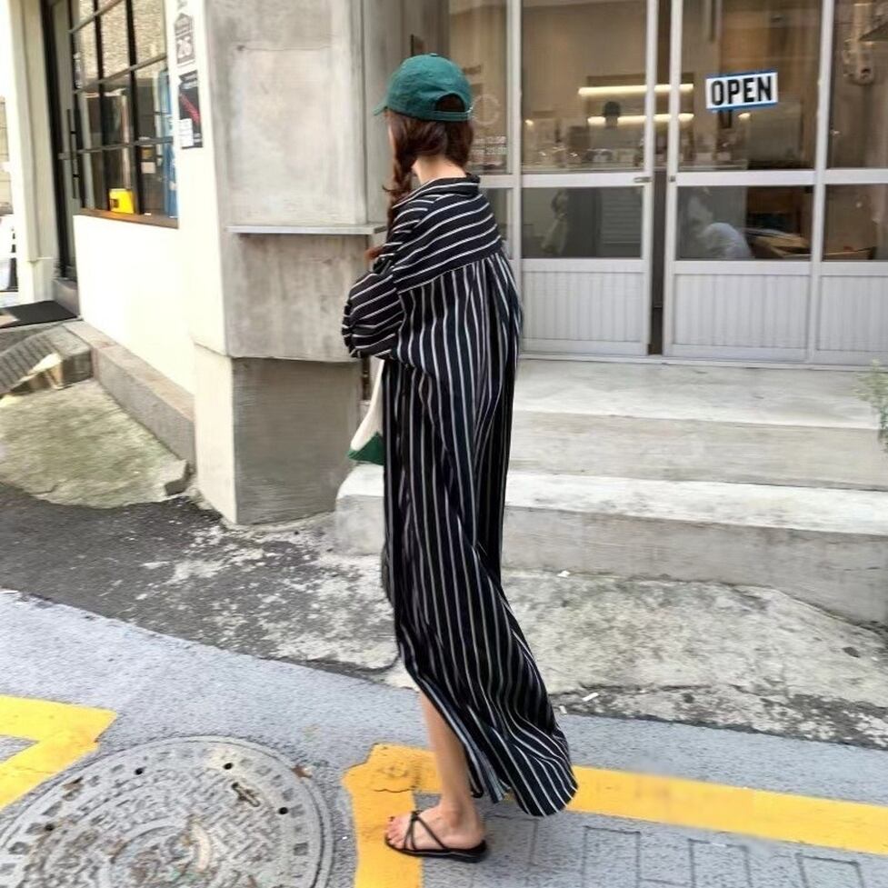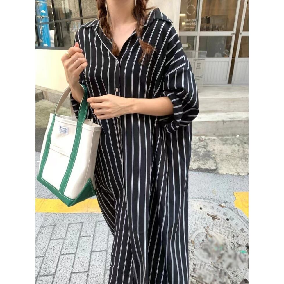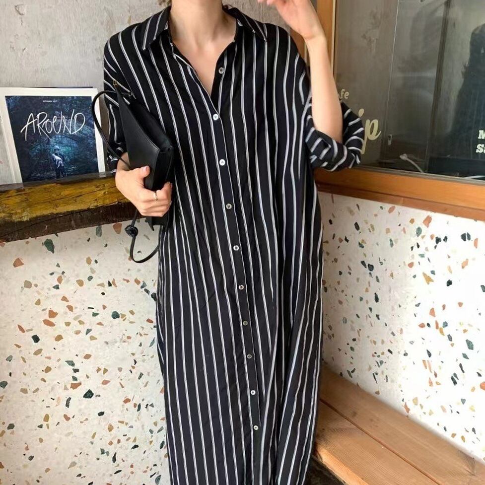 ストライプの中でも軽快かつ上品な印象の配色のシャツワンピース。静止していても揺れてるかのようなドレス手前の美しいシルエット。小物もごくシンプルな合わせで絵になるお手軽なのにおしゃれなアイテム