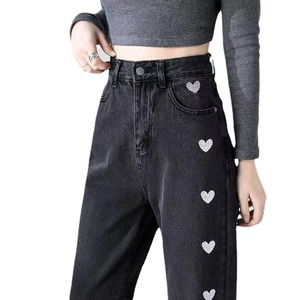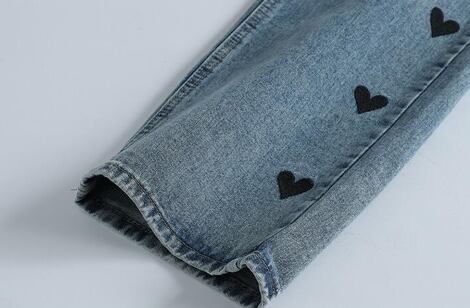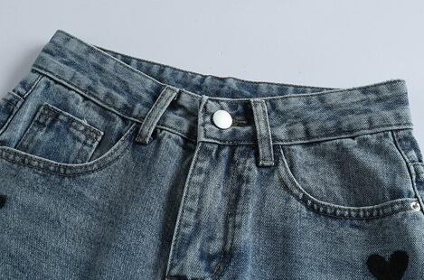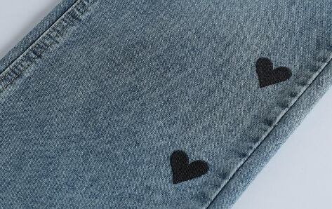 サイドに並んだブラックハートのプリントが目を引く、遊び心たっぷりのデニムパンツ。