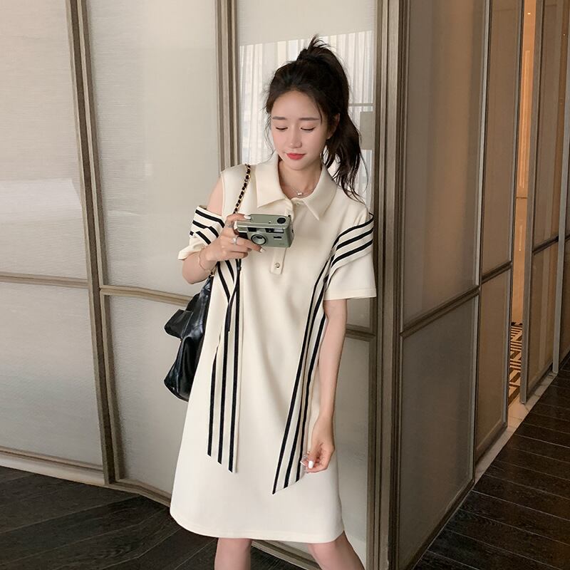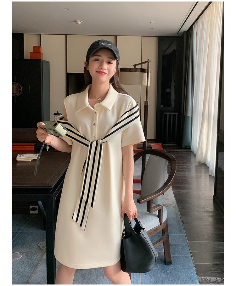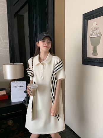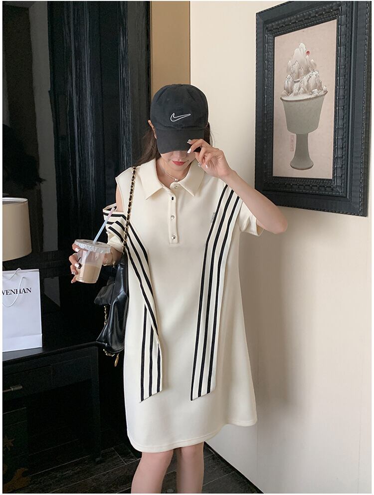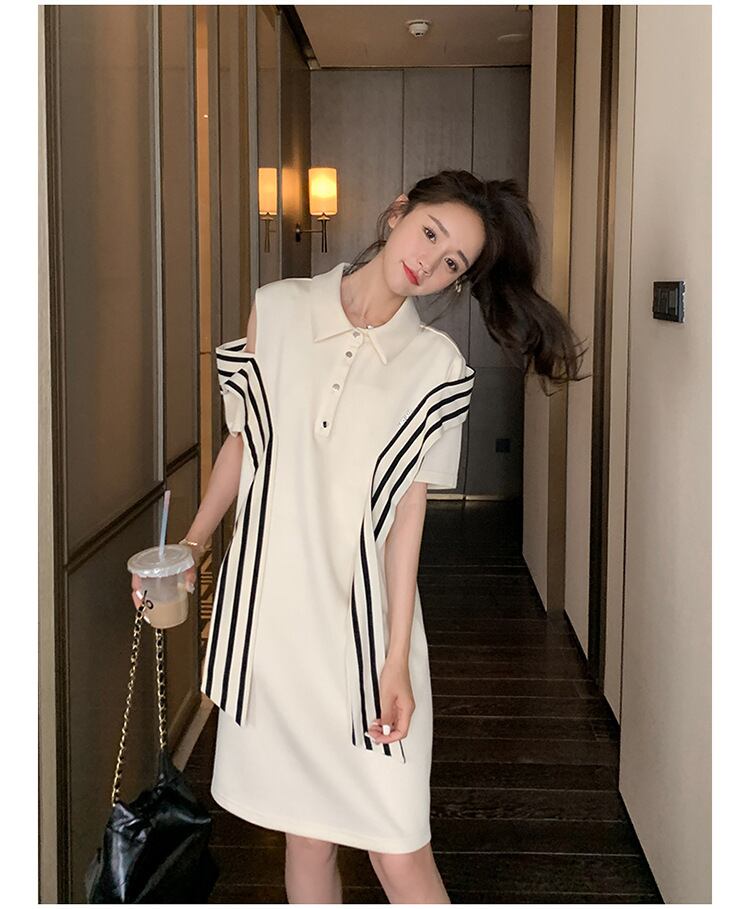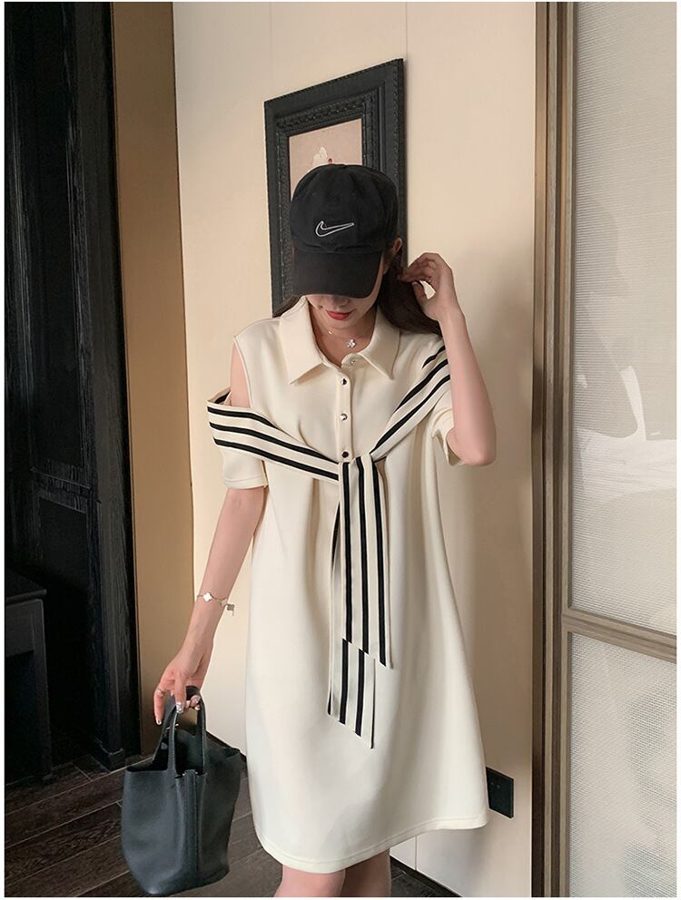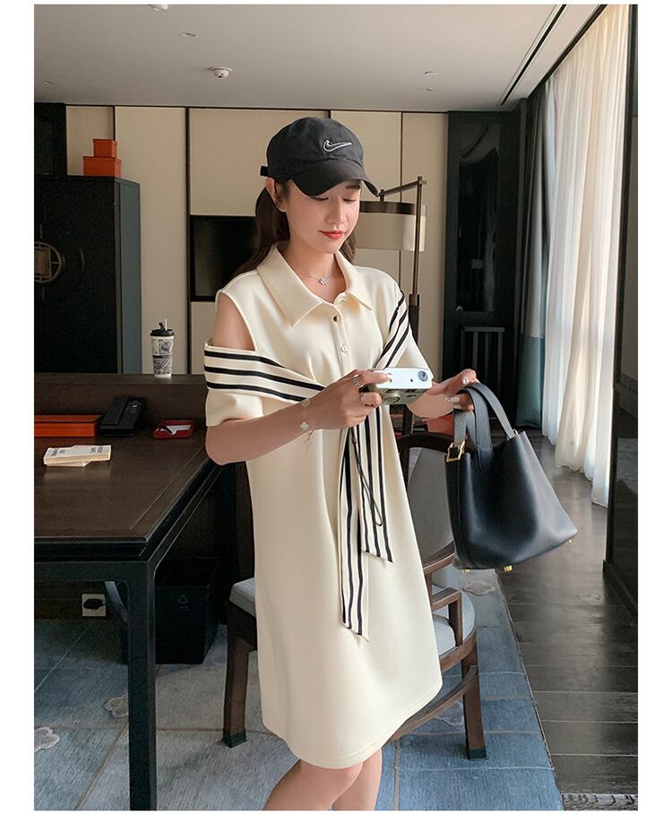ゆったりとしたオーバーサイズシルエットが、こなれ感と抜け感を演出する襟付きワンピース。右と左で異なる袖デザイン、ストライプ柄のショールを羽織っているようなドッキングデザインがアクセントでシンプルながらも印象的な一枚です。