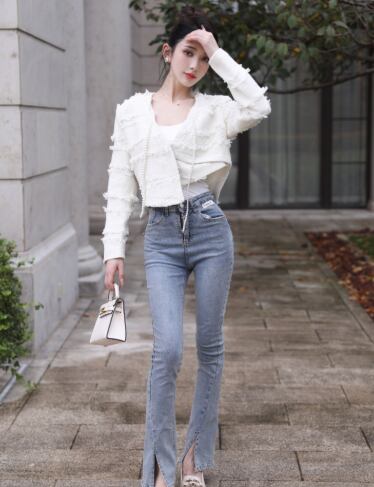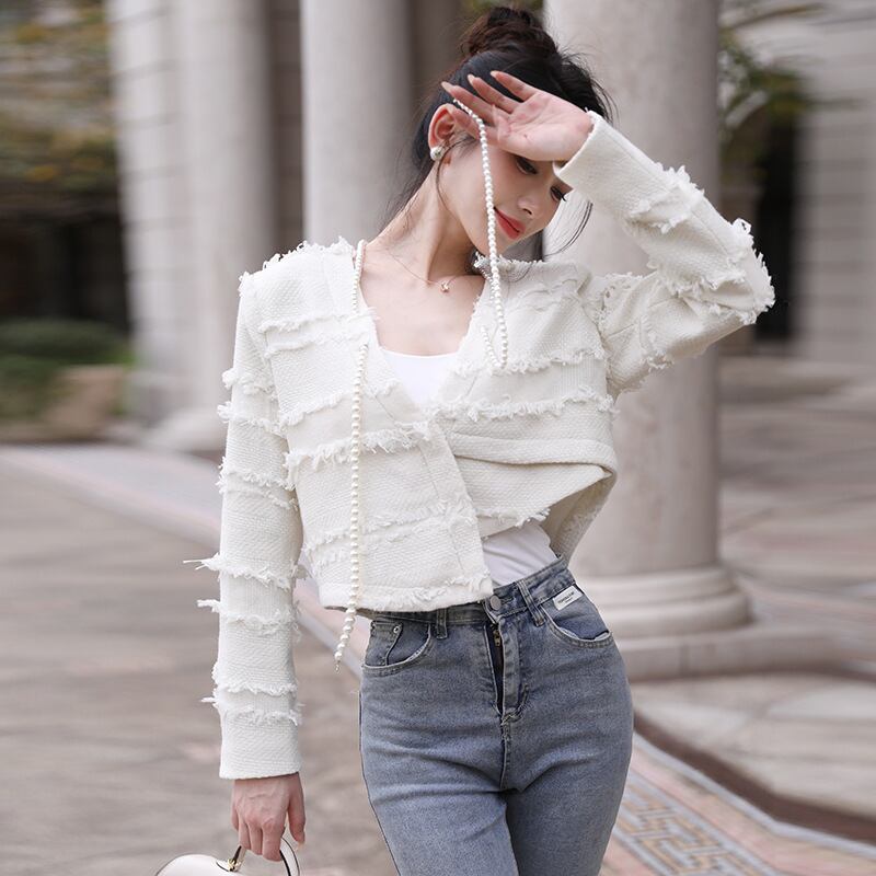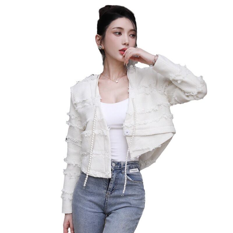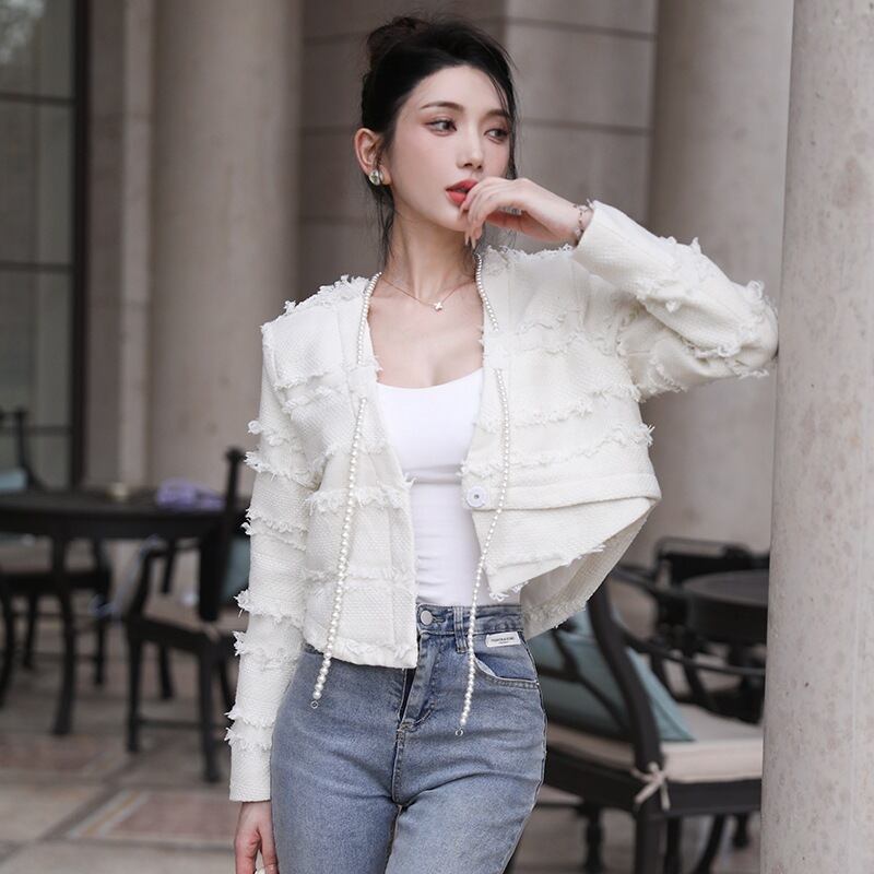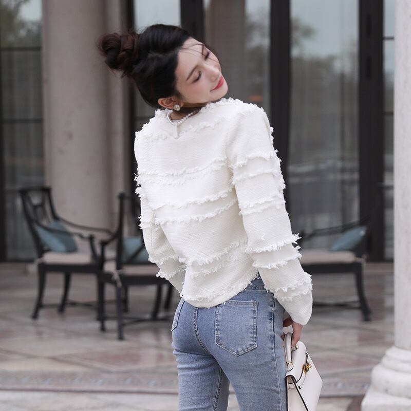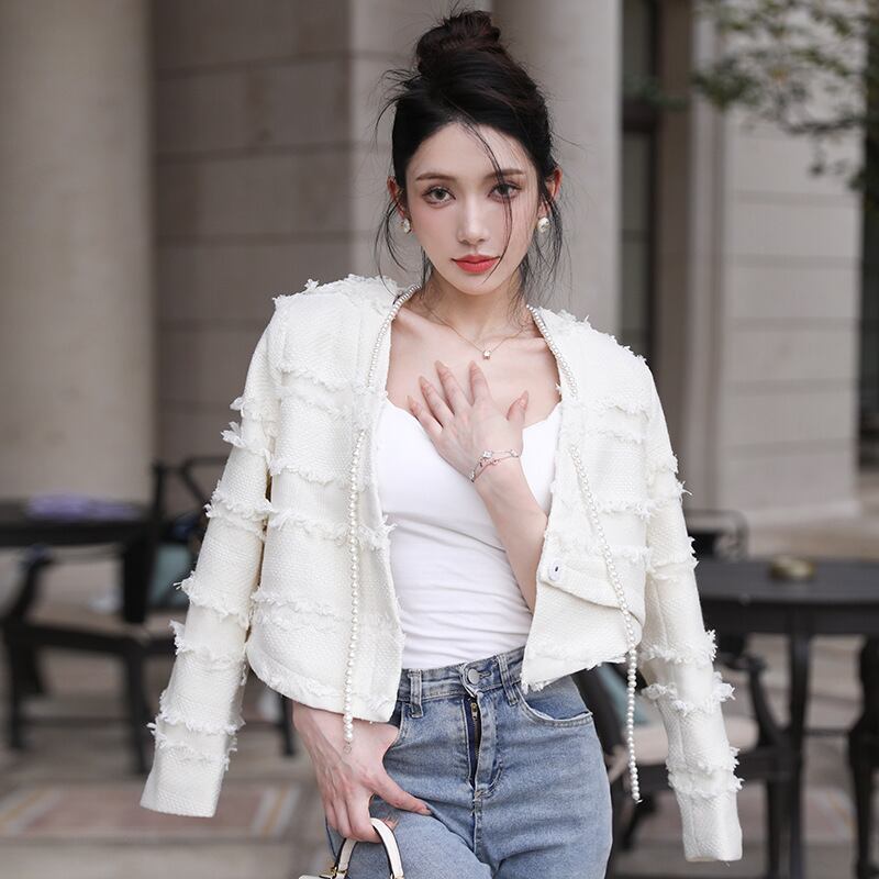 上品なツイード素材にフリンジをあしらった、フェミニンな長袖ジャケット。スリムなシルエットと前開きデザインが、女性らしいラインを美しく引き立てます。