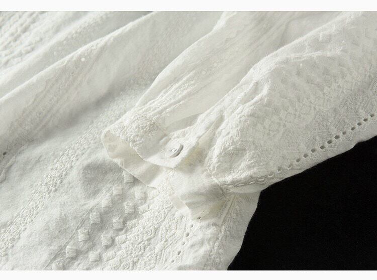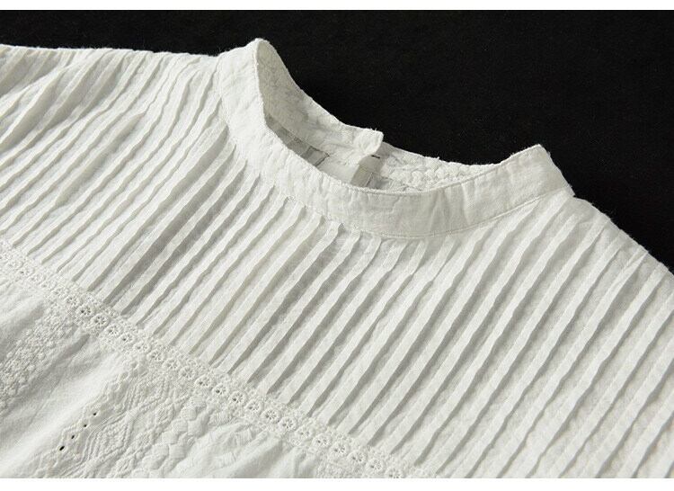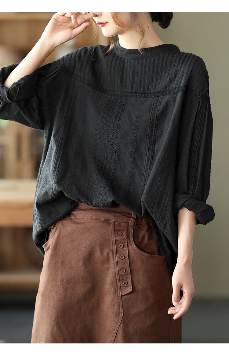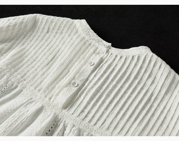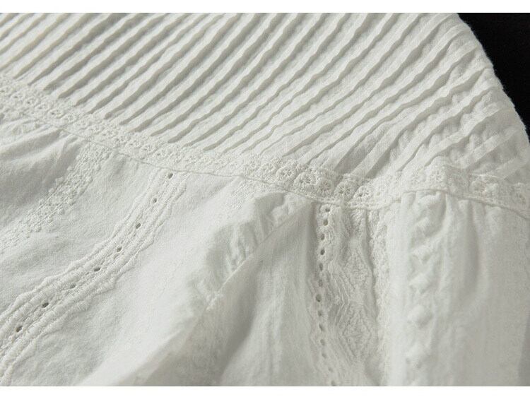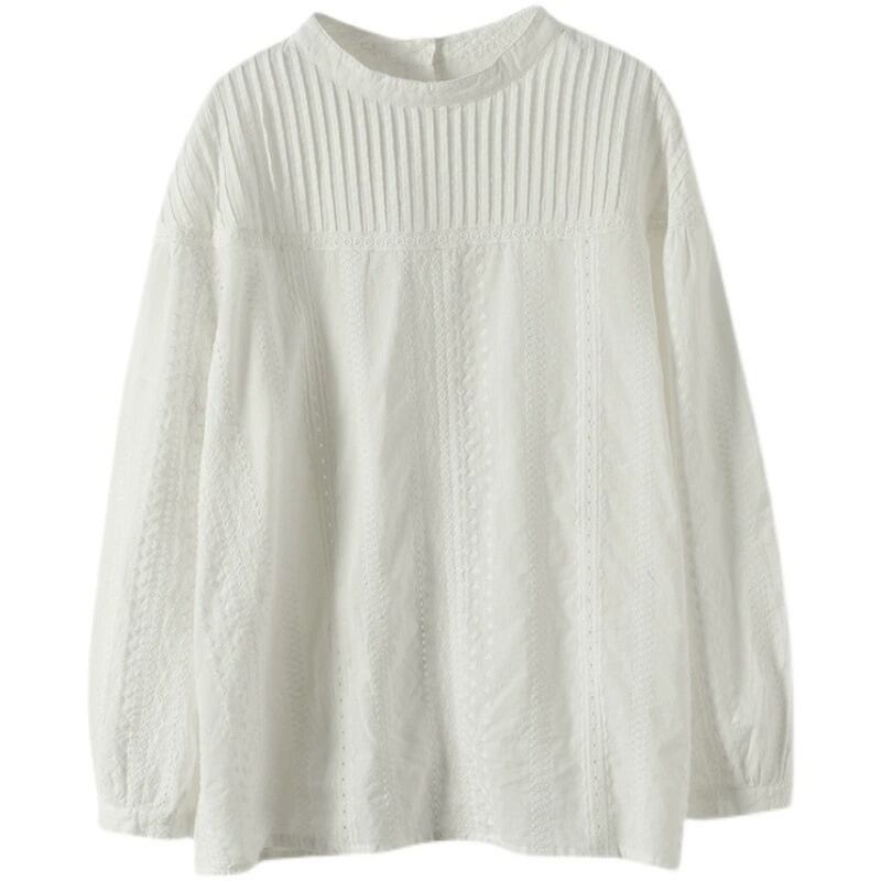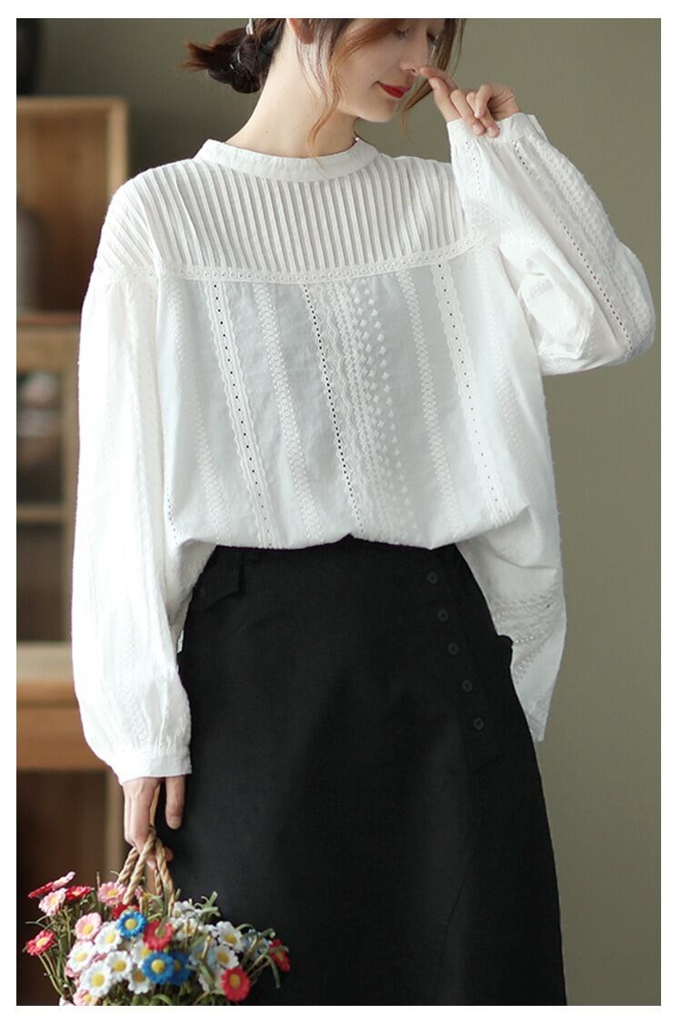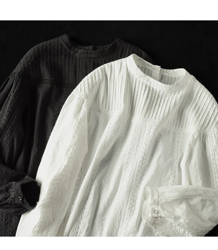 柔らかなプリーツ切り替えと繊細なレースが魅力の長袖ブラウス。