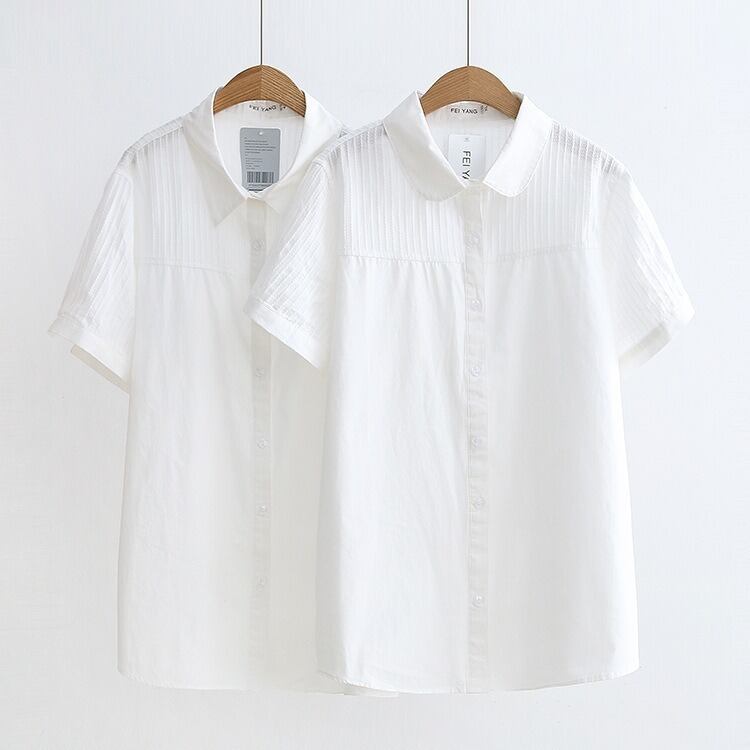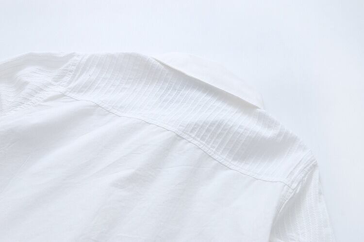 角襟と丸襟にプリーツ切り替えデザインがさりげない個性を添え、シンプルながらもフェミニンな雰囲気を引き立てます。