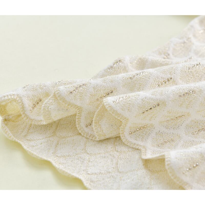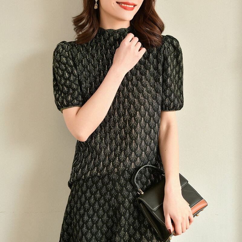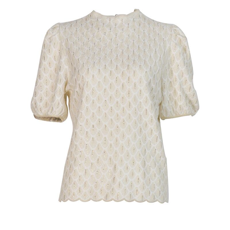 繊細なレース編みが上品な印象を与える、レディース半袖トップス。立体的なパターンと程よい透け感が、軽やかでフェミニンな雰囲気を演出します。