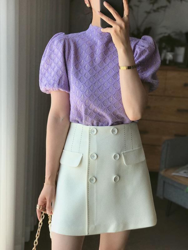 コンパクトなハイネックとパフスリーブが、クラシカルさと女性らしさを絶妙にミックス。デニムやスカートと合わせれば、カジュアルにもきれいめにも自在にコーディネートできます。