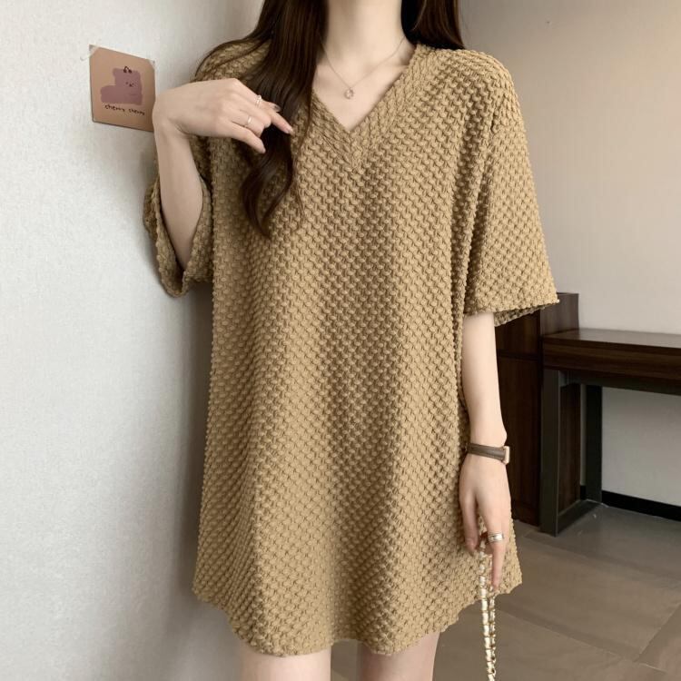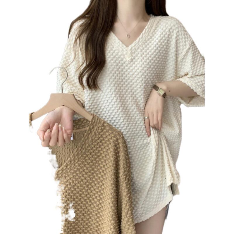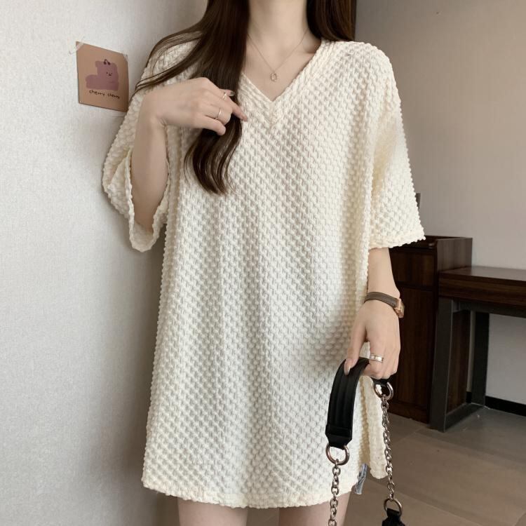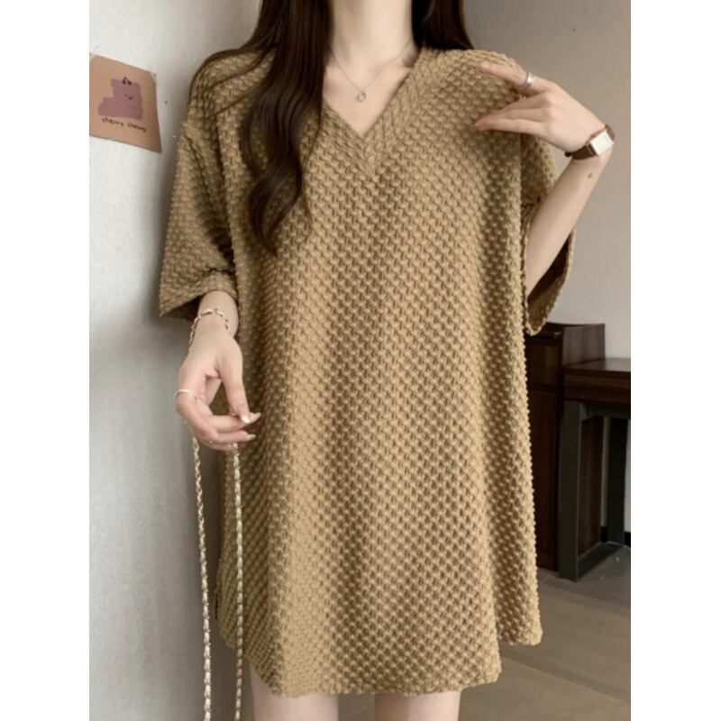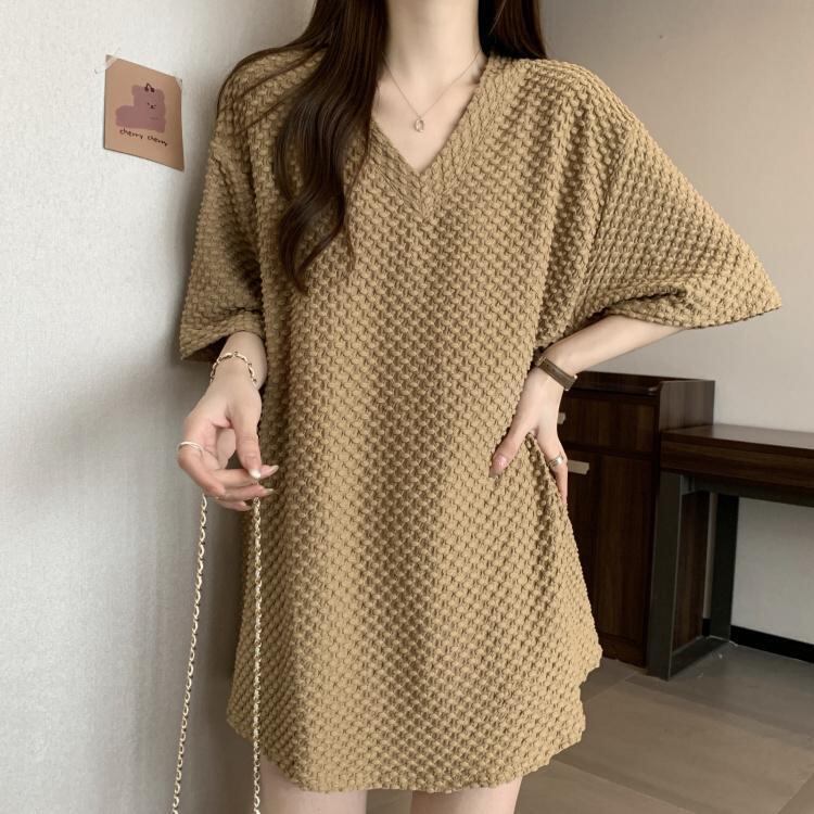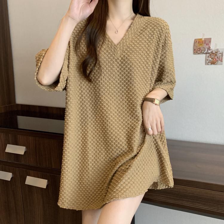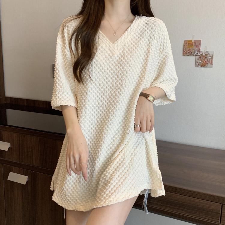 柔らかな凹凸感のあるワッフル生地が特徴の、リラックスムード漂うVネックワンピース。軽やかで肌ざわりの良い素材が、春夏のカジュアルスタイルにぴったりです。