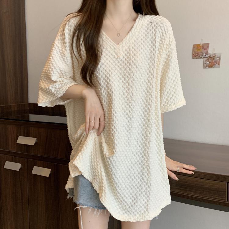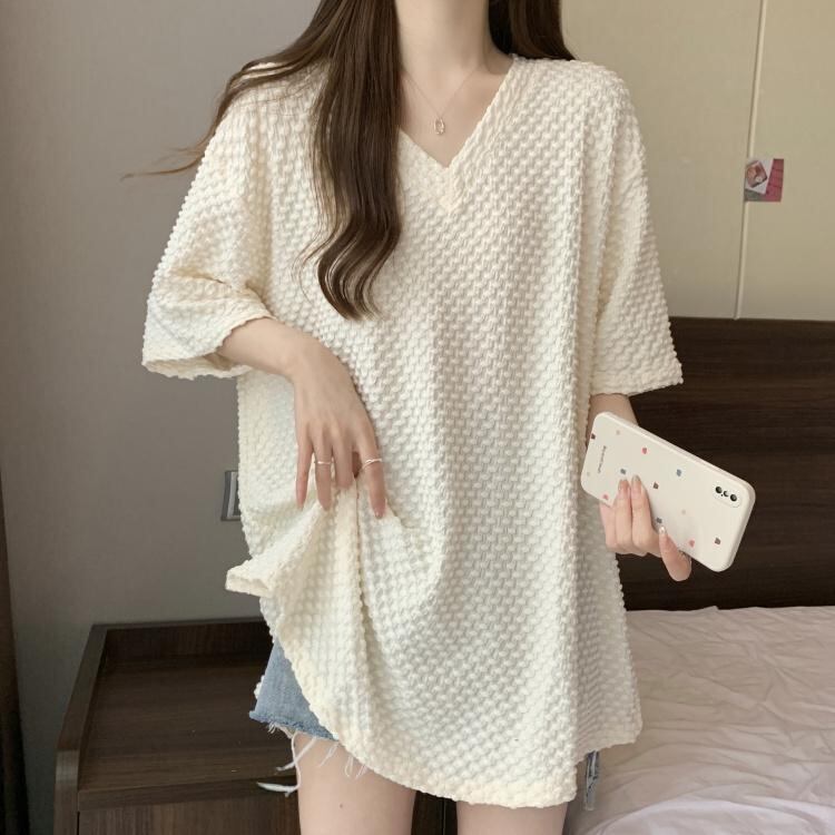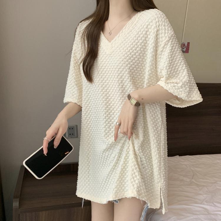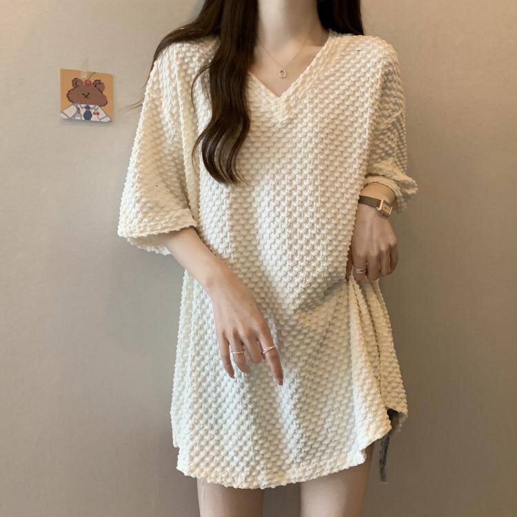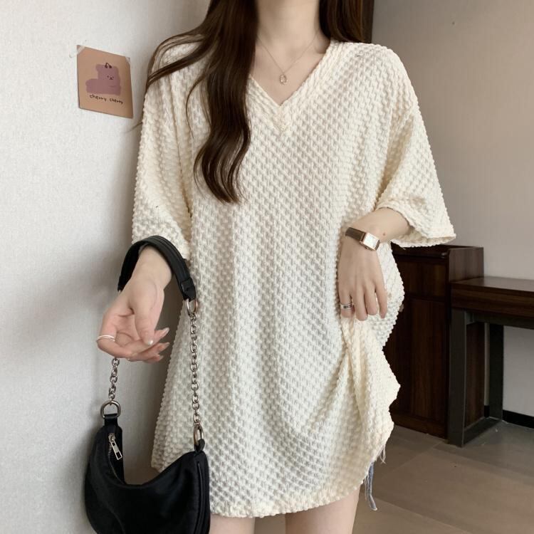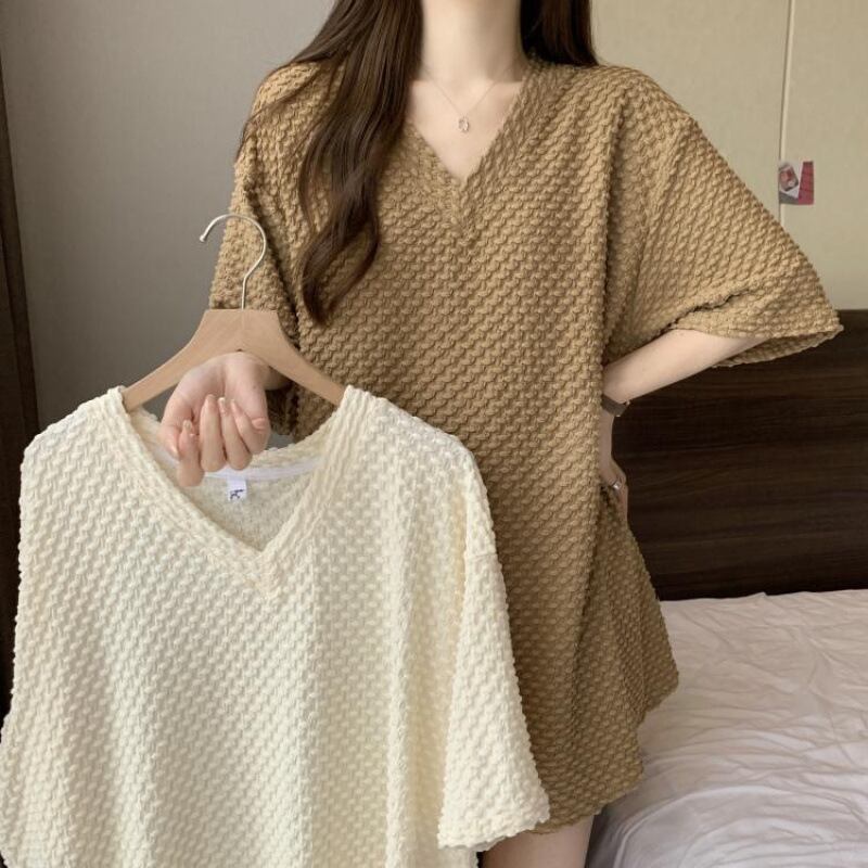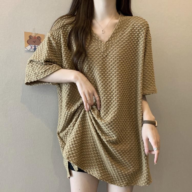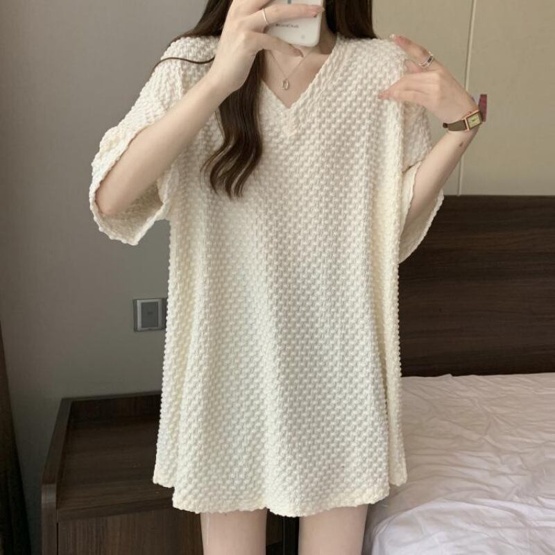 柔らかな凹凸感のあるワッフル生地が特徴の、リラックスムード漂うVネックワンピース。軽やかで肌ざわりの良い素材が、春夏のカジュアルスタイルにぴったりです。