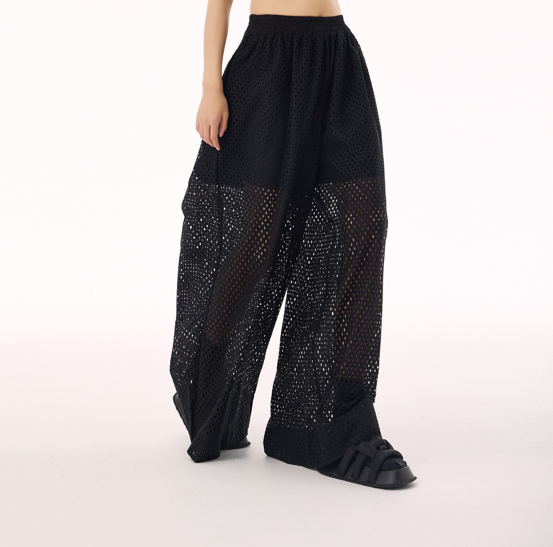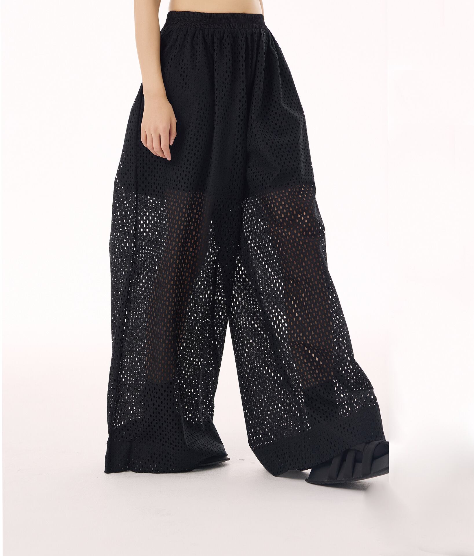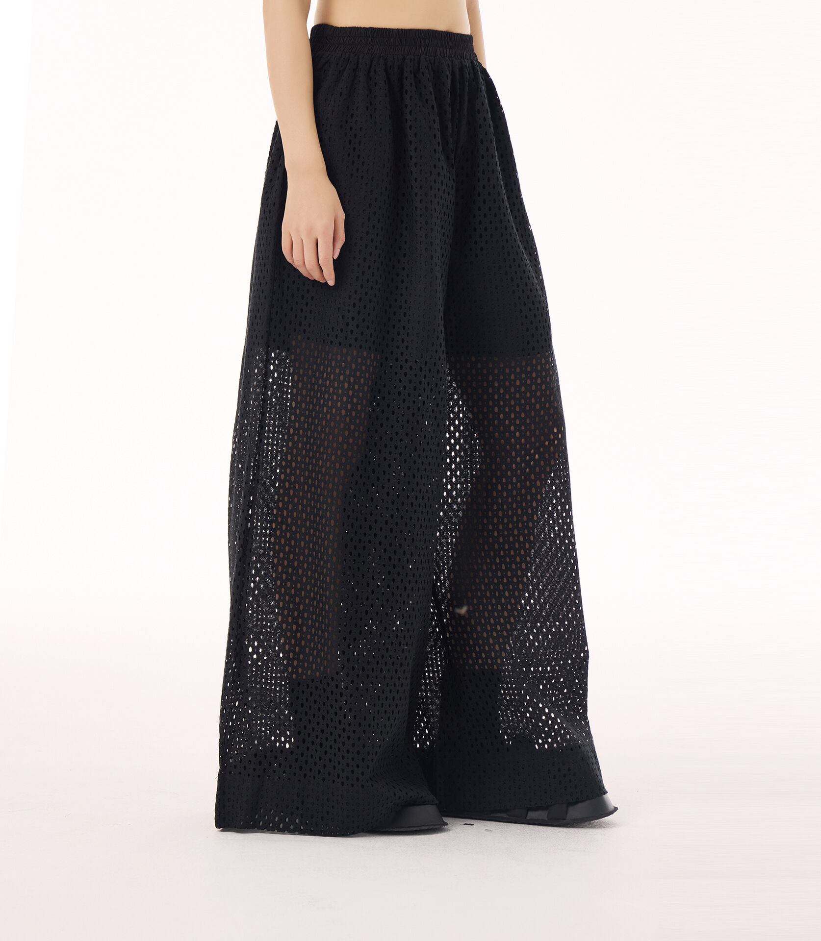 軽やかな透け感が魅力のロングパンツ。ワイドな裾とハイウエストデザインで、脚長効果を引き出しながら抜け感のある大人カジュアルを演出します。