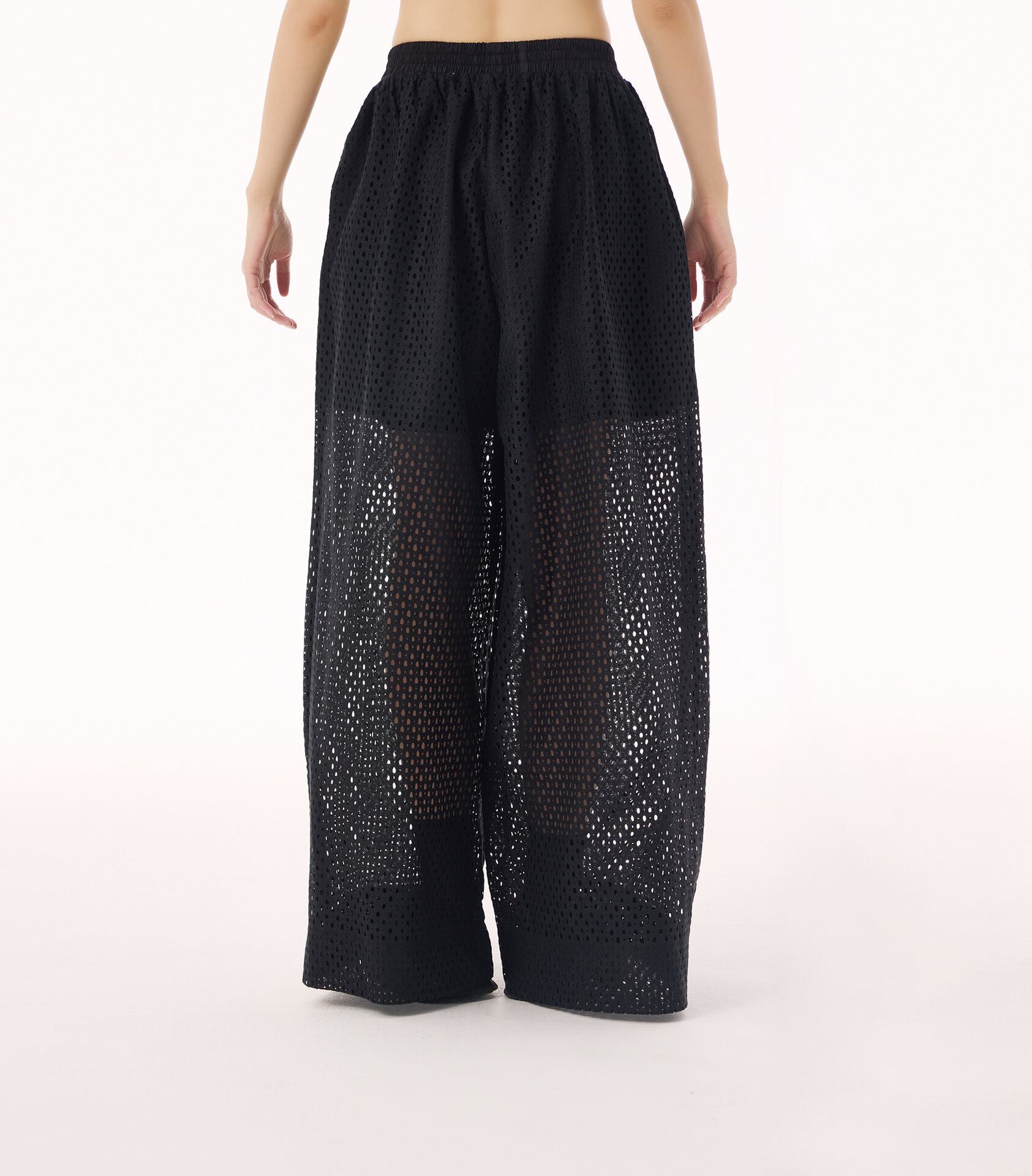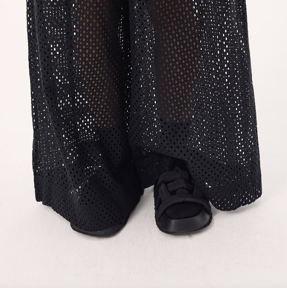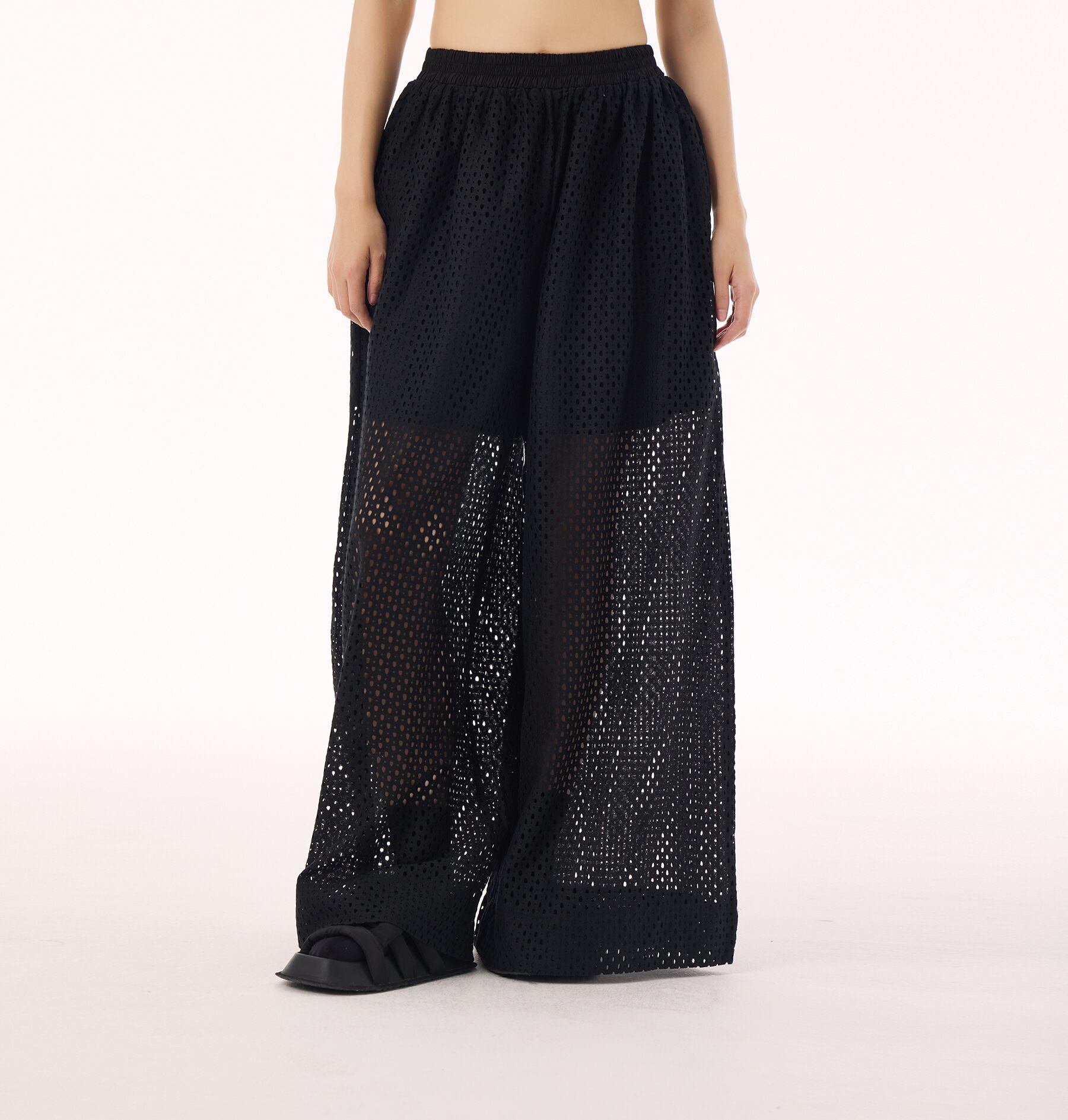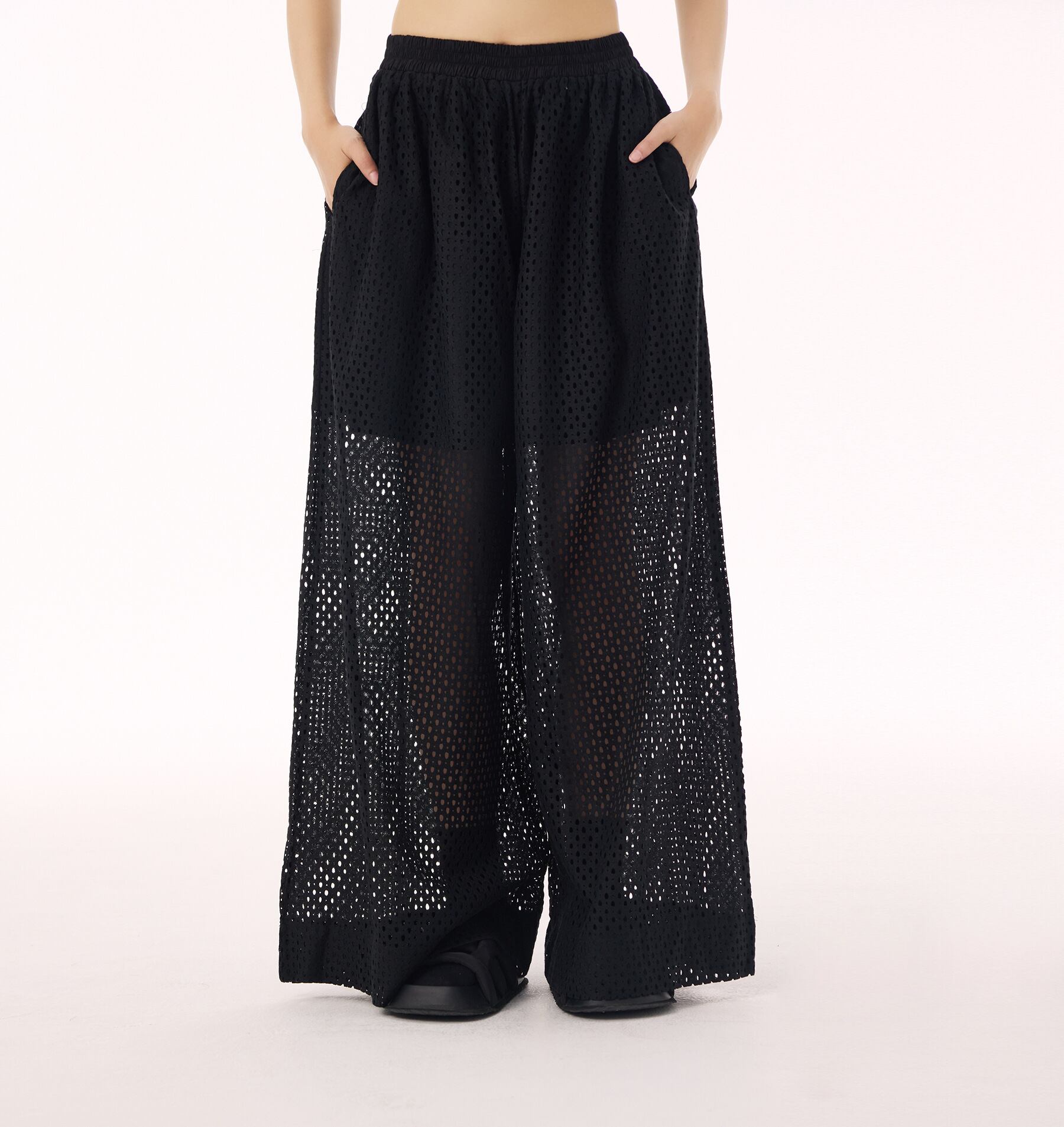 軽やかな透け感が魅力のロングパンツ。ワイドな裾とハイウエストデザインで、脚長効果を引き出しながら抜け感のある大人カジュアルを演出します。