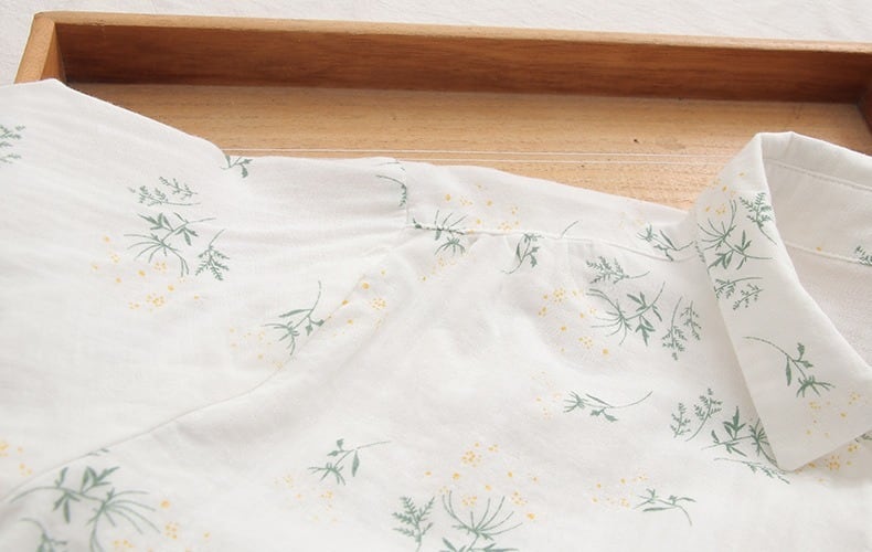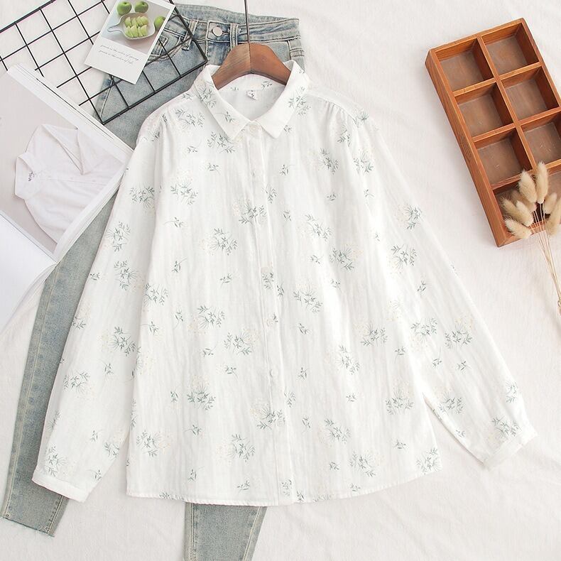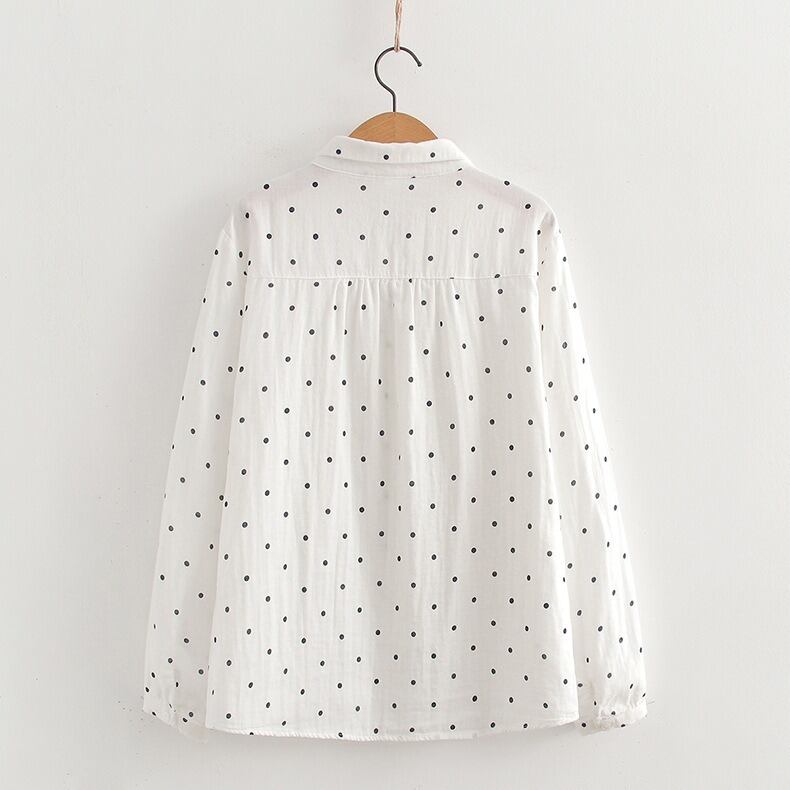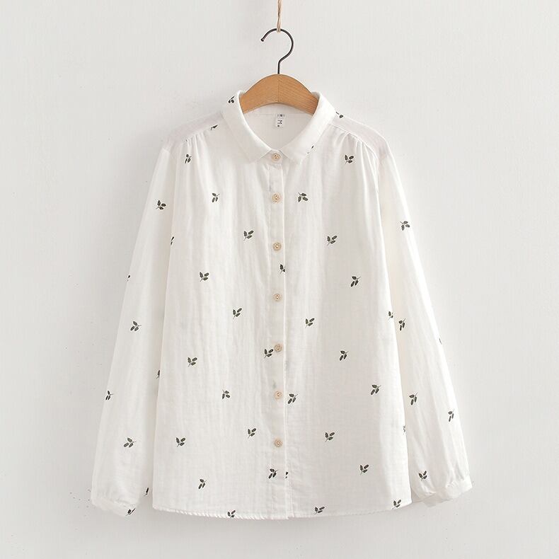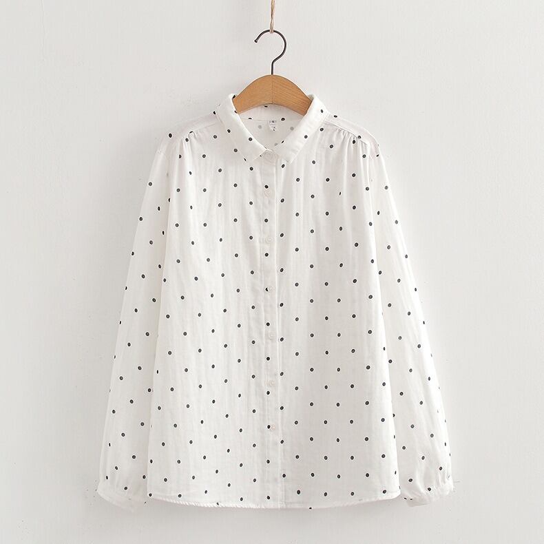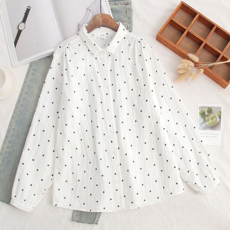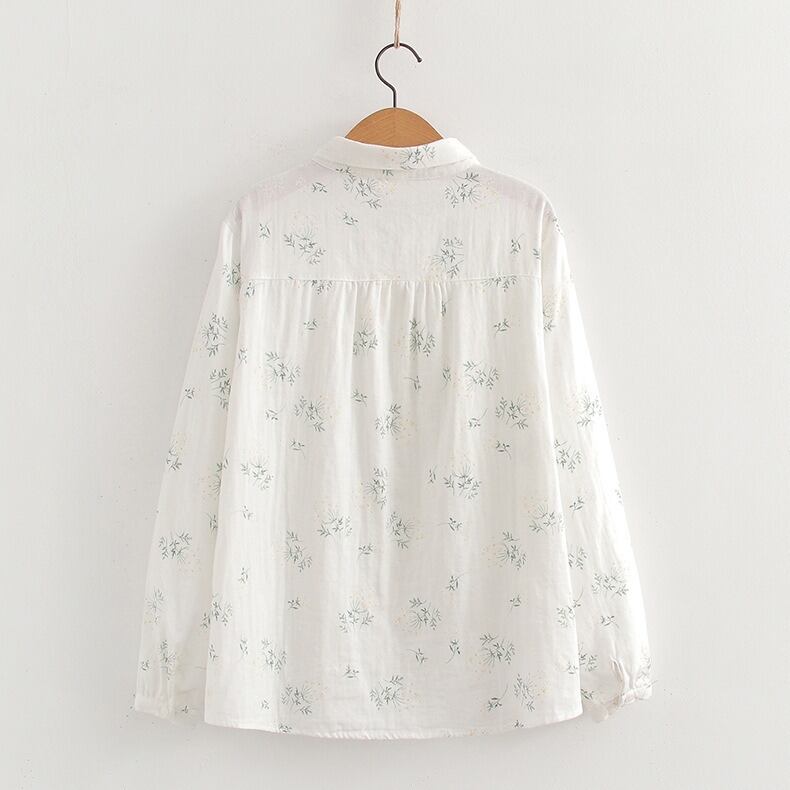 可憐な花柄と上品なドット柄が選べる、前開きタイプの襟付き長袖シャツブラウスです。