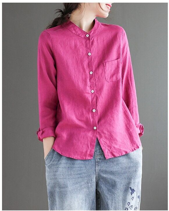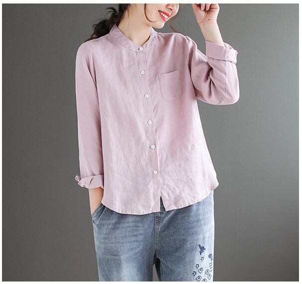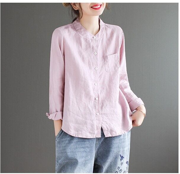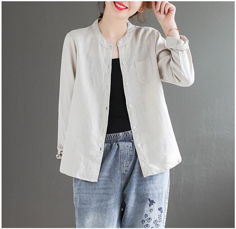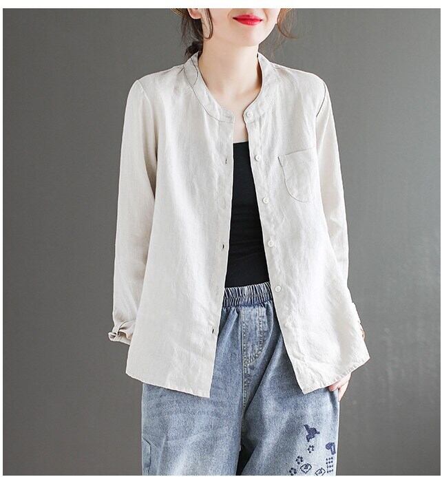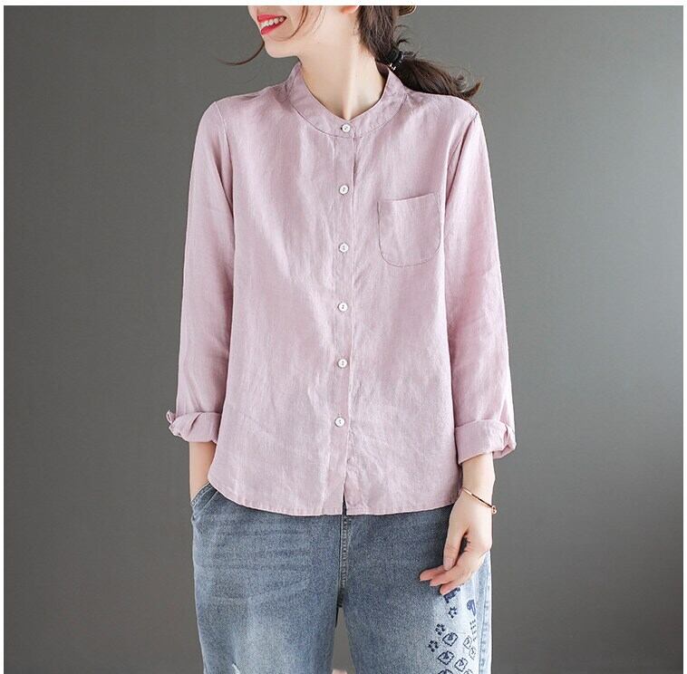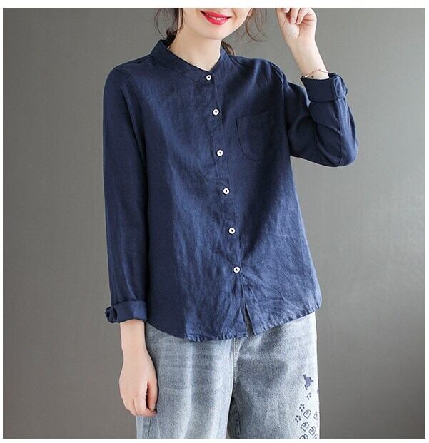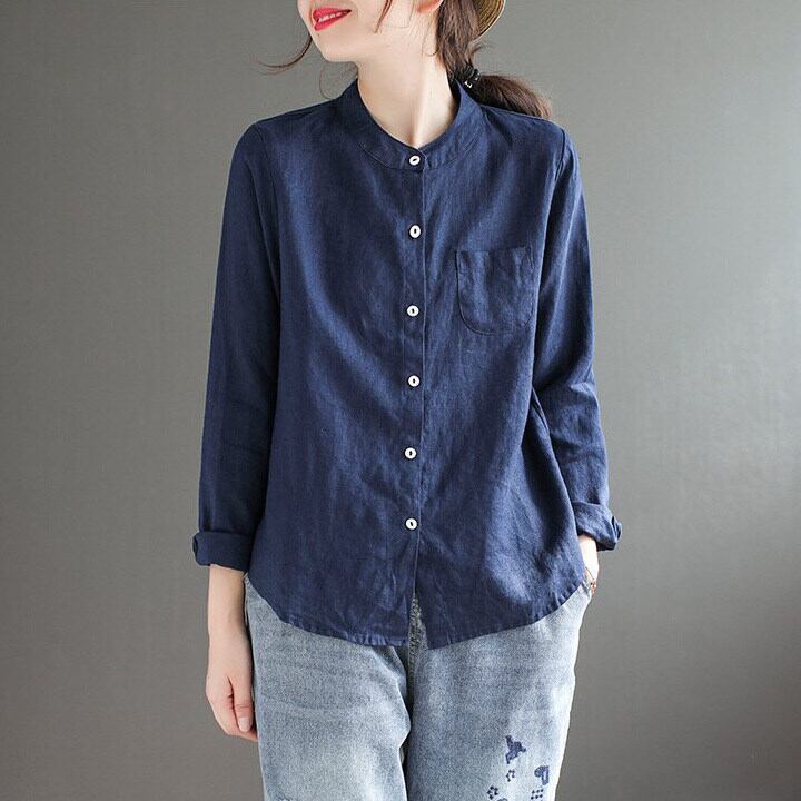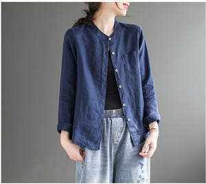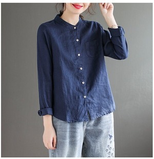 スタンドカラーがすっきりとした印象を与える、前開きタイプの長袖シャツブラウスです。
