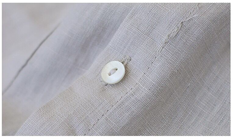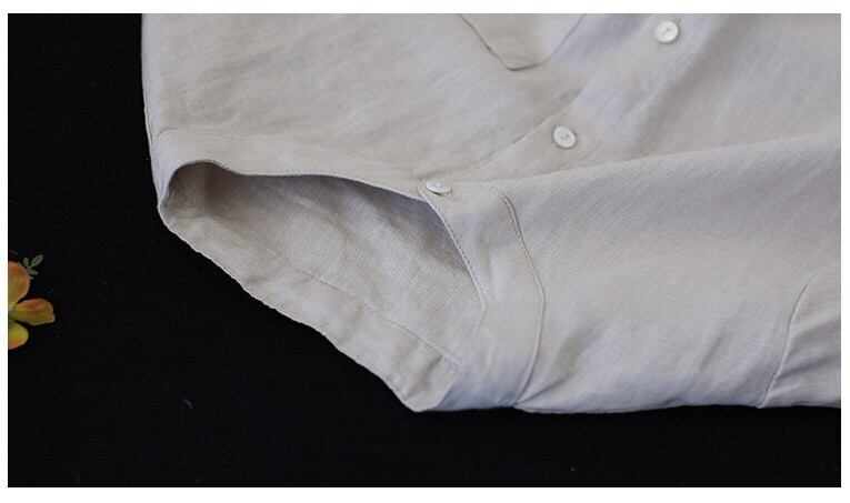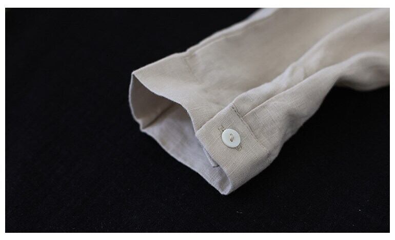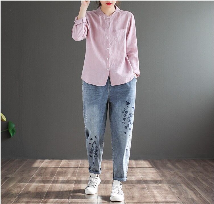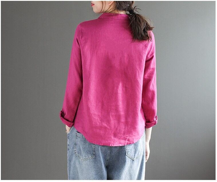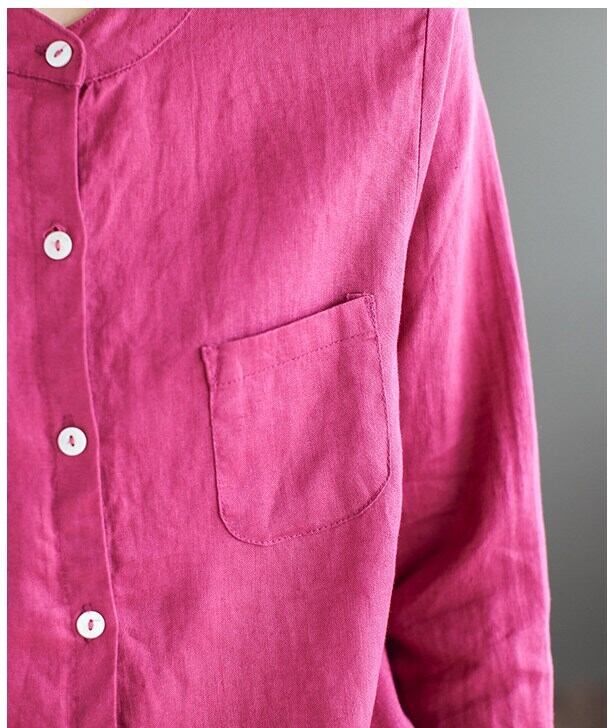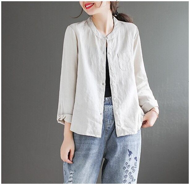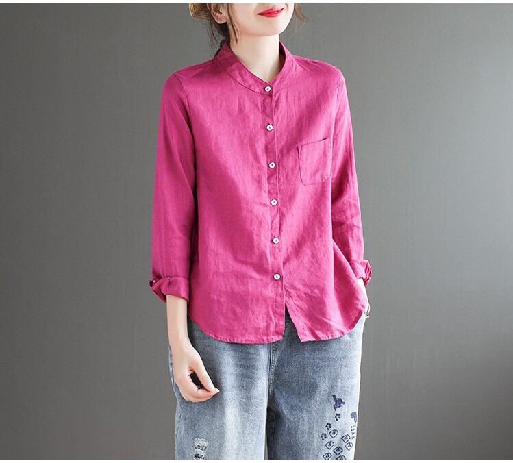 スタンドカラーがすっきりとした印象を与える、前開きタイプの長袖シャツブラウスです。