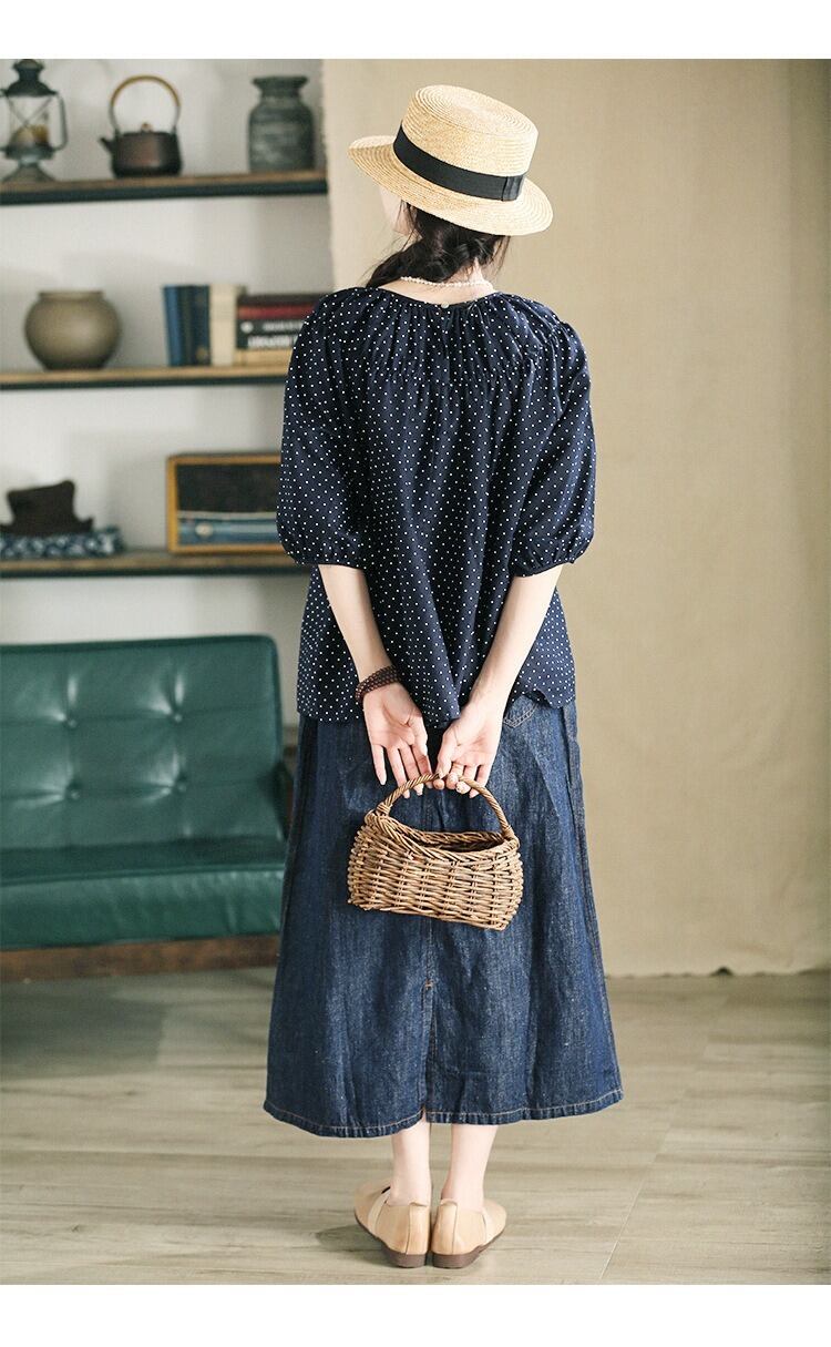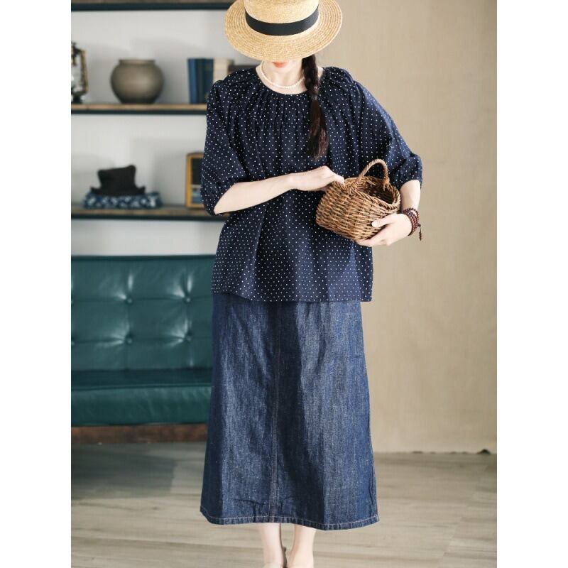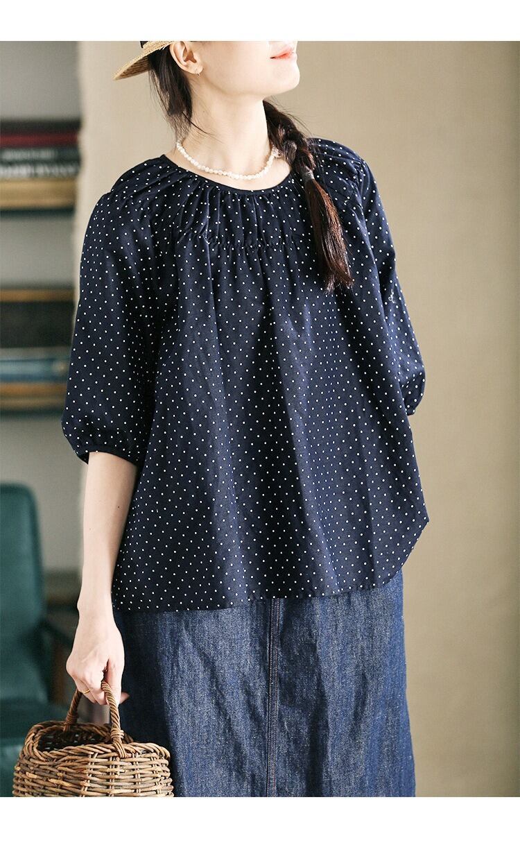 シンプルでありながら、こなれ感を演出するドット柄のトップスです。