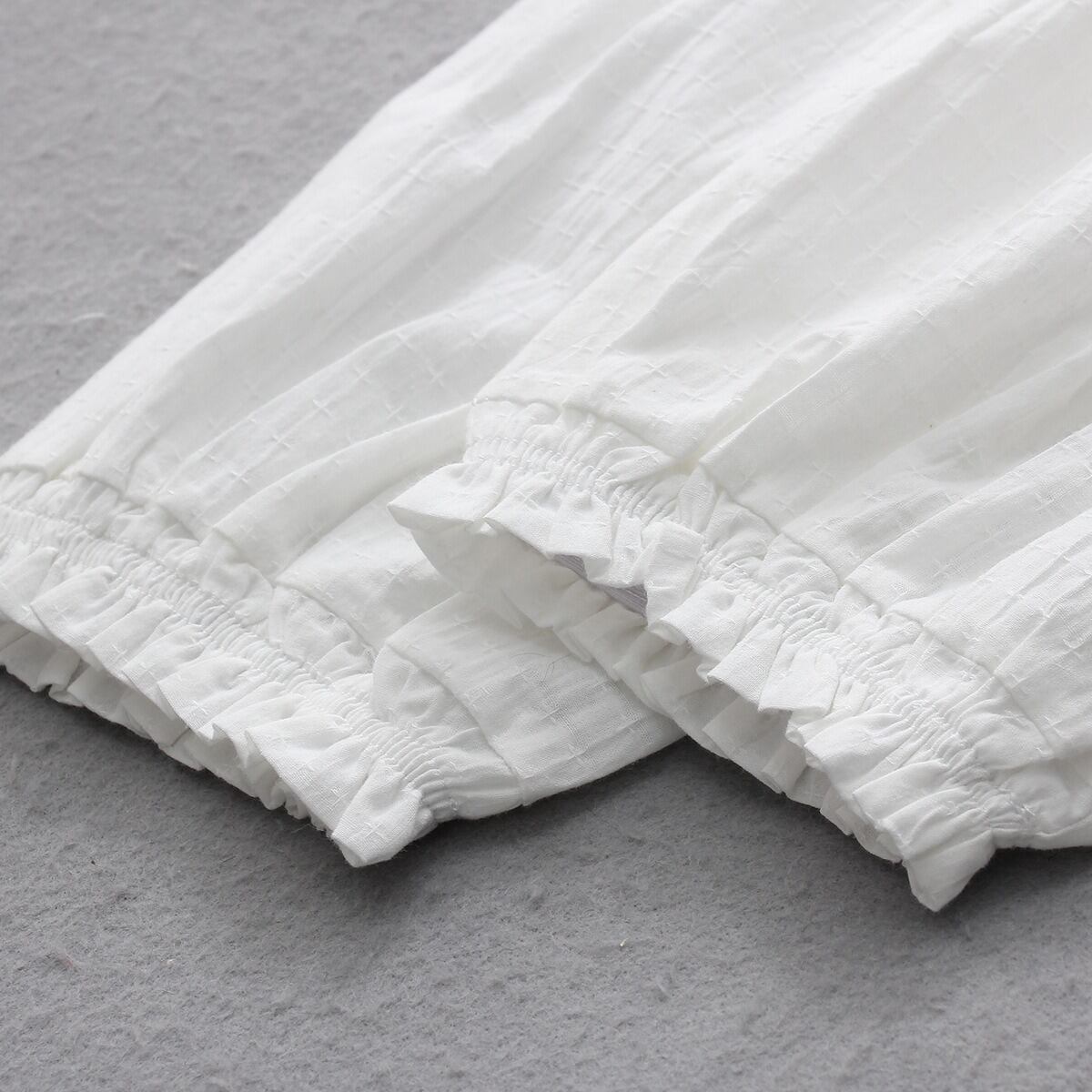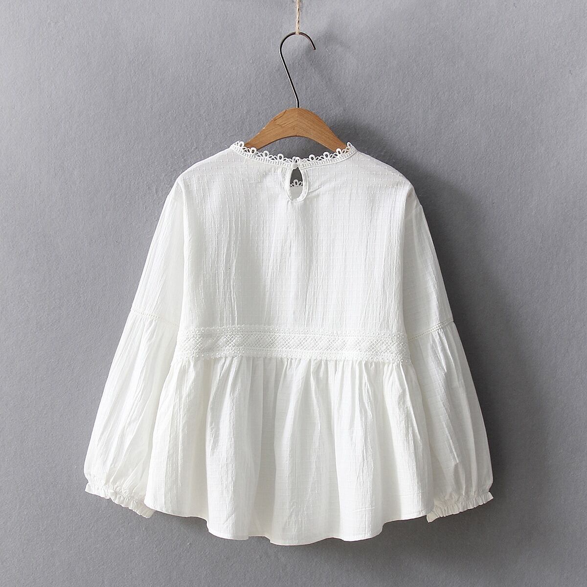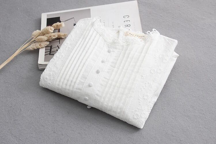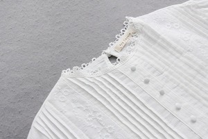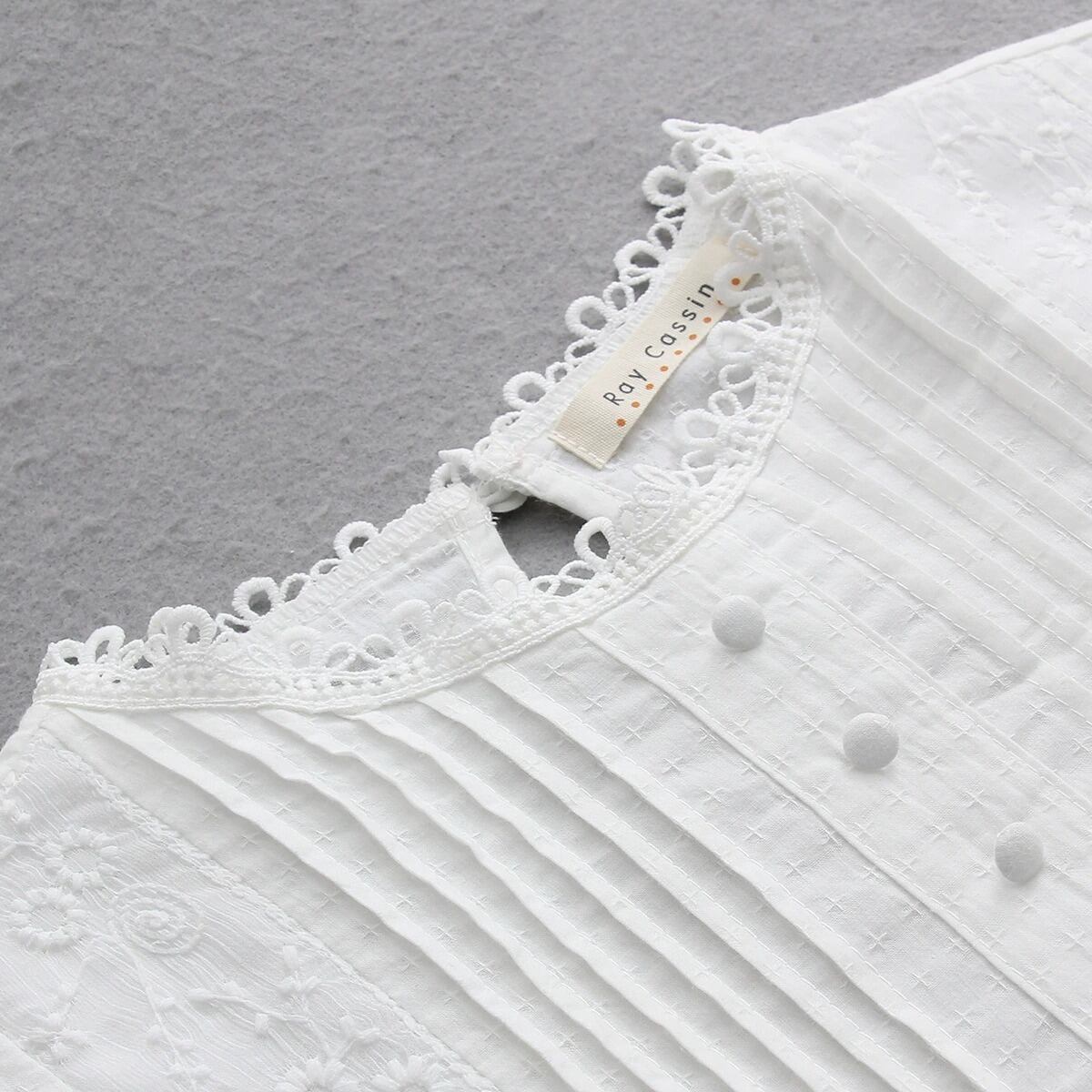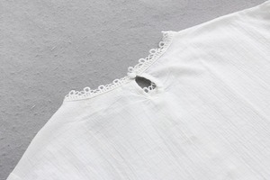 柔らかなホワイトカラーが映える、ノーカラーの長袖ブラウスです。