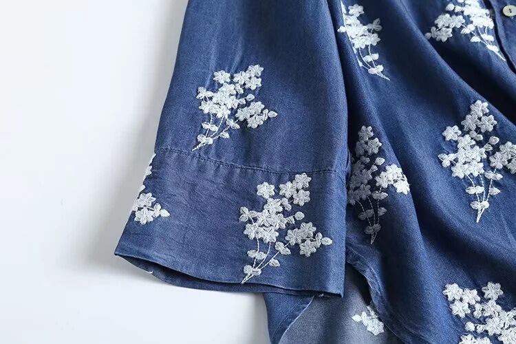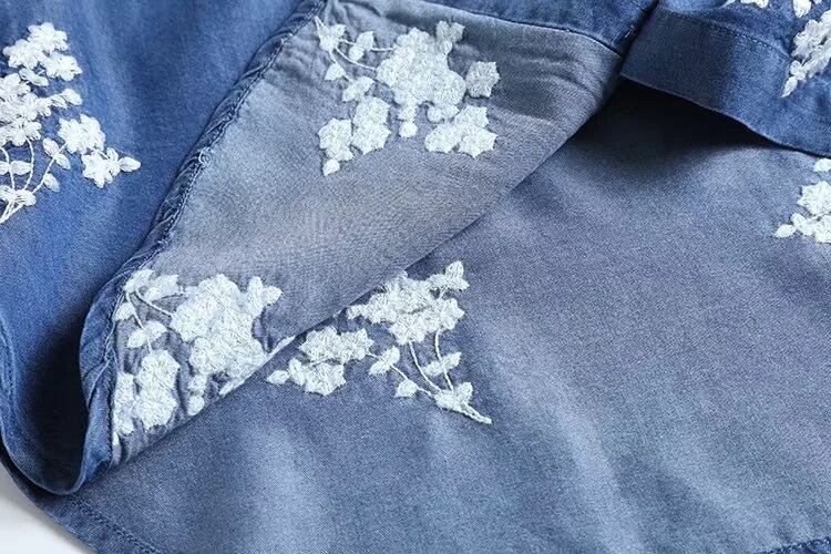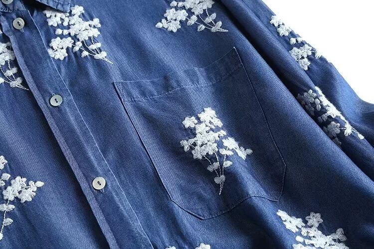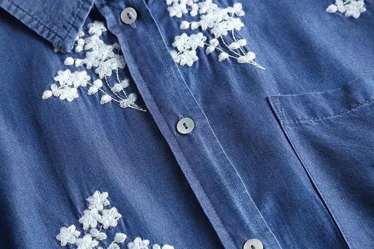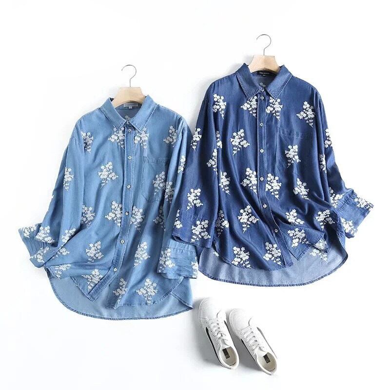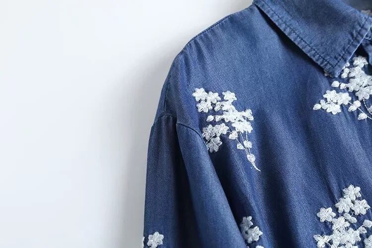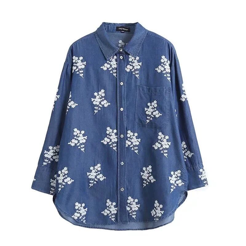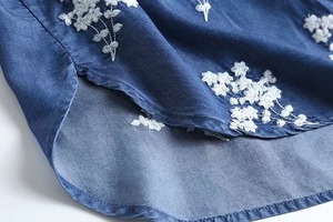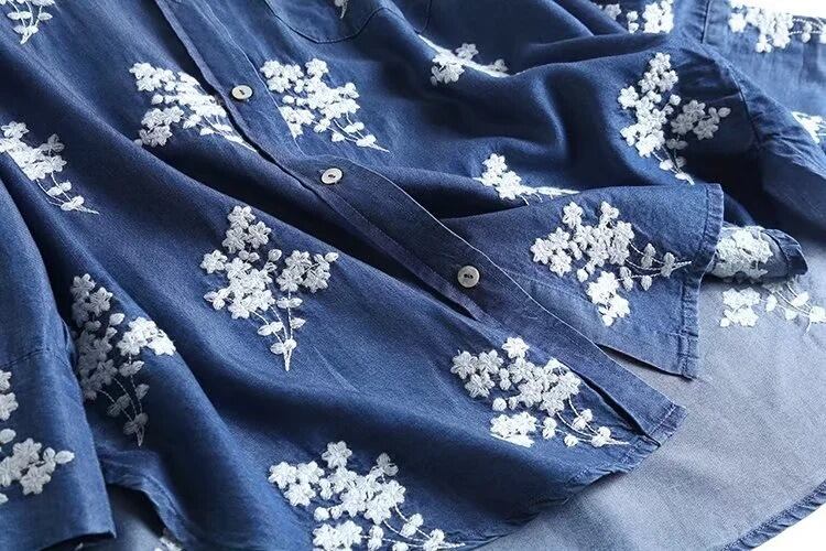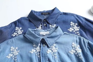 柔らかなデニム素材に花柄刺繍をあしらった、前開き長袖シャツです。