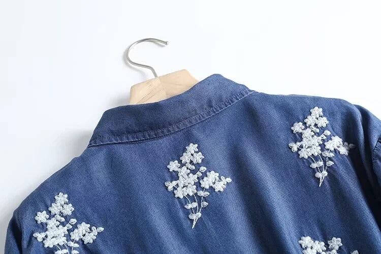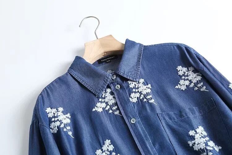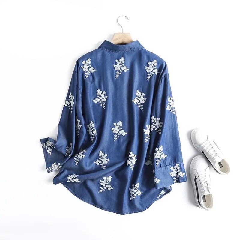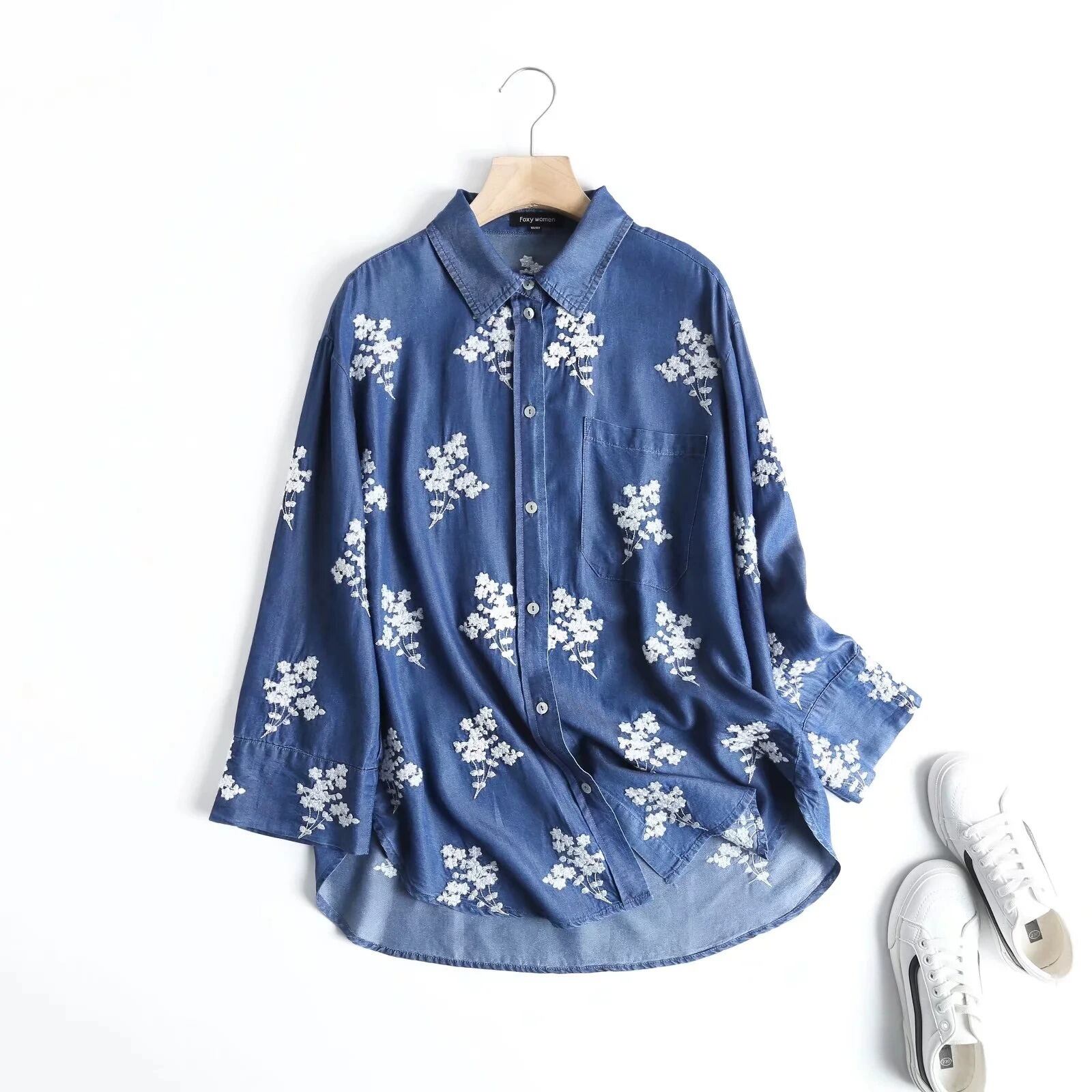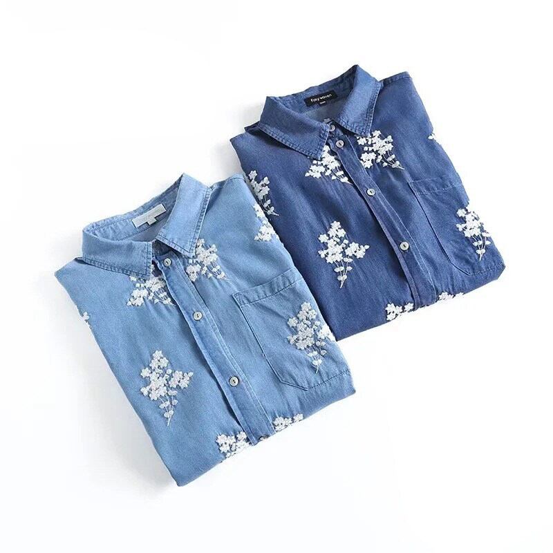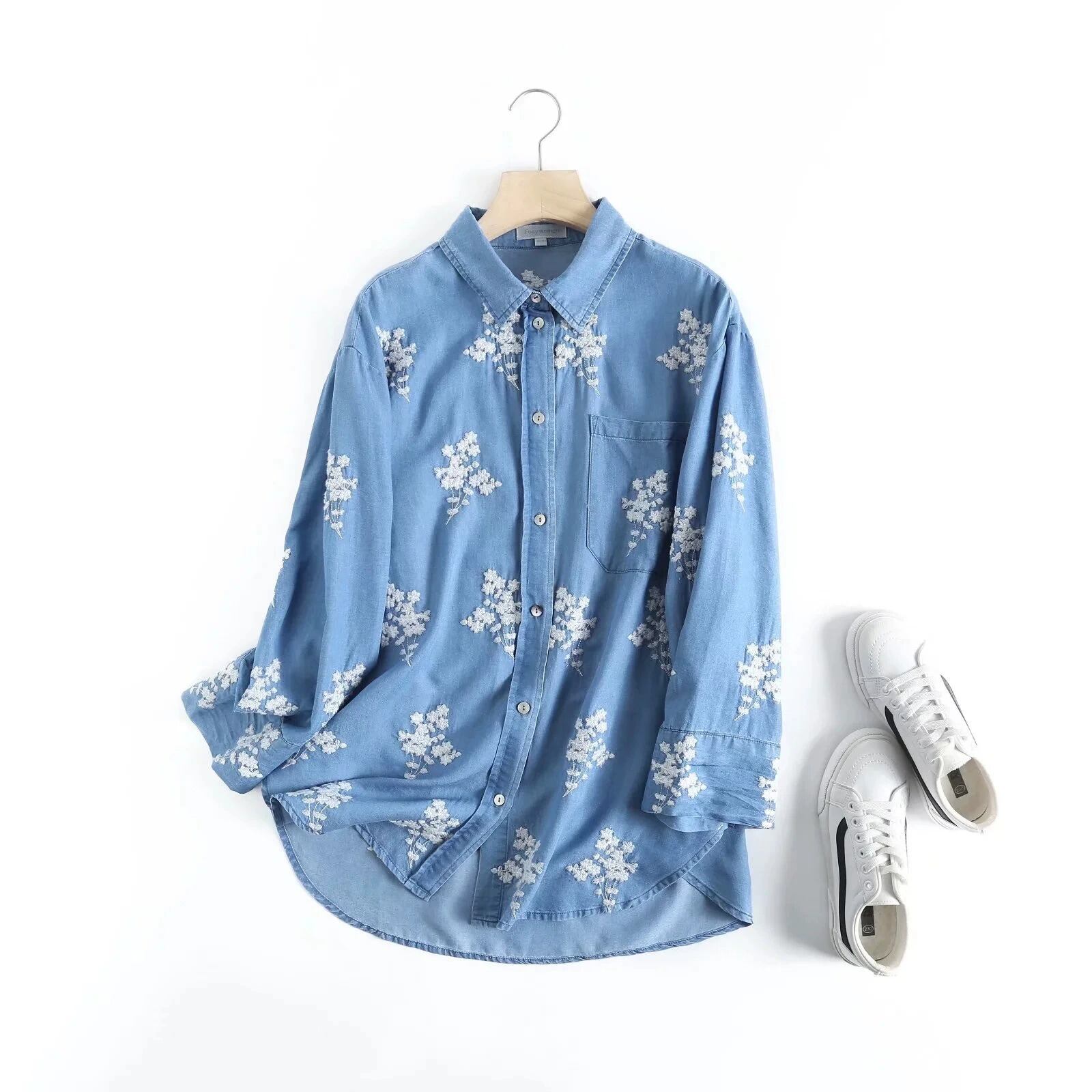 柔らかなデニム素材に花柄刺繍をあしらった、前開き長袖シャツです。