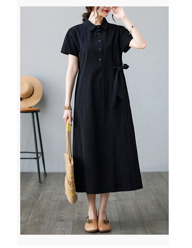 ポロカラーとアシンメトリーデザインが、シンプルながらもこなれ感を演出し、サイドリボンのウエストマークがフェミニンな印象を与えます。