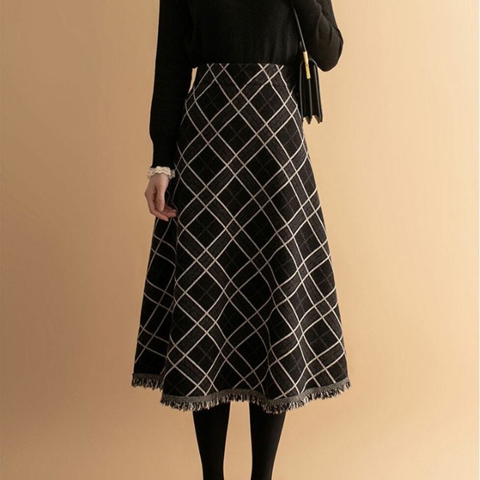 クラシカルなチェック柄に裾のフリンジがアクセントのAラインスカート。鮮度をもたらし無難にならないキレイめスタイル。日常と非日常を行き来きできるふり幅の広い1枚
