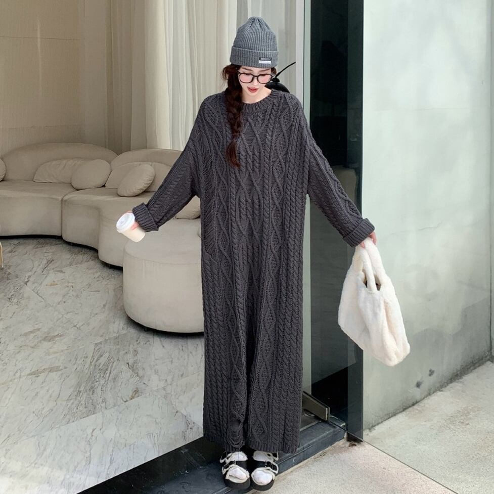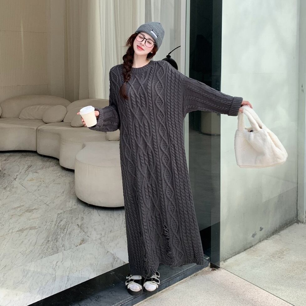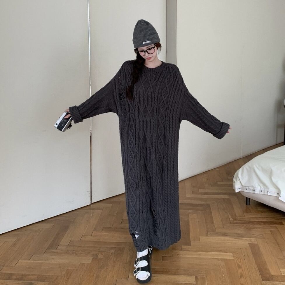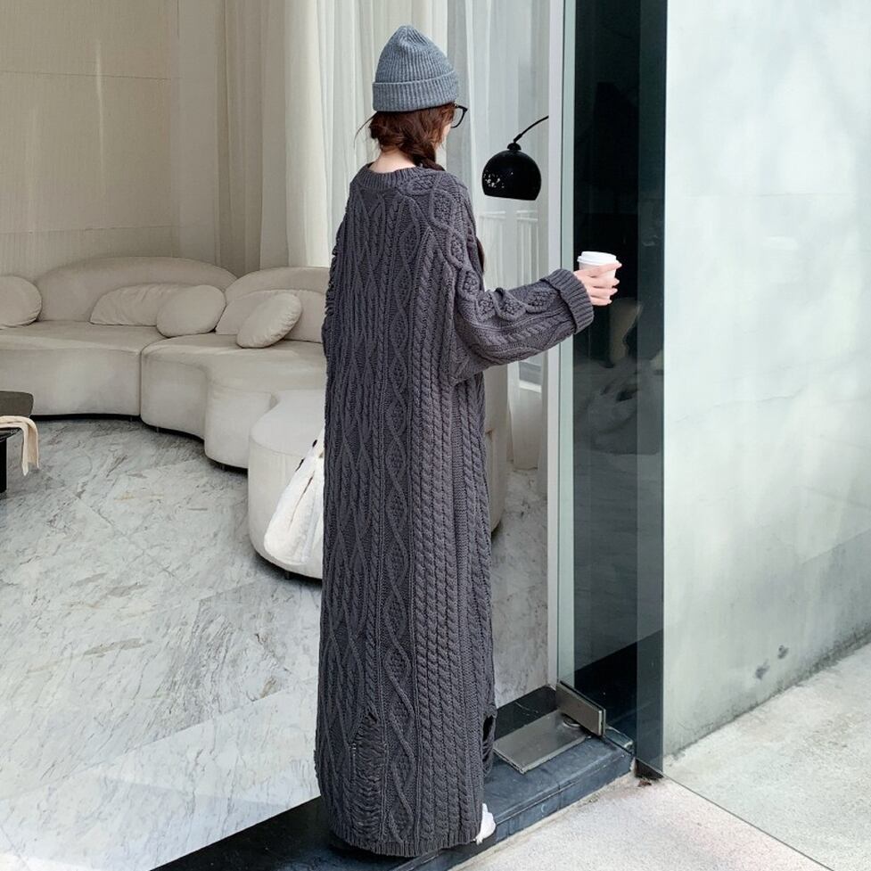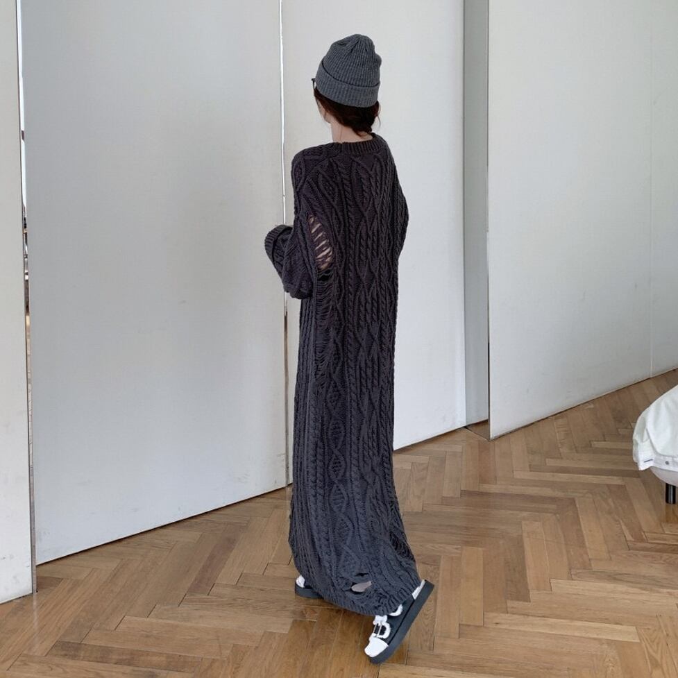 ベーシックなオーバーサイズのケーブルニットロングワンピースにほつれたダメージ加工がアクセントになったデザイン。鮮度をもたらし無難にならないキレイめスタイル。日常と非日常を行き来きできるふり幅の広い1枚