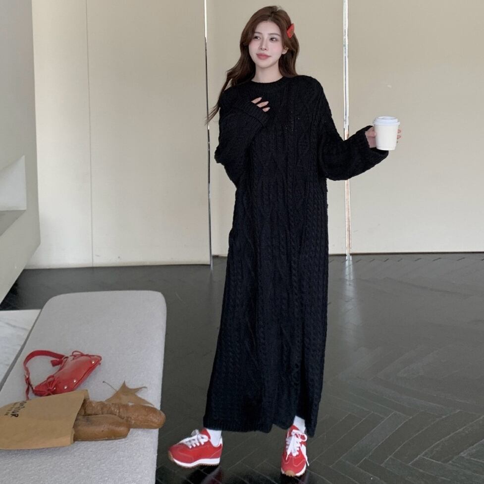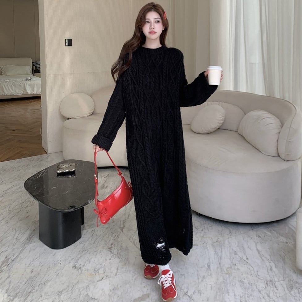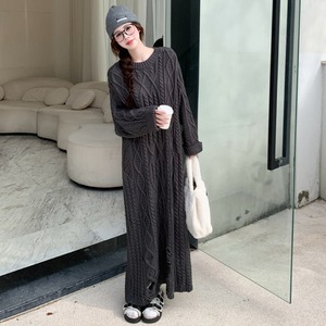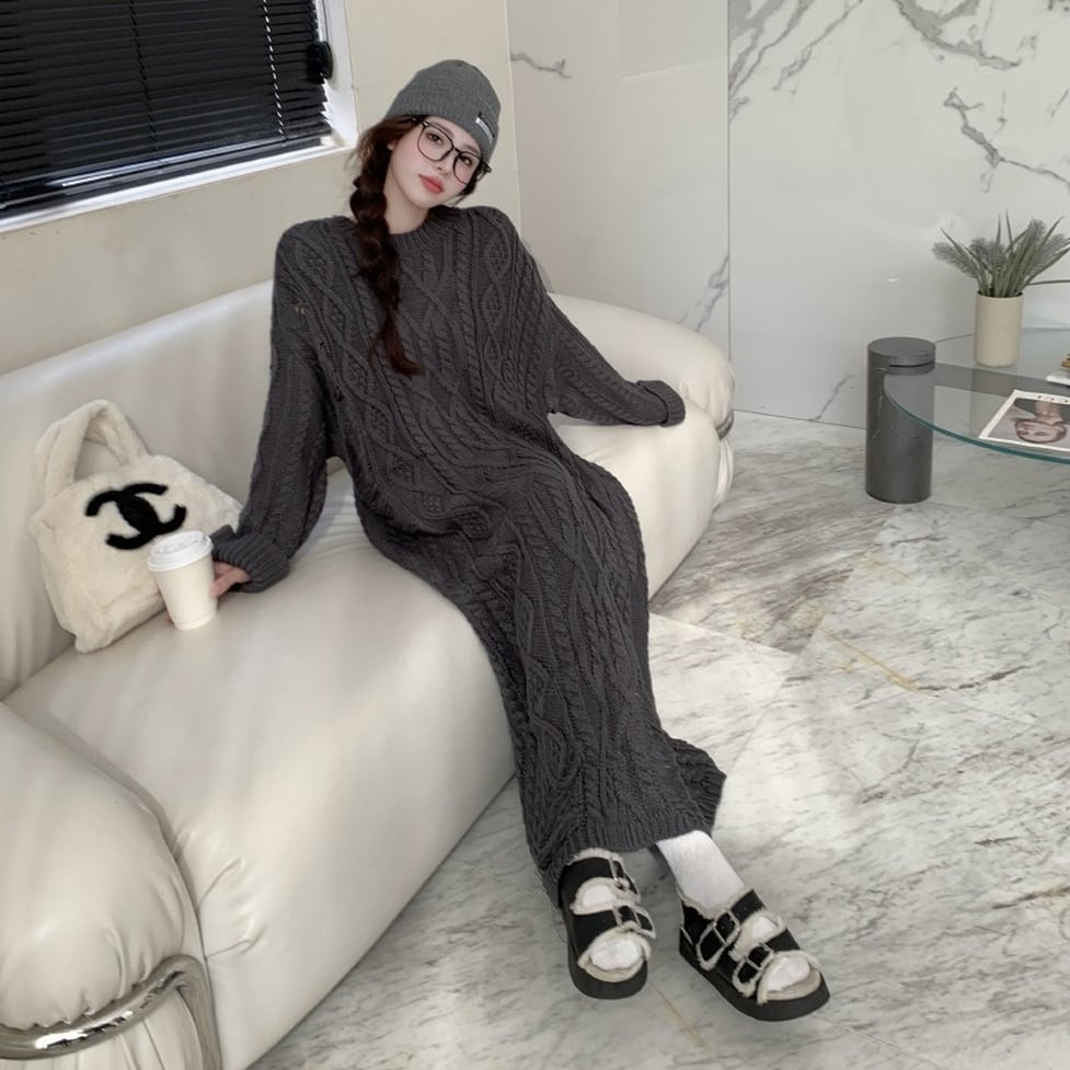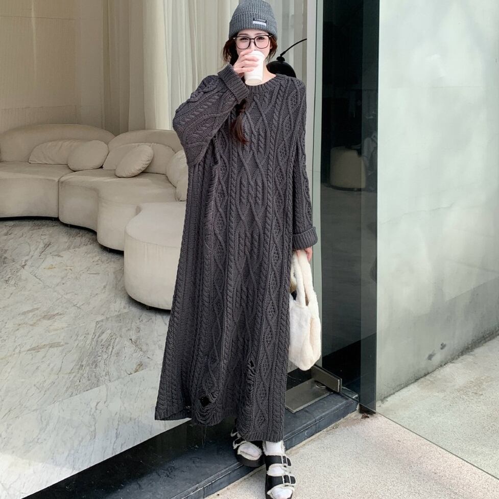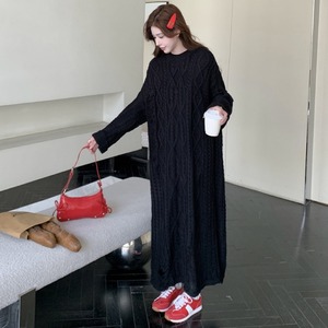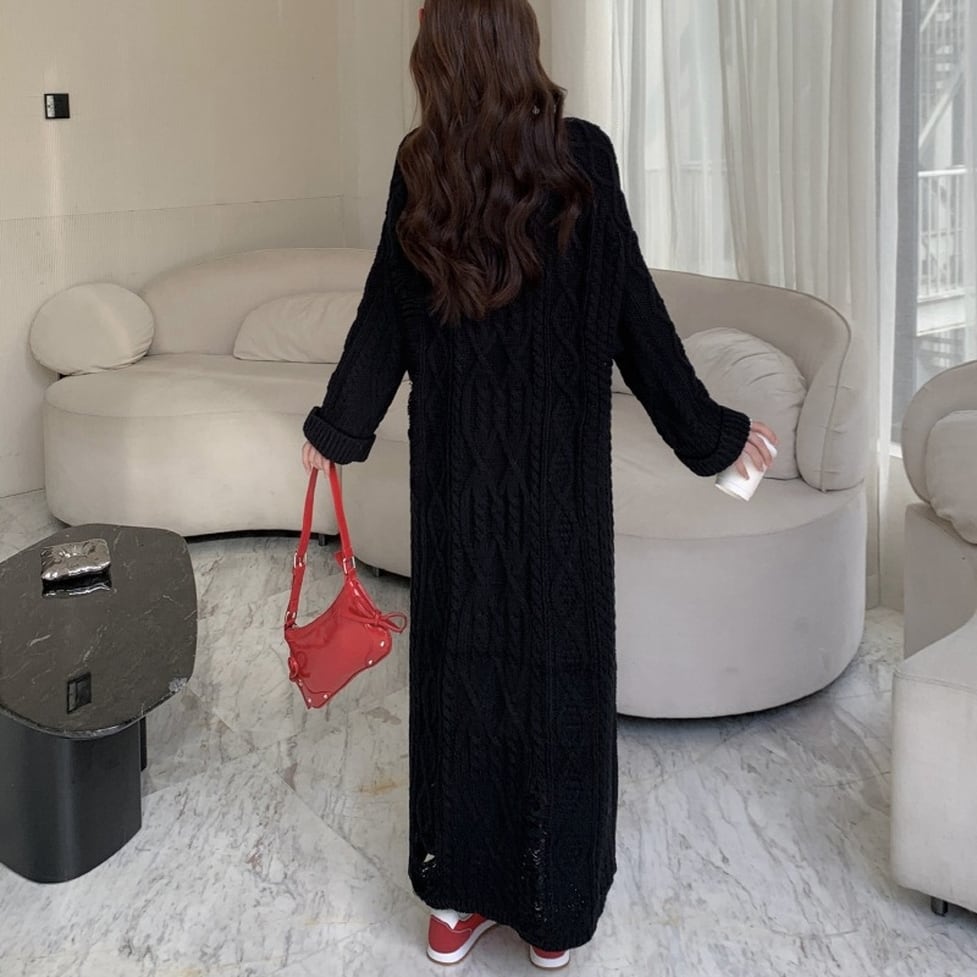 ベーシックなオーバーサイズのケーブルニットロングワンピースにほつれたダメージ加工がアクセントになったデザイン。鮮度をもたらし無難にならないキレイめスタイル。日常と非日常を行き来きできるふり幅の広い1枚