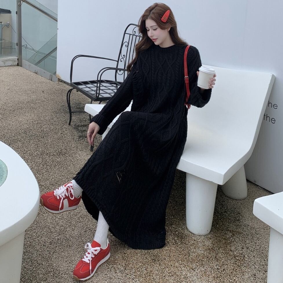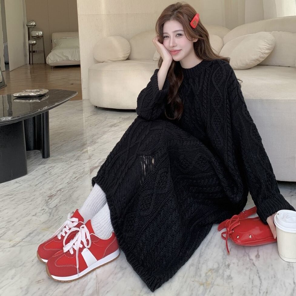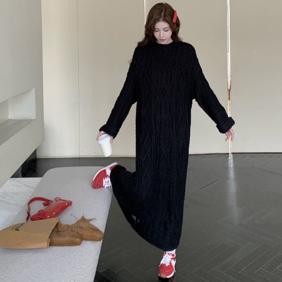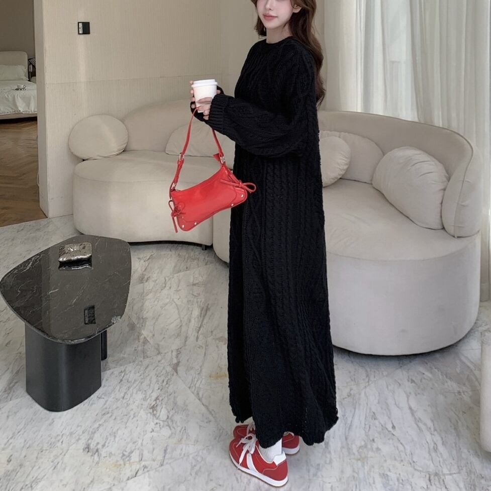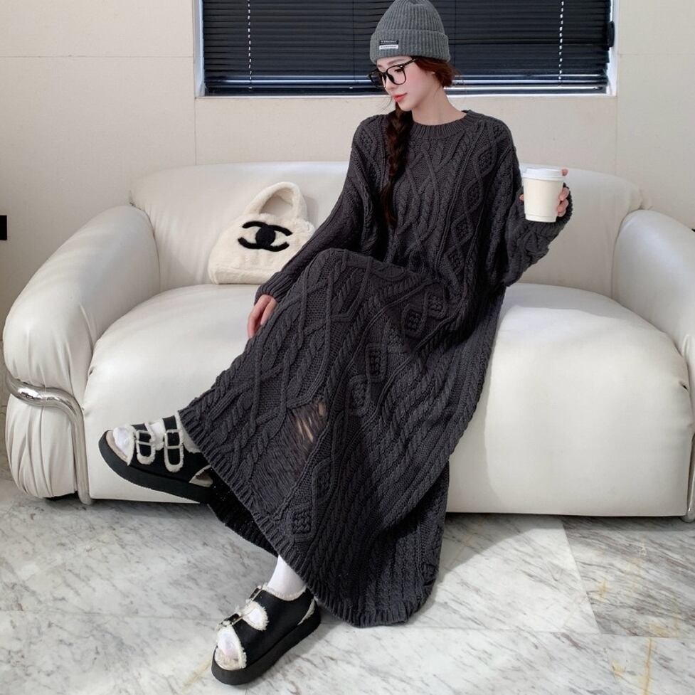 ベーシックなオーバーサイズのケーブルニットロングワンピースにほつれたダメージ加工がアクセントになったデザイン。鮮度をもたらし無難にならないキレイめスタイル。日常と非日常を行き来きできるふり幅の広い1枚