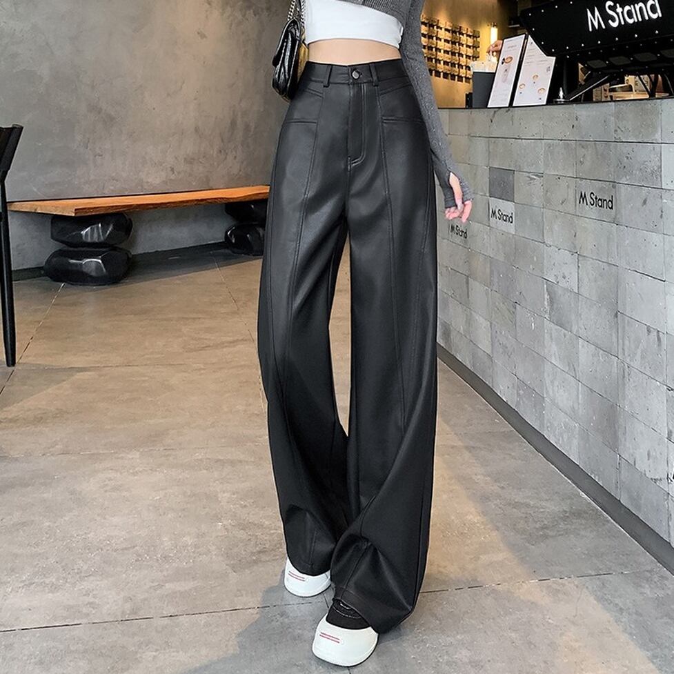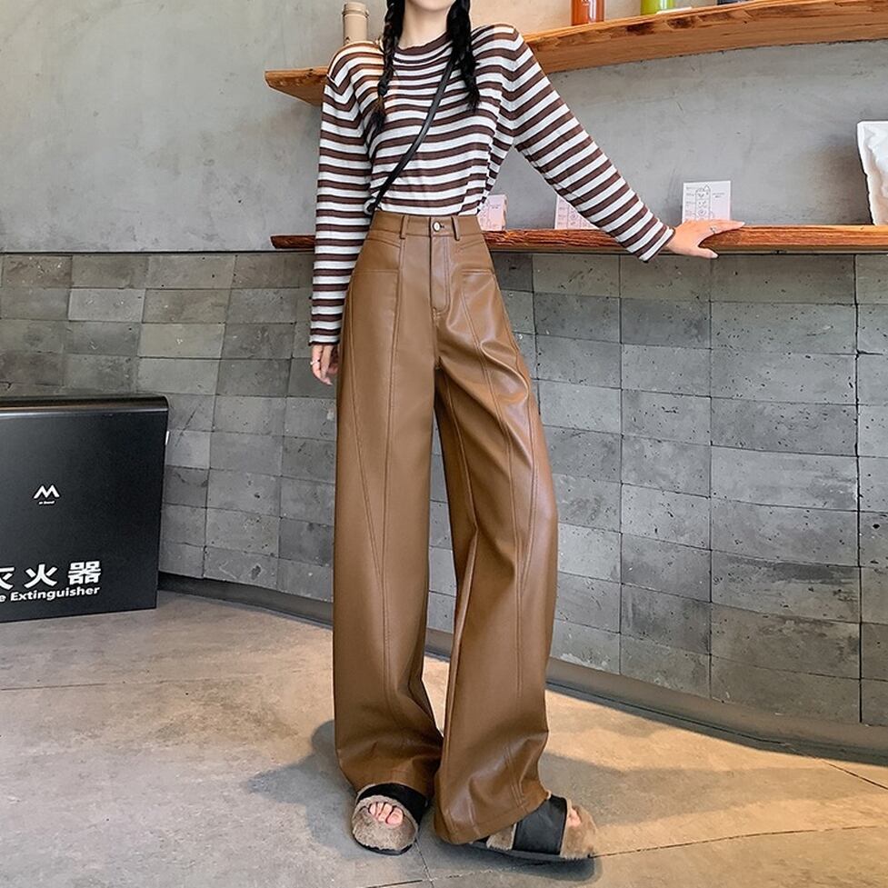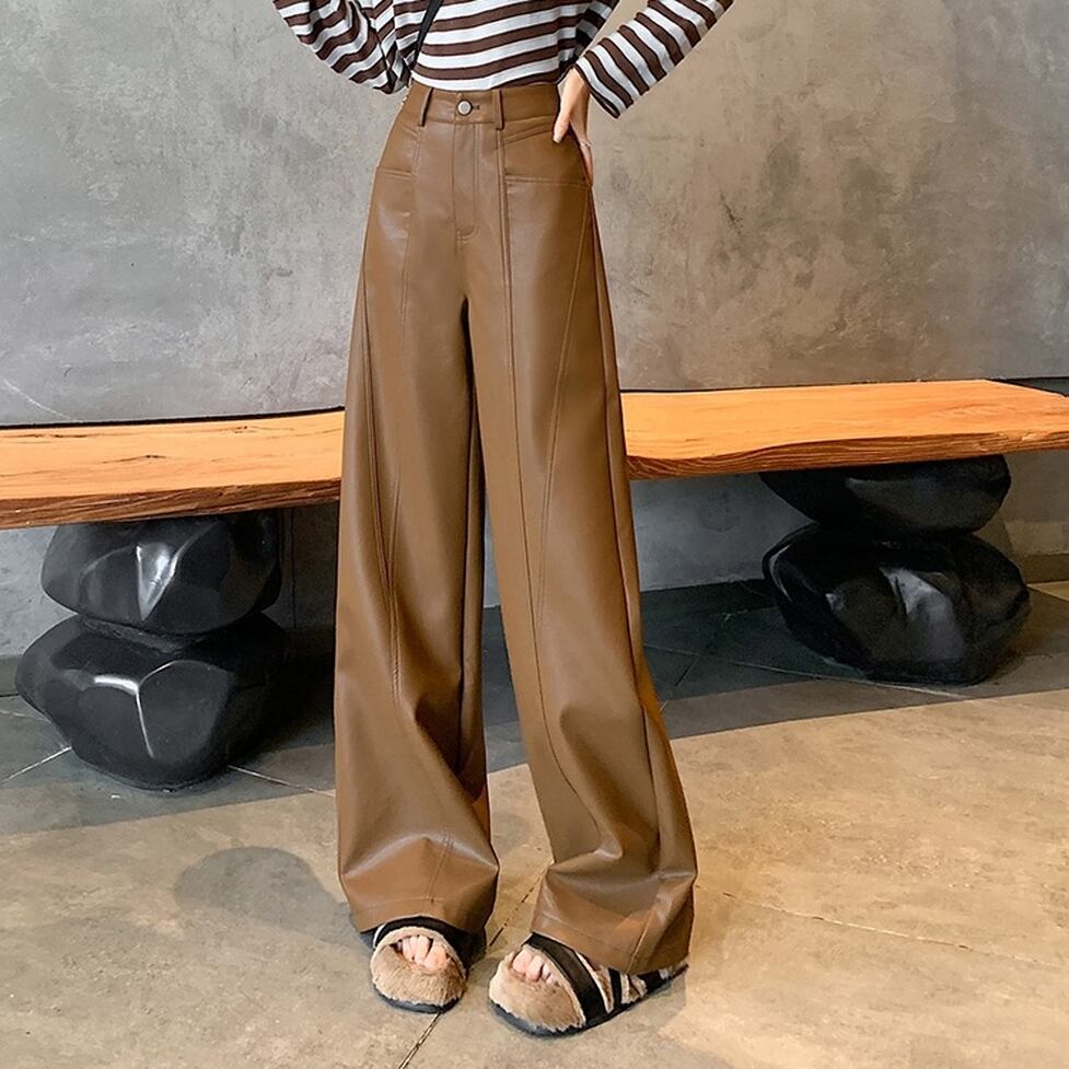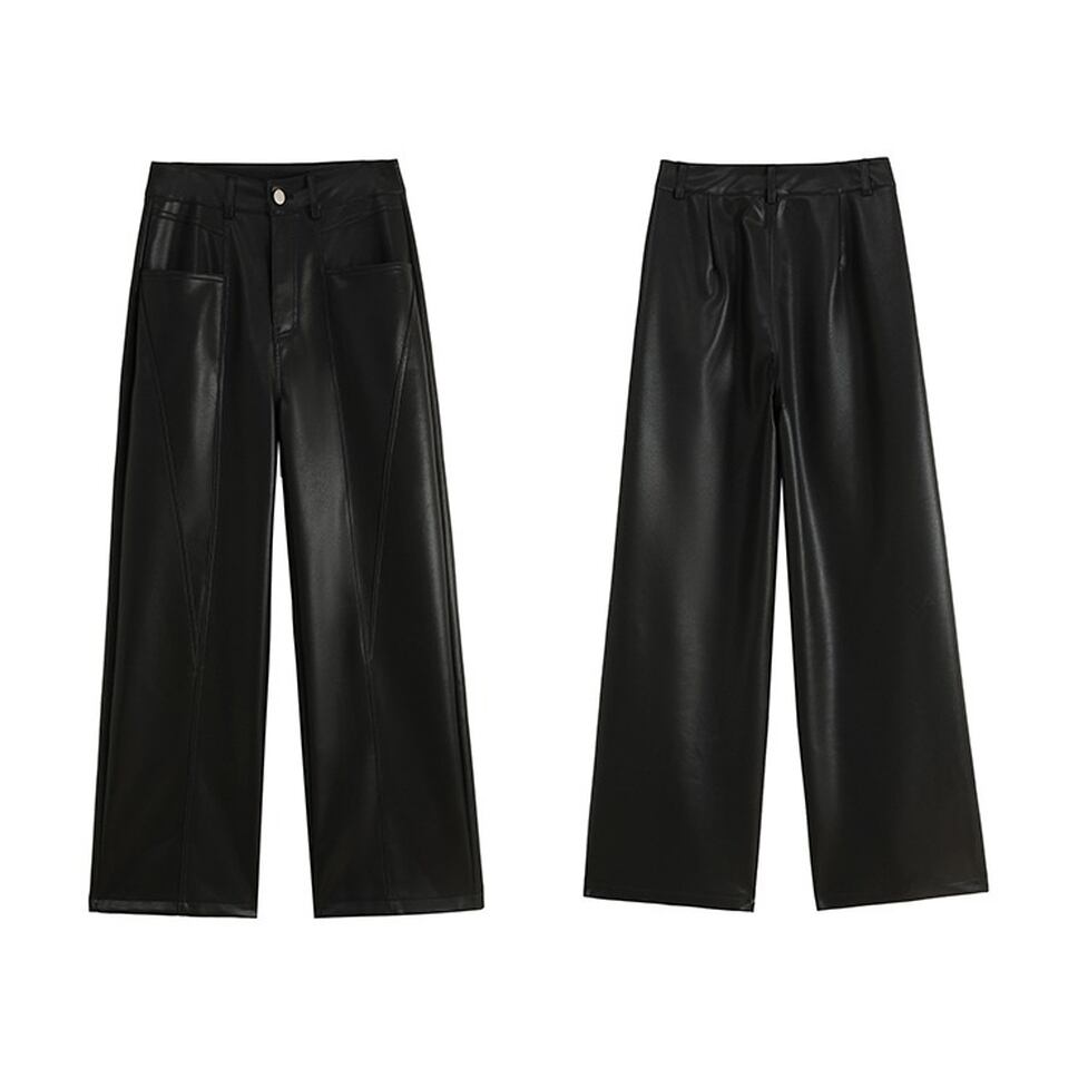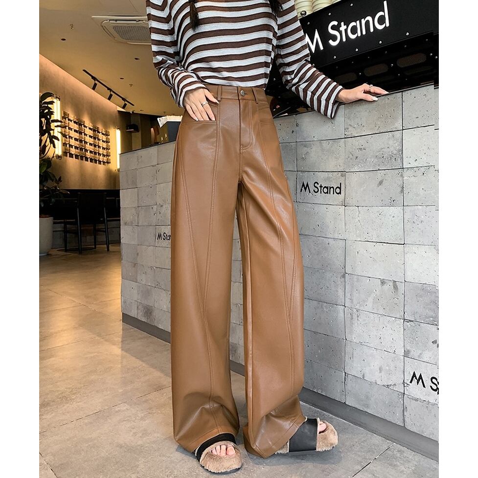 ステッチのライン使いが特徴のフェイクレザーワイドパンツ。カジュアルにもハンサムにも着られる。肩の力を抜いて着られるリアリティのあるアイテム。オシャレにこなれ感として作用