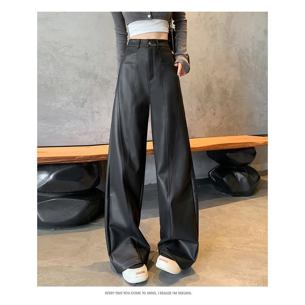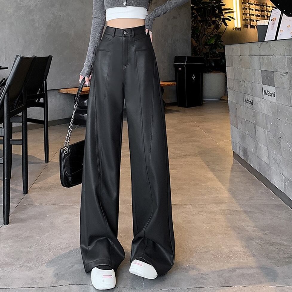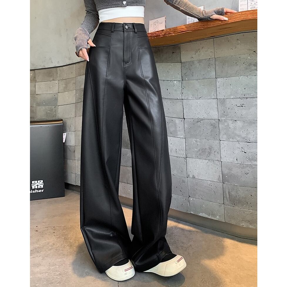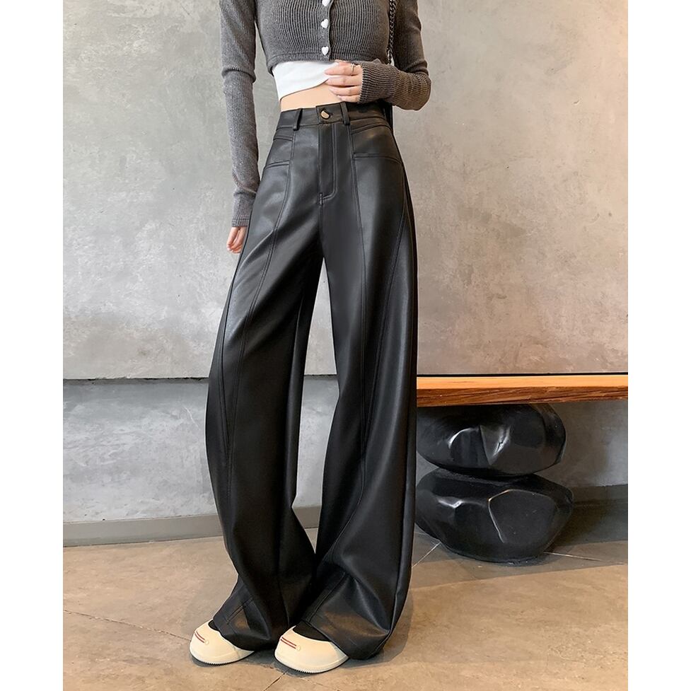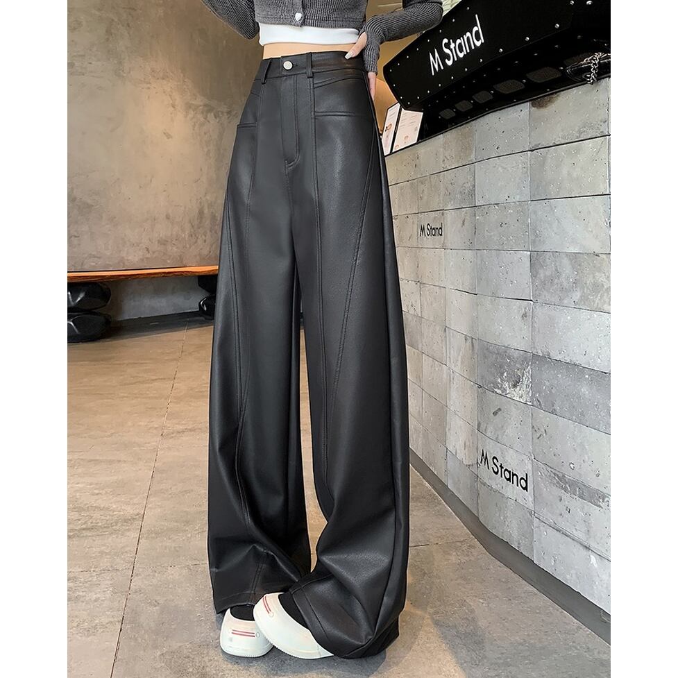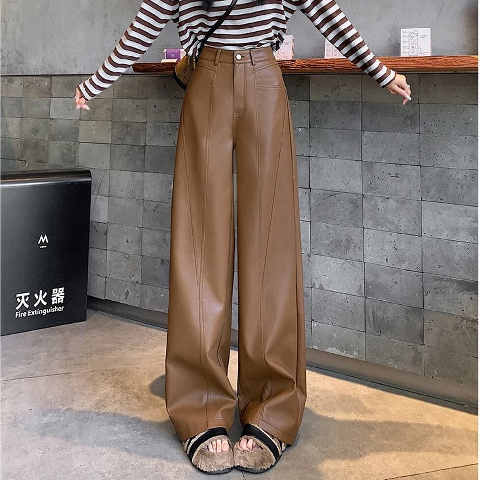 ステッチのライン使いが特徴のフェイクレザーワイドパンツ。カジュアルにもハンサムにも着られる。肩の力を抜いて着られるリアリティのあるアイテム。オシャレにこなれ感として作用