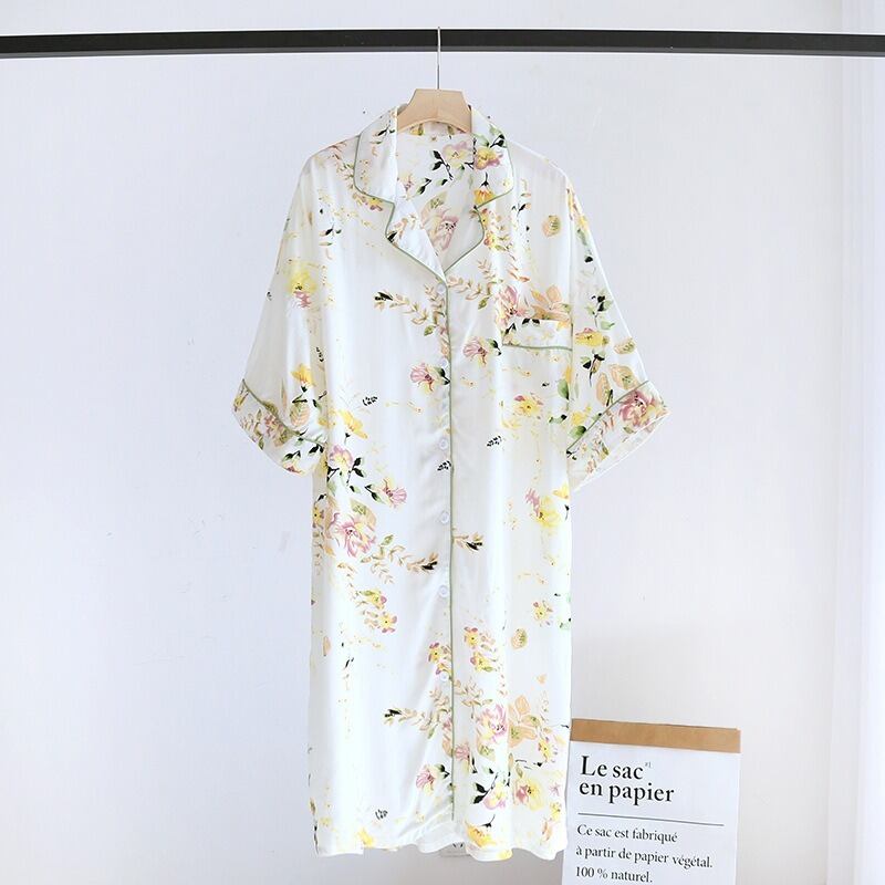 前開きデザインと膝丈のIラインシルエットが、すっきりとした印象を与え、ゆったりとした7分袖がリラックス感を演出します。