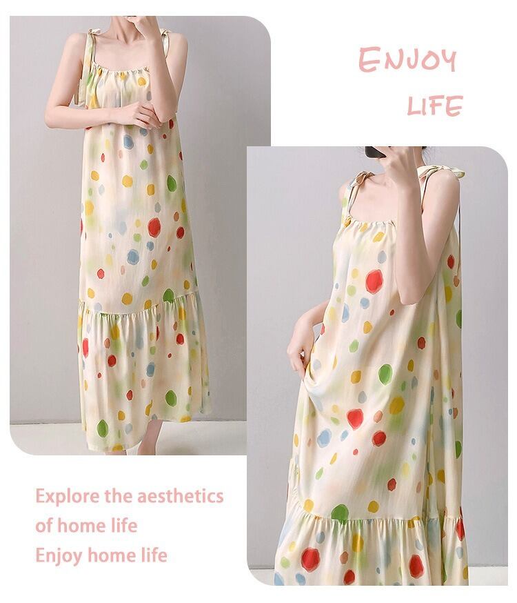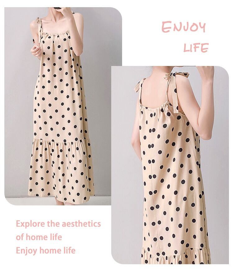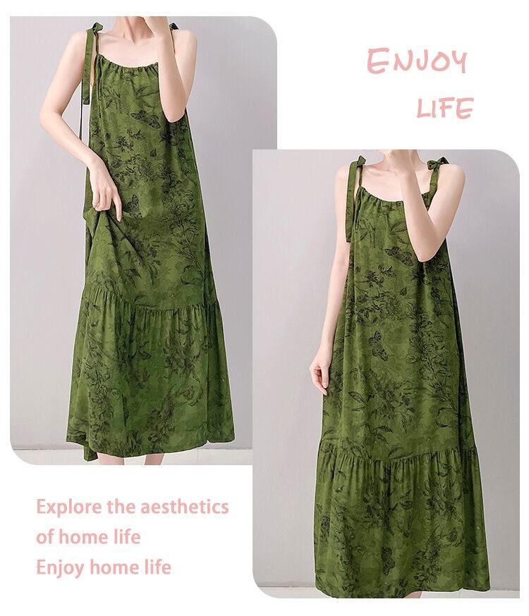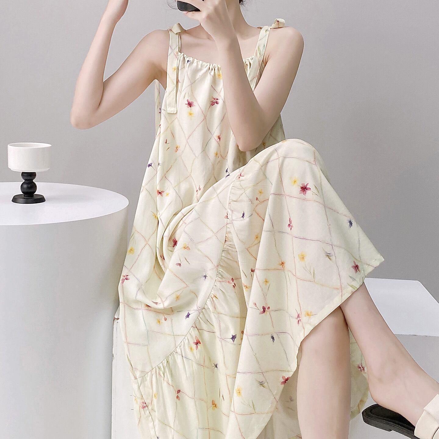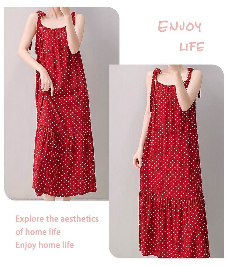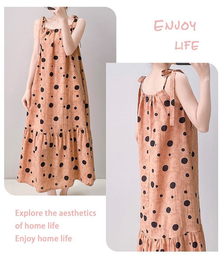 膝下のミディアム丈とフレアデザインが特徴で、涼しげなノースリーブとクルーネックが印象を引き立てます。
