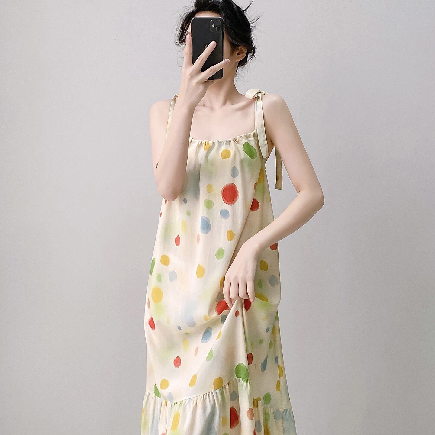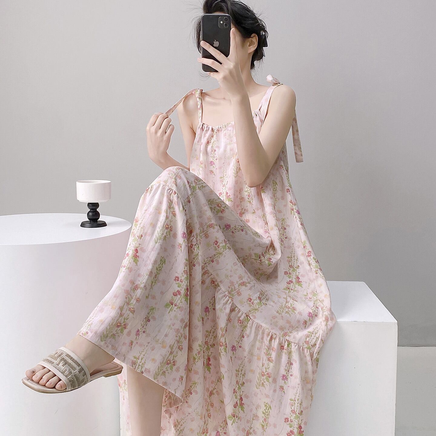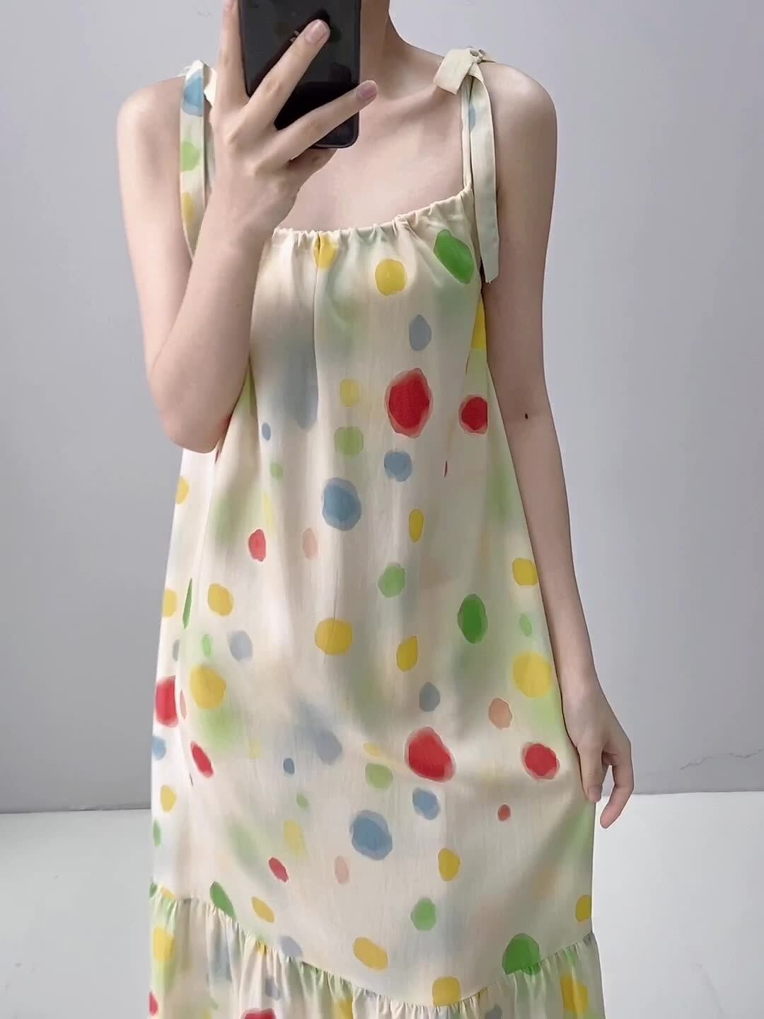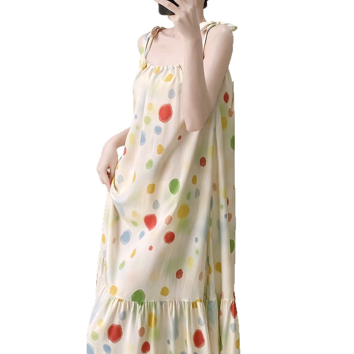 膝下のミディアム丈とフレアデザインが特徴で、涼しげなノースリーブとクルーネックが印象を引き立てます。
