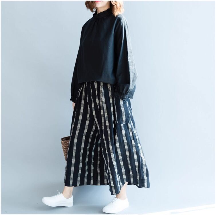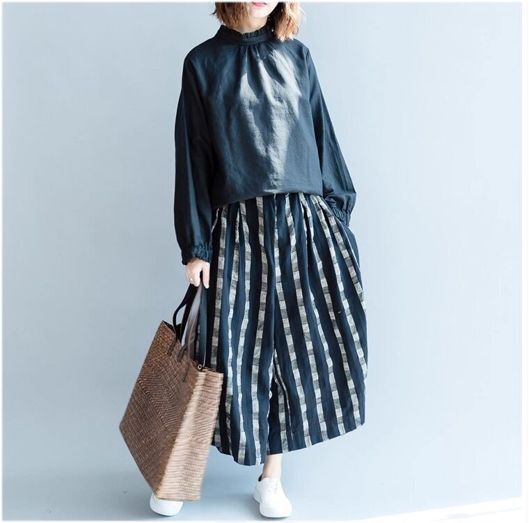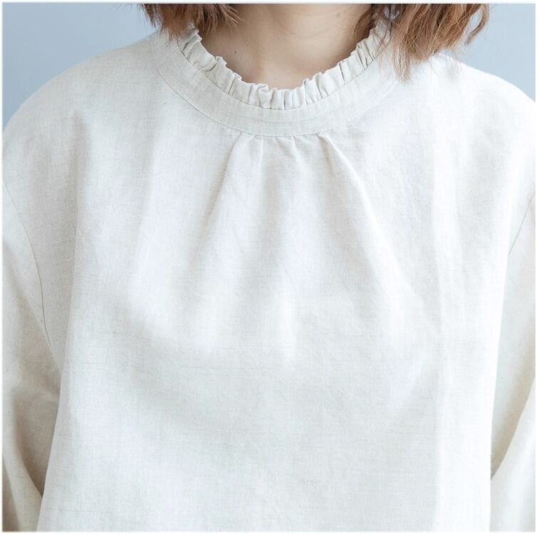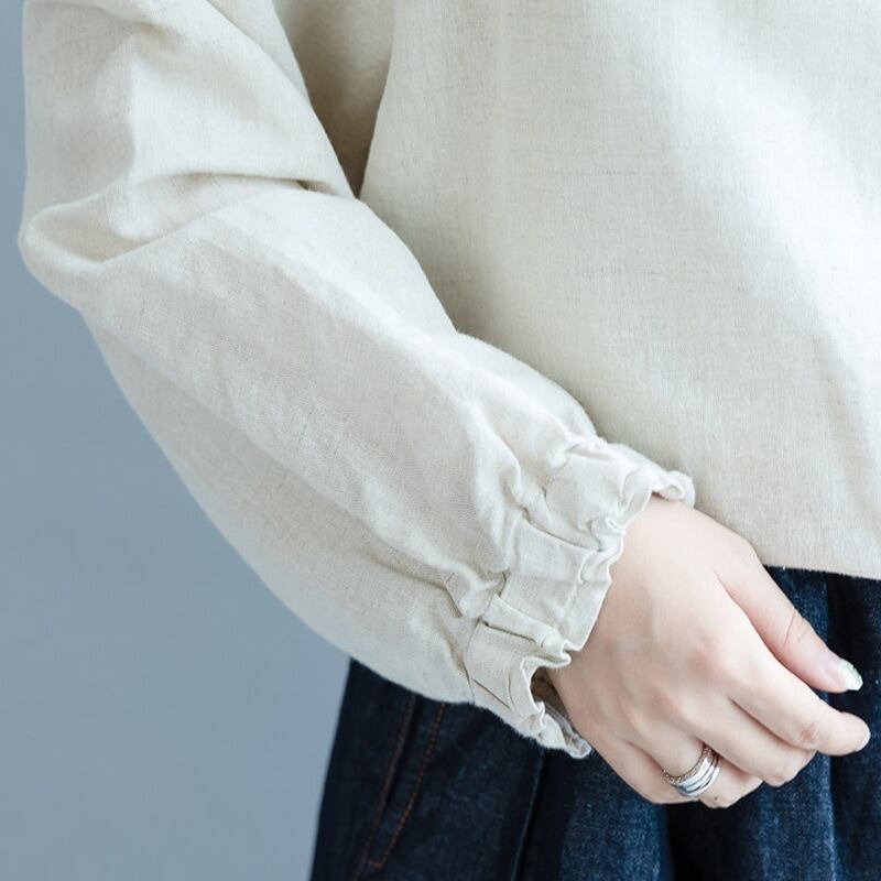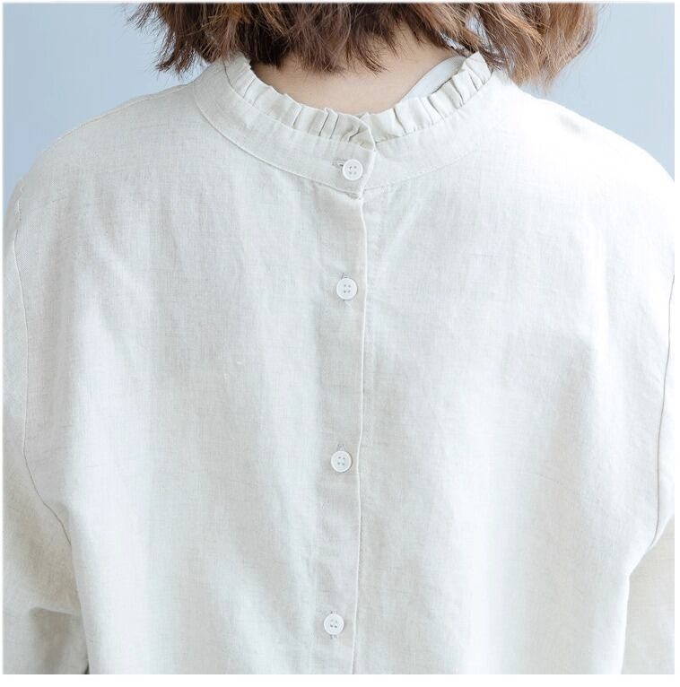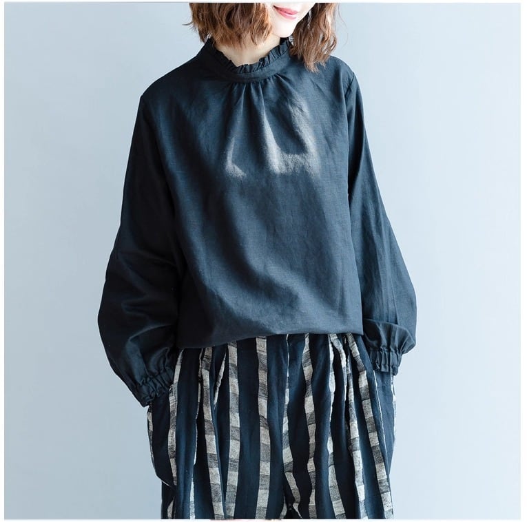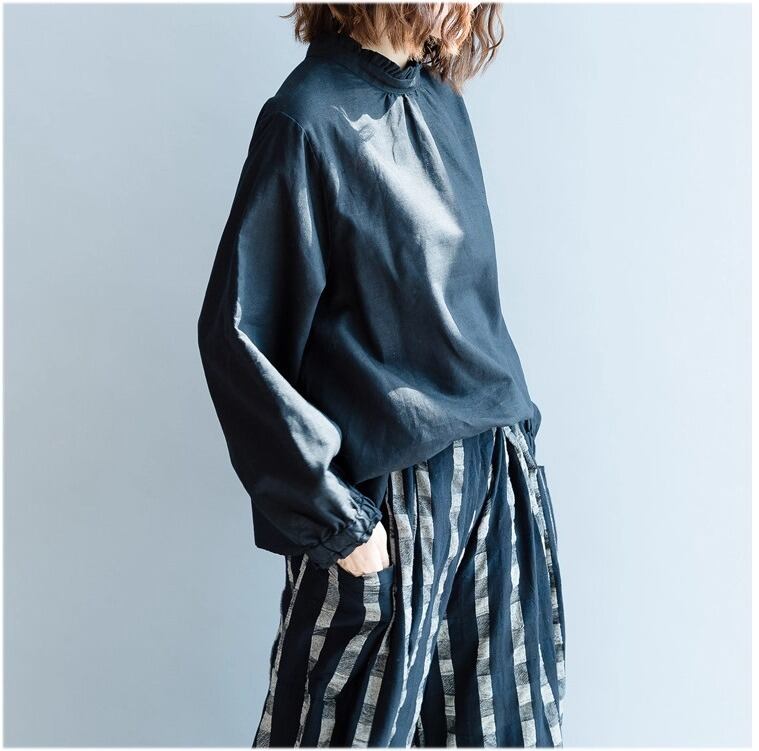 上品さと可愛らしさを兼ね備えたスタンドカラーの長袖ブラウス。