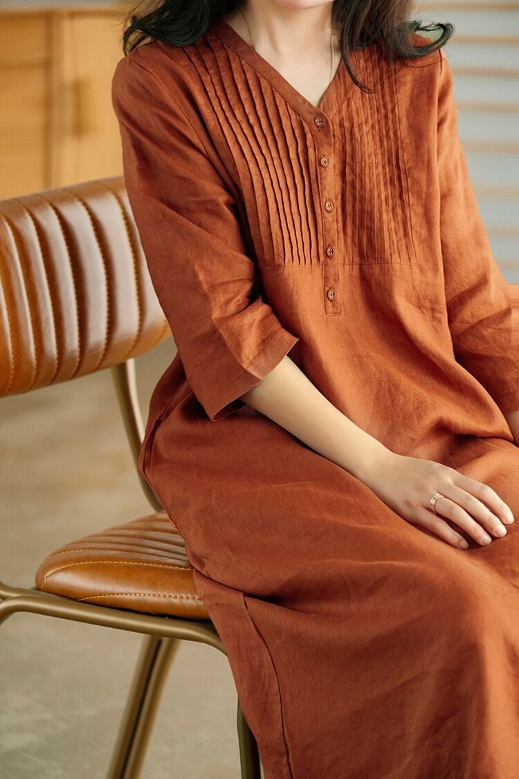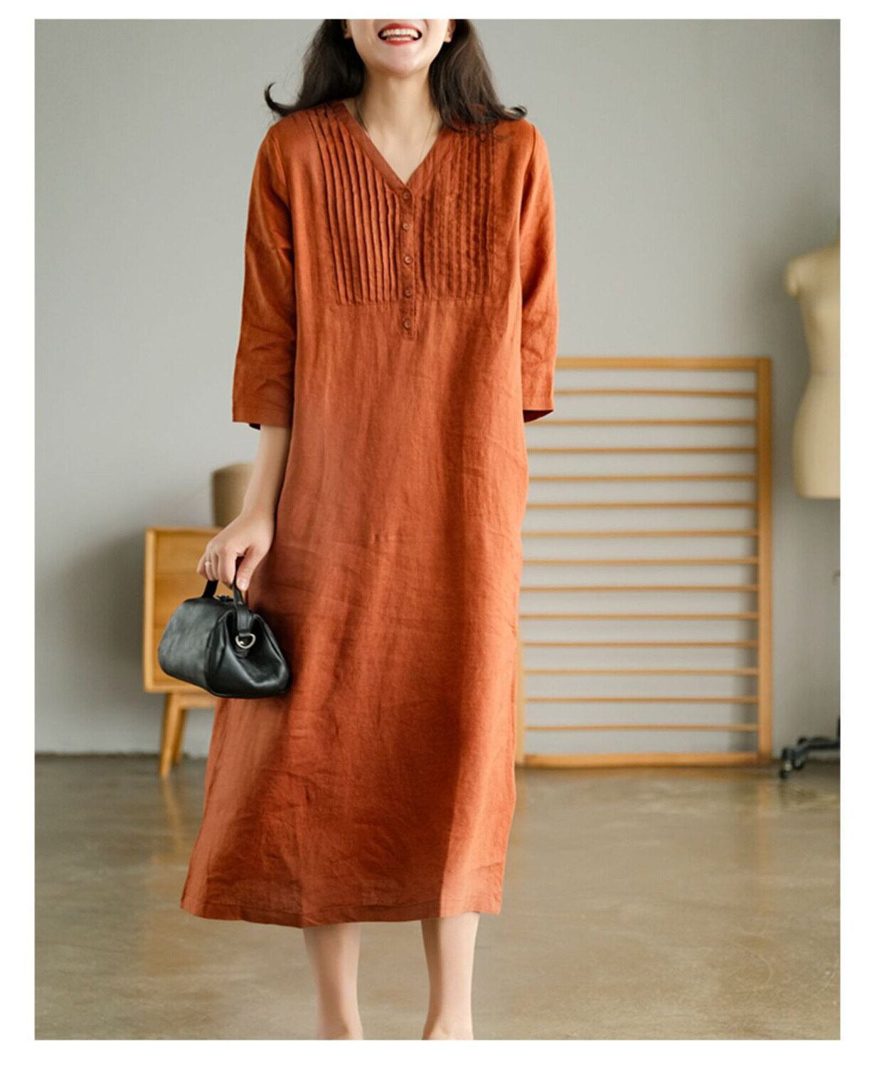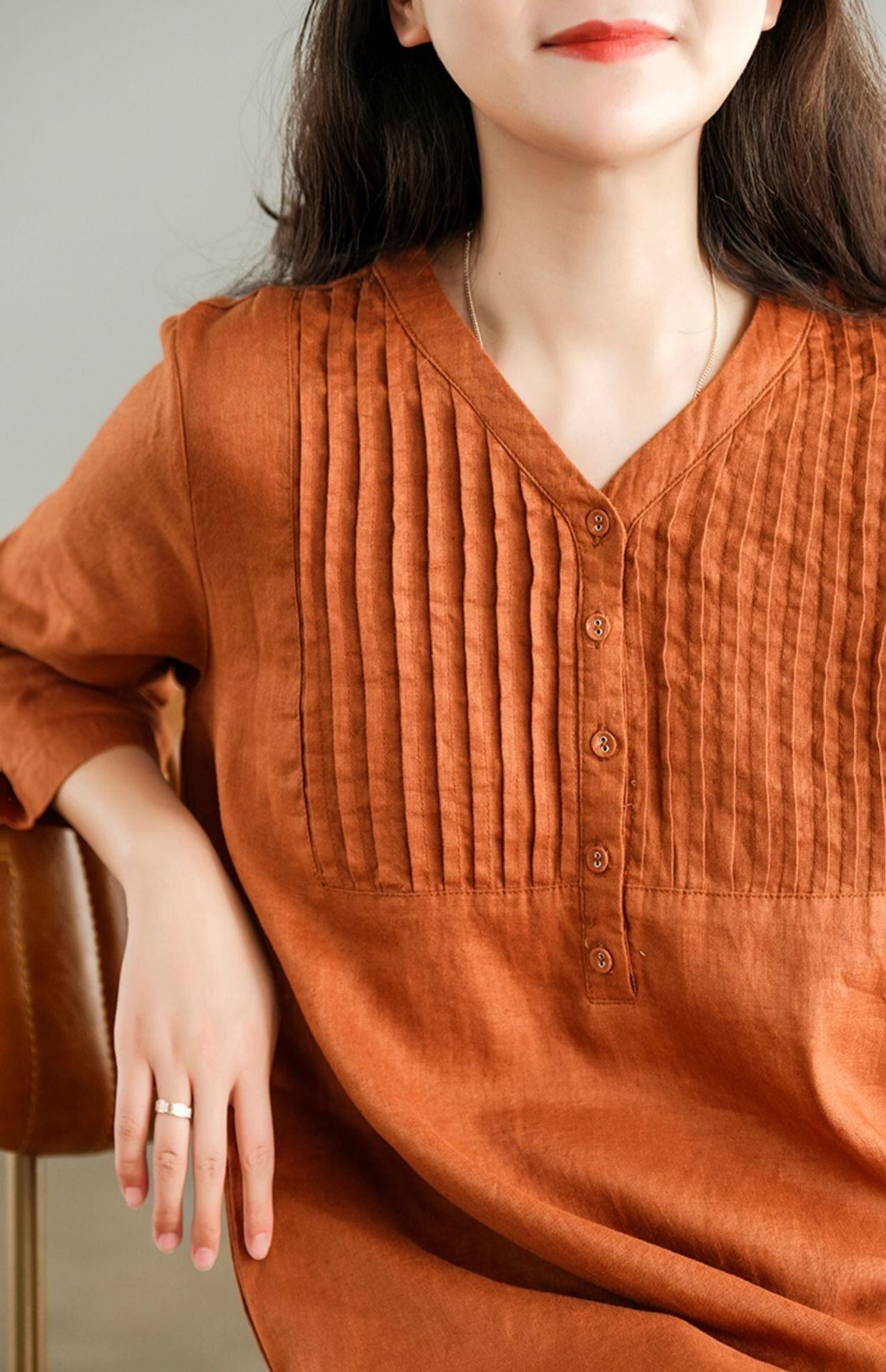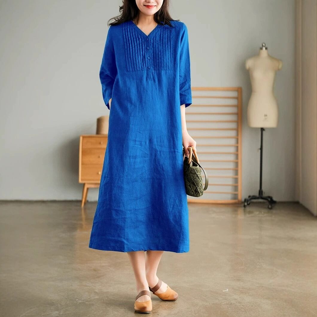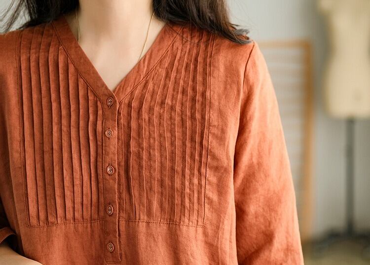 7分袖で季節を問わず着やすく、春夏は一枚で、秋口は羽織りを重ねて楽しめます。