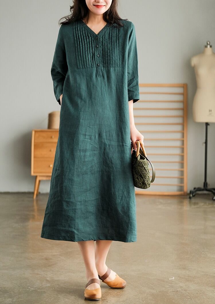 Vネック×ノーカラーデザインが首元をすっきりと見せ、フェミニンなプリーツ切り替えが自然なAラインを演出します。