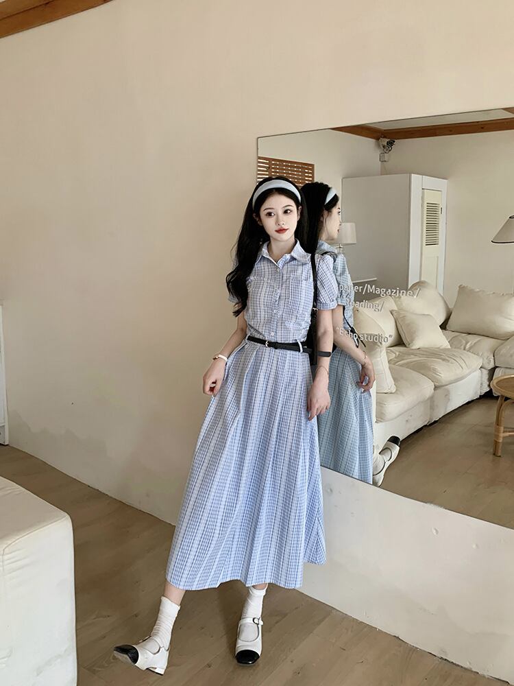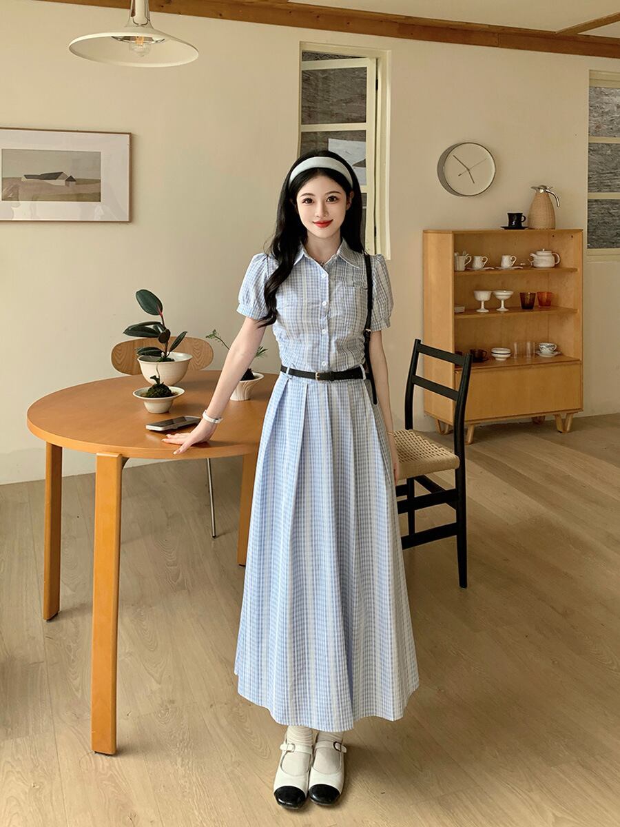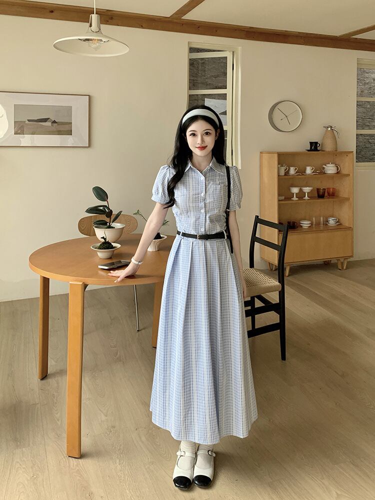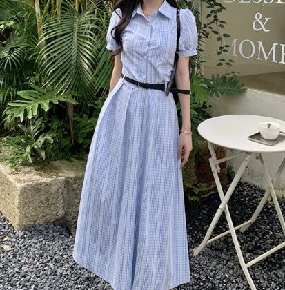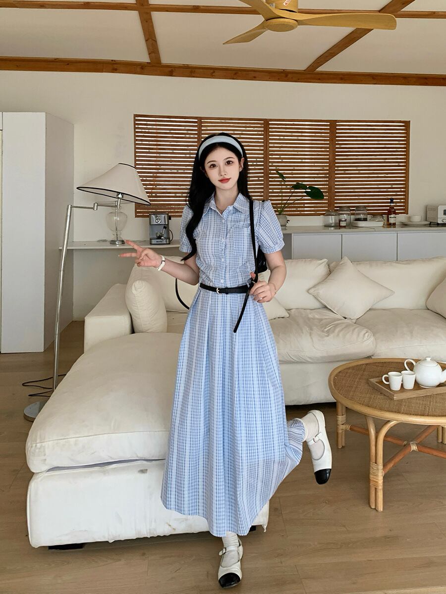 爽やかなブルーチェックが印象的なシャツワンピース。上品な襟付きデザインとロング丈が、清楚でクラシカルな雰囲気を演出します。ウエストベルトでメリハリをつければ、スタイルアップ効果も抜群。