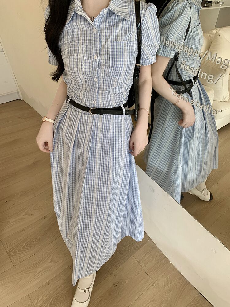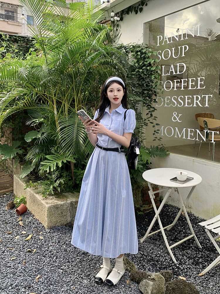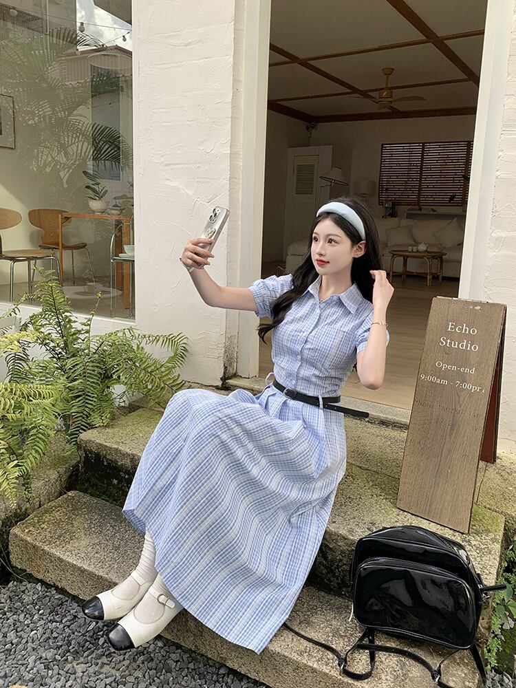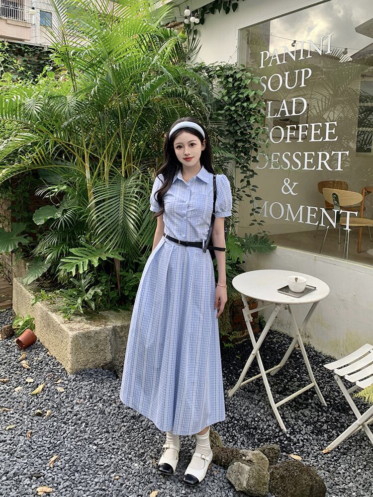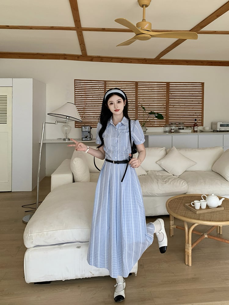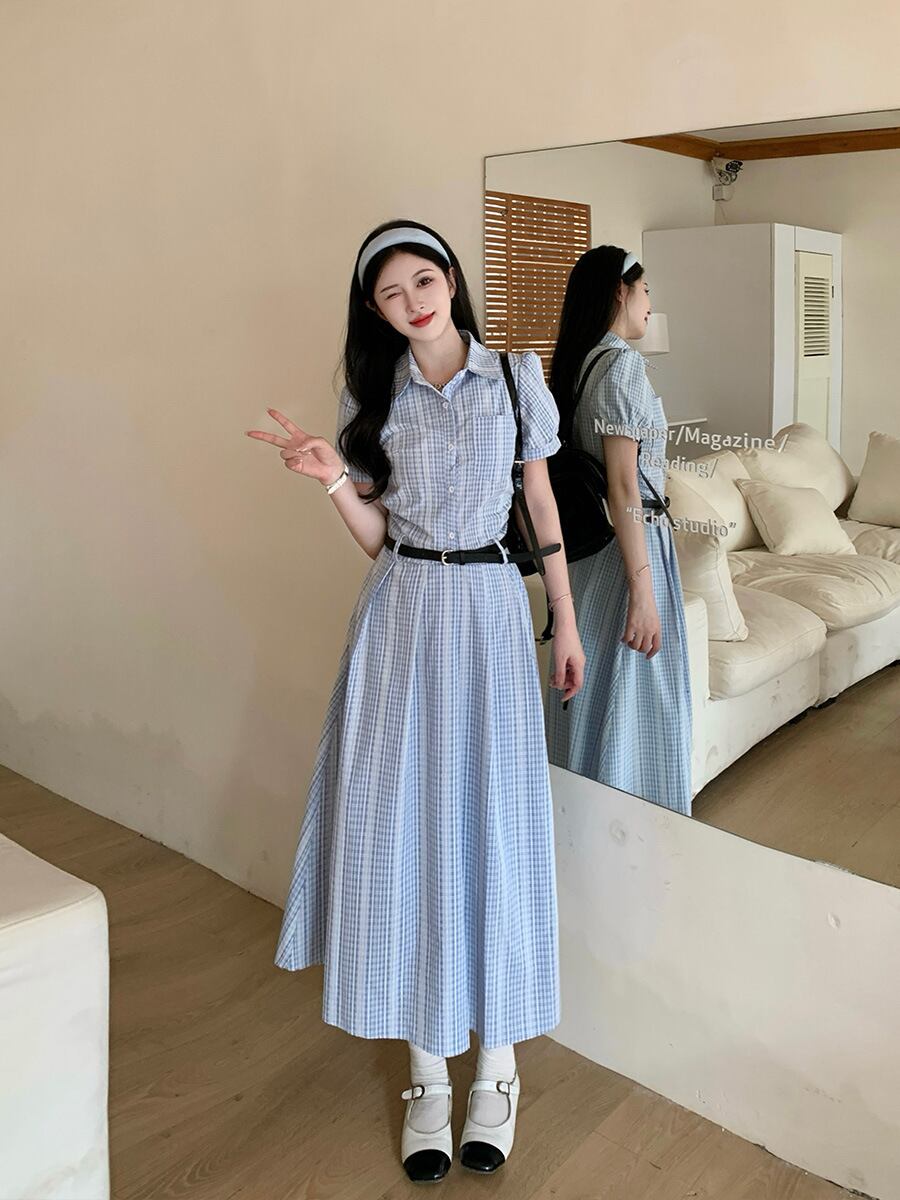 爽やかなブルーチェックが印象的なシャツワンピース。上品な襟付きデザインとロング丈が、清楚でクラシカルな雰囲気を演出します。ウエストベルトでメリハリをつければ、スタイルアップ効果も抜群。