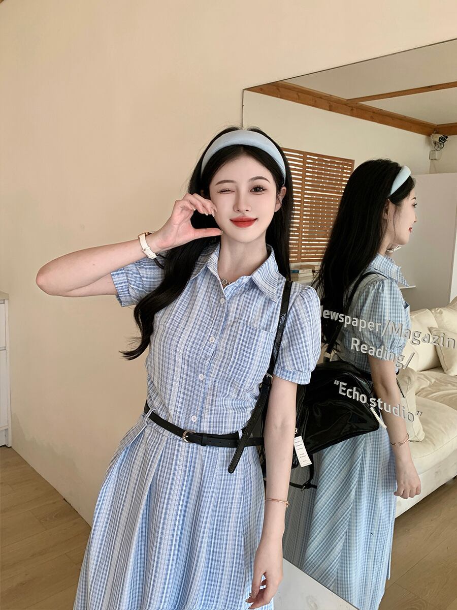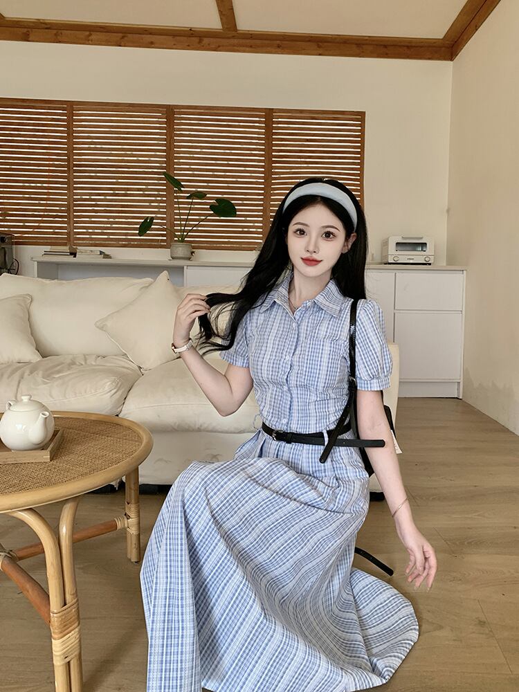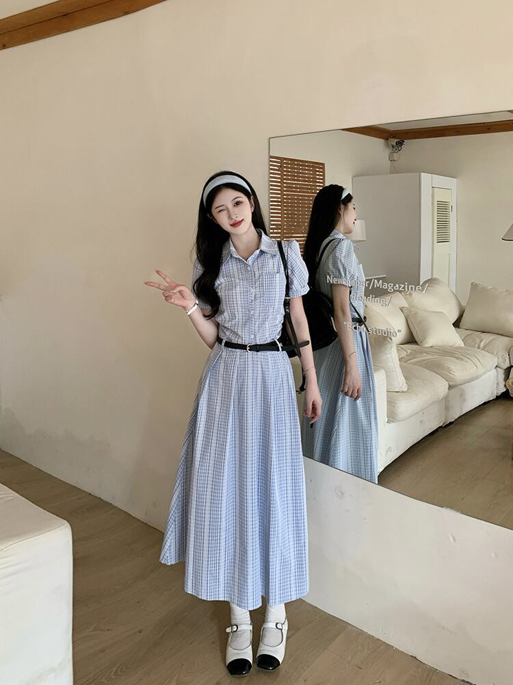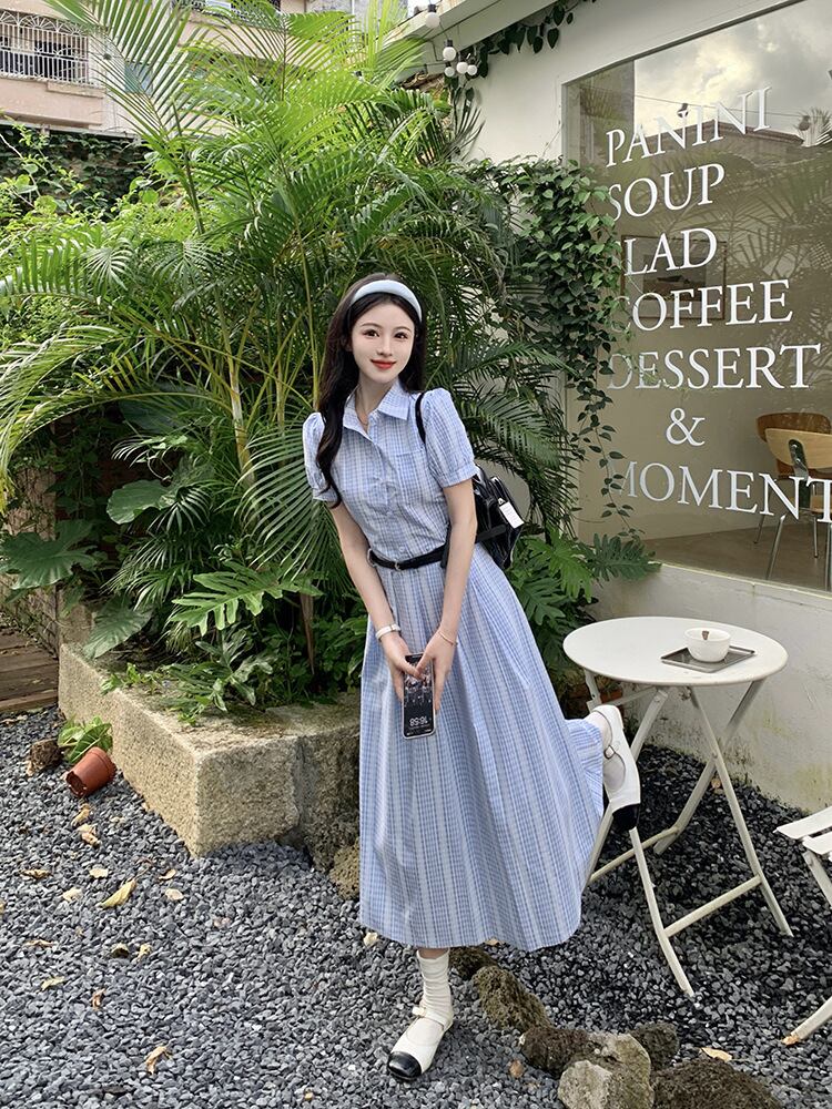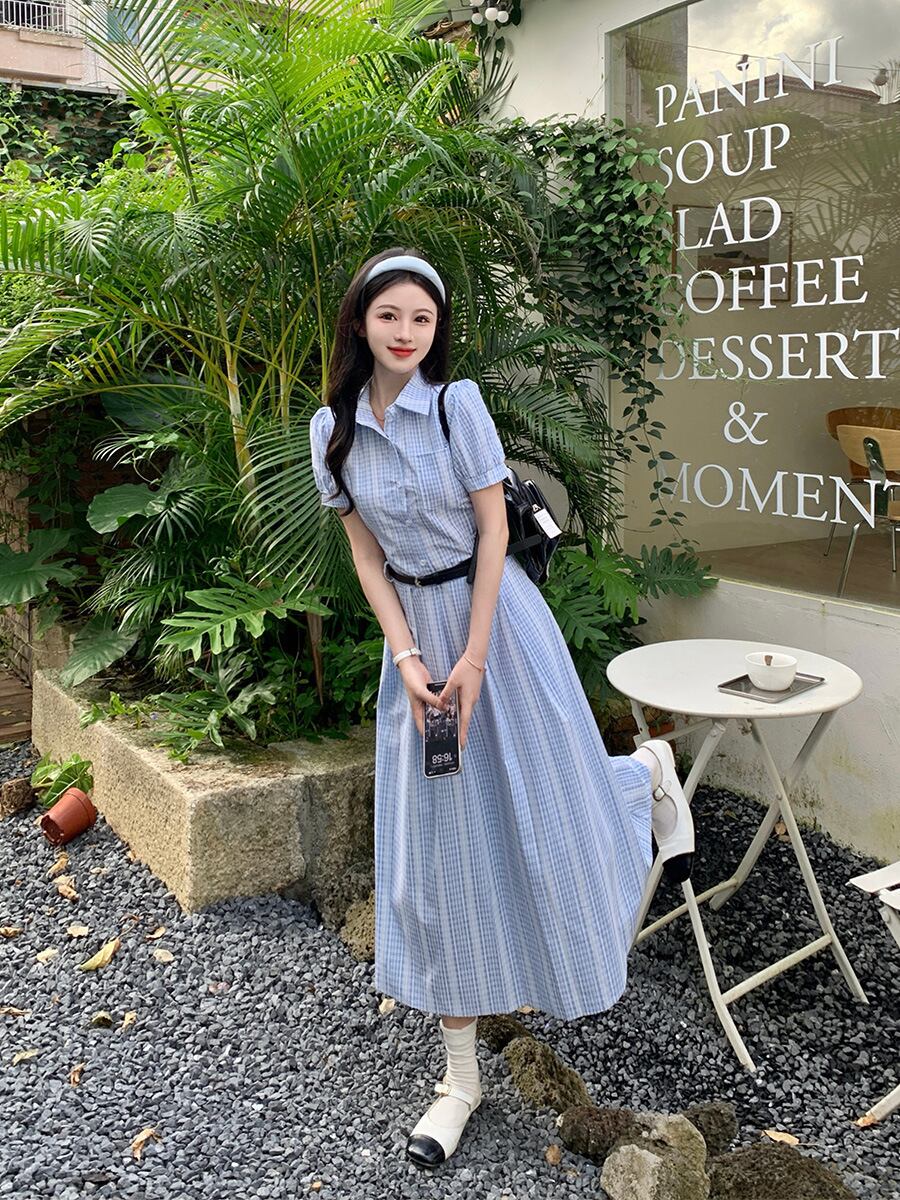 爽やかなブルーチェックが印象的なシャツワンピース。上品な襟付きデザインとロング丈が、清楚でクラシカルな雰囲気を演出します。ウエストベルトでメリハリをつければ、スタイルアップ効果も抜群。