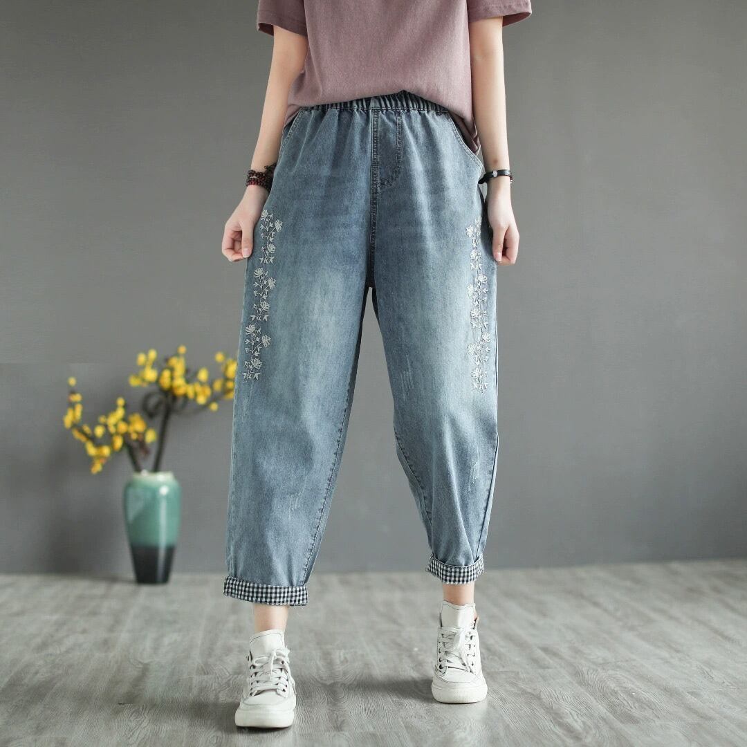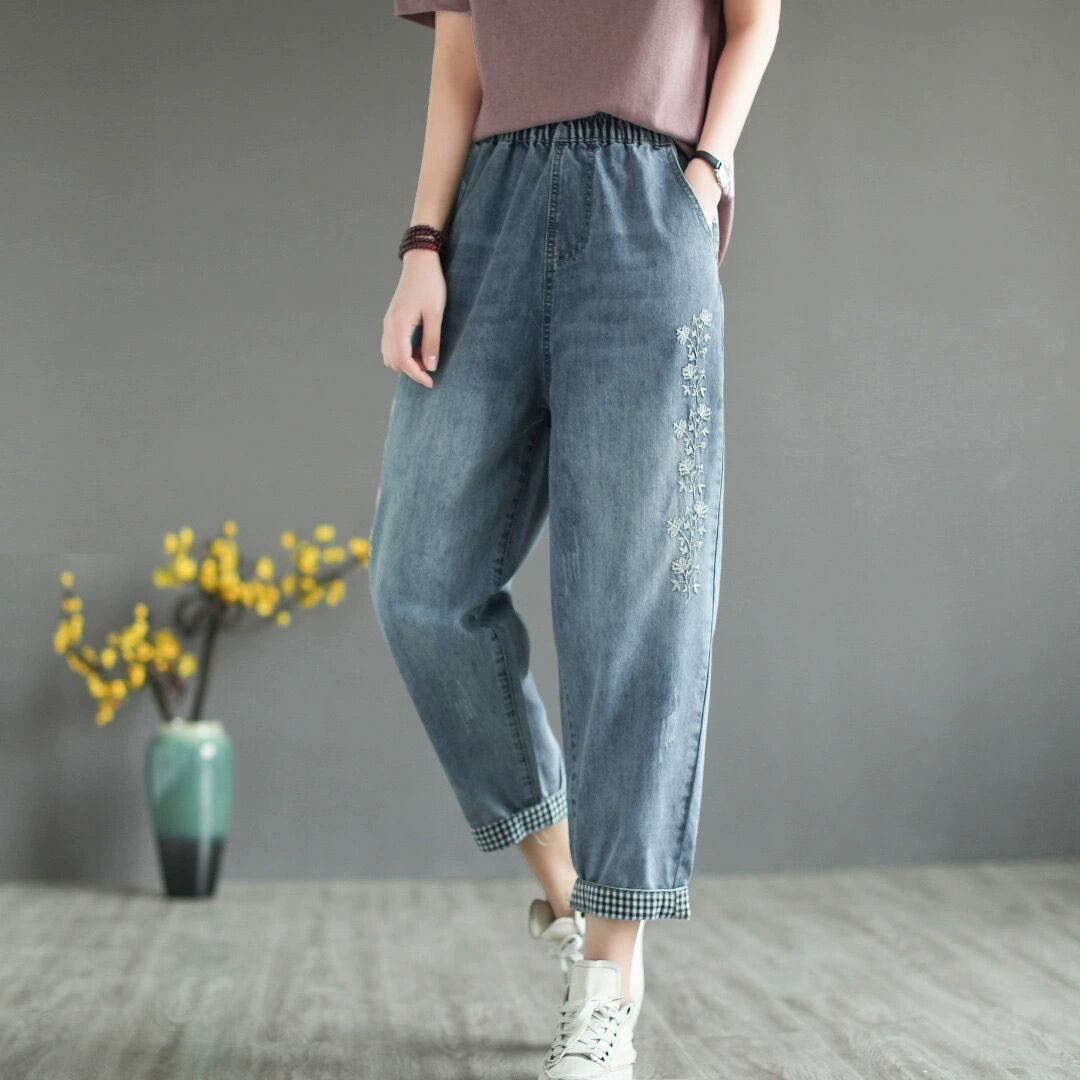花柄刺繍やロールアップの切り替えデザインがほどよいアクセントとなり、シンプルなトップスと合わせるだけでこなれ感のある着こなしが完成します。